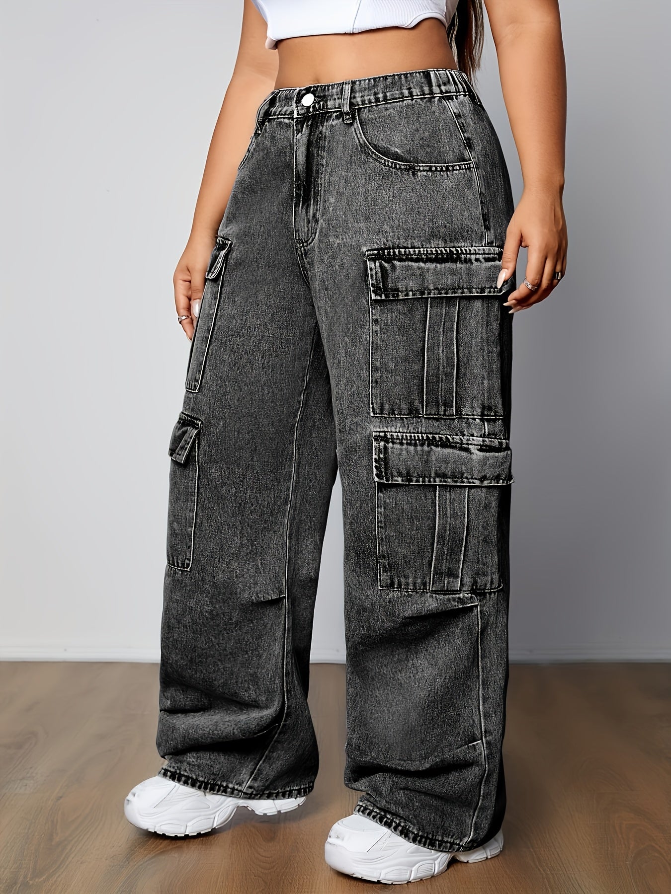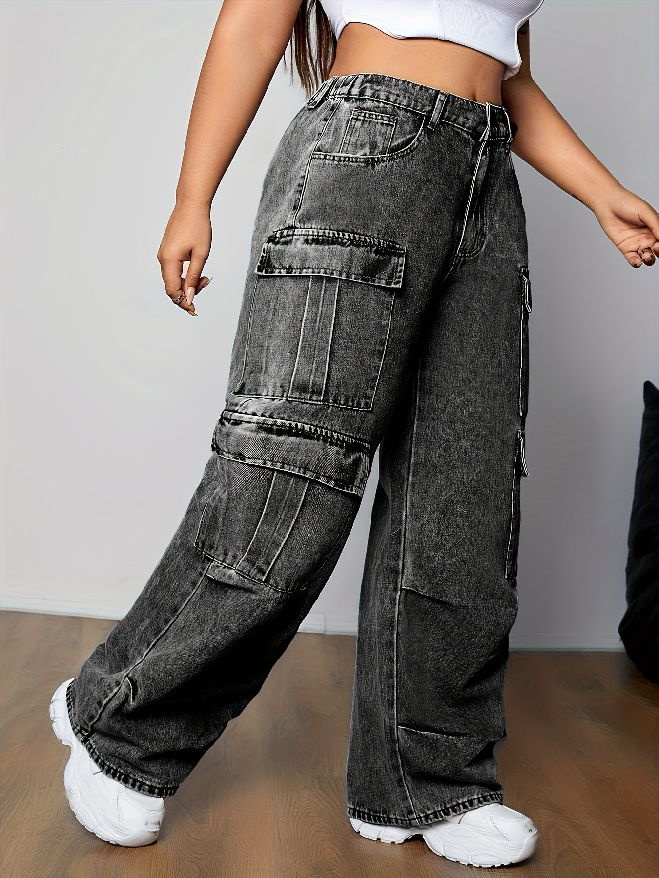 Women's Plus Size Casual Cargo Jeans with Multiple Pockets - High-Rise, Loose Fit Denim in Black, Light Blue & White, Perfect for Casual Attire, Casual Denim Wear | Utility Style Pants | Smooth Texture Jeans