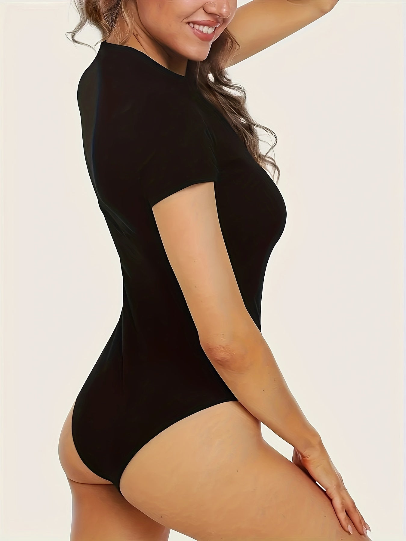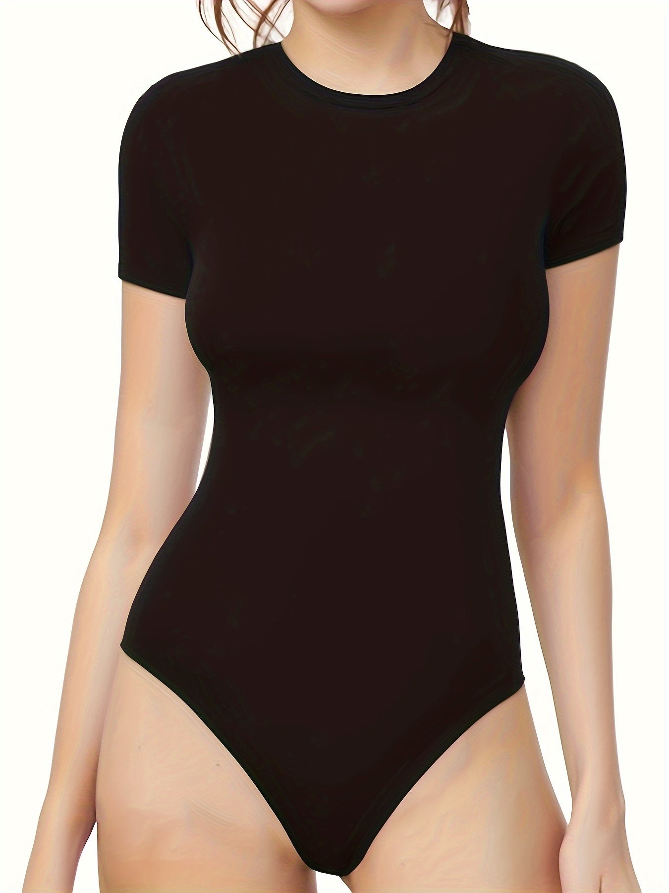 Women's Slim Fit Short Sleeve Bodysuit - Soft Stretch Round Neck, Black Solid Color, Smooth Polyester-Spandex Blend, All-Season Comfort Jumpsuit