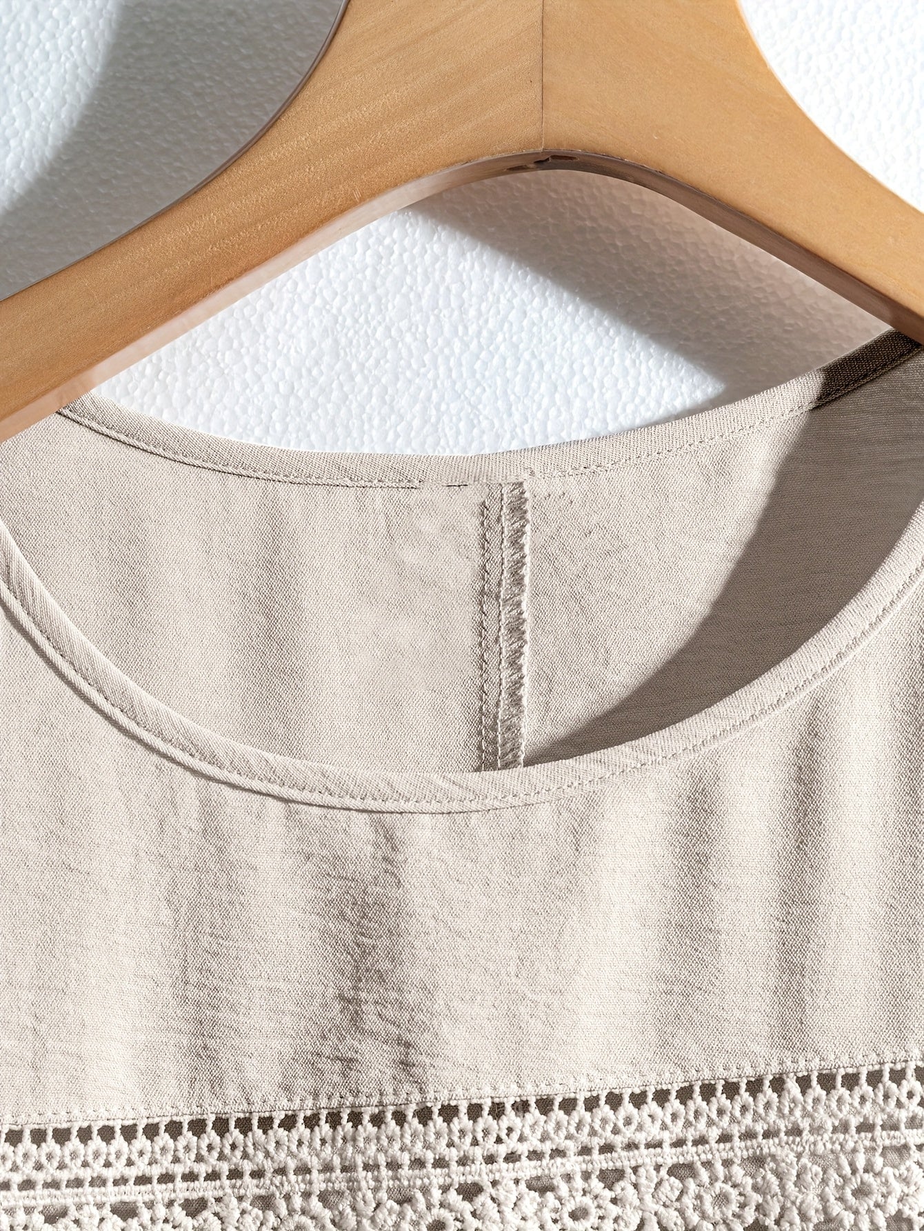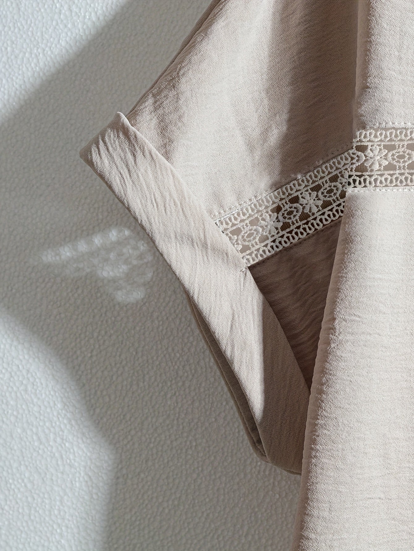 Women's Solid Color Contrast Lace Short Sleeve Top and Wide Leg Pants Casual Two-Piece Set