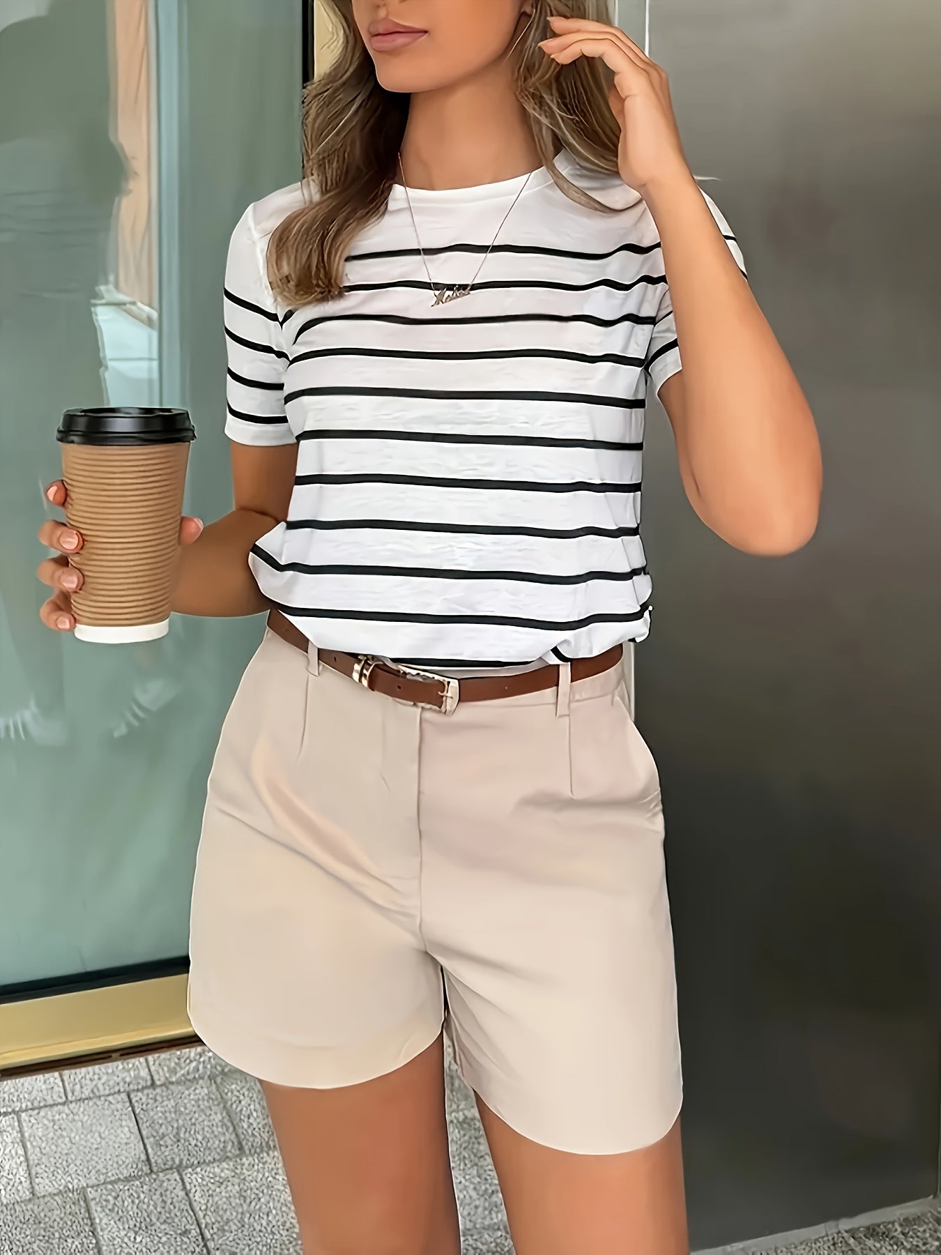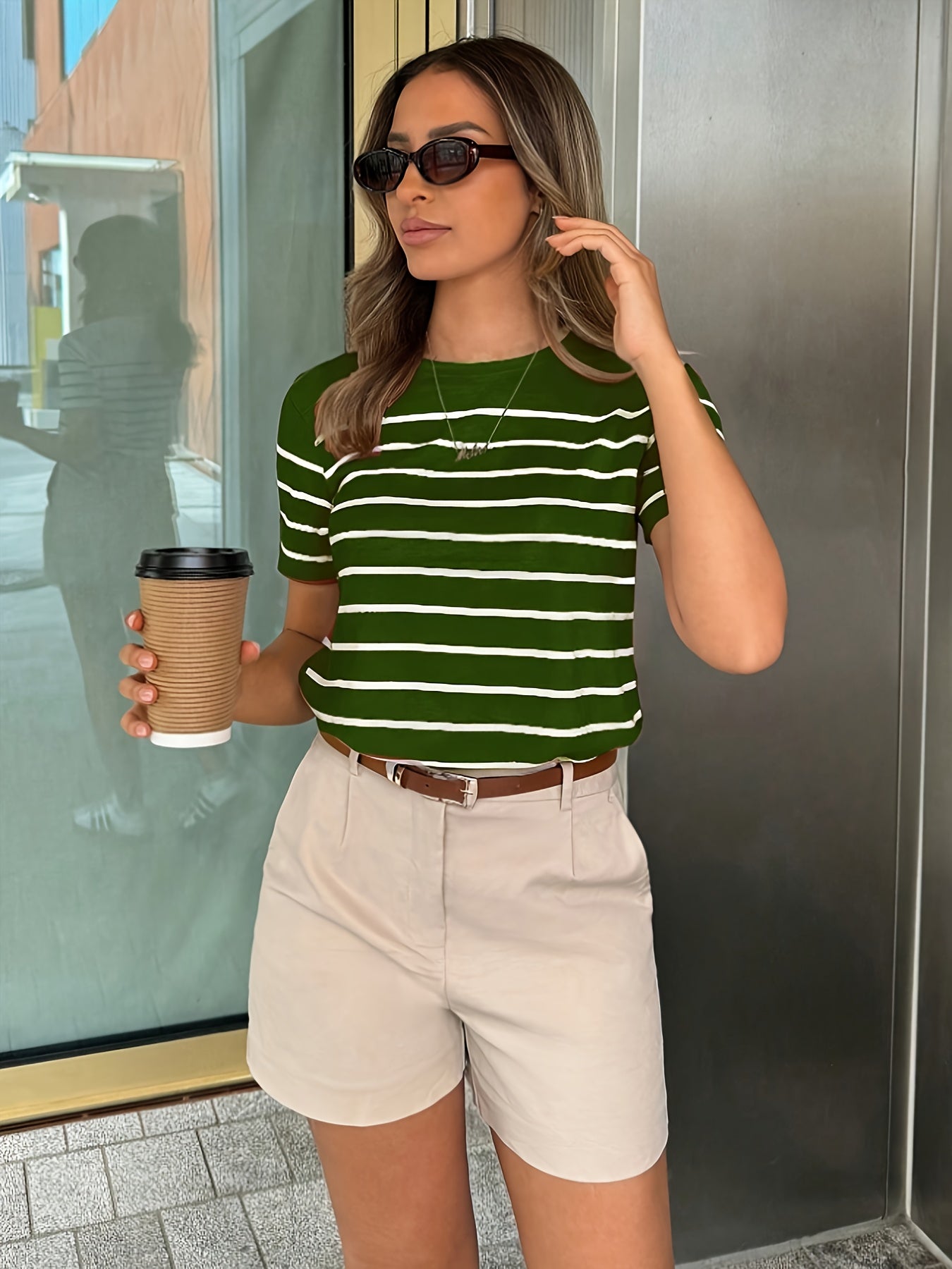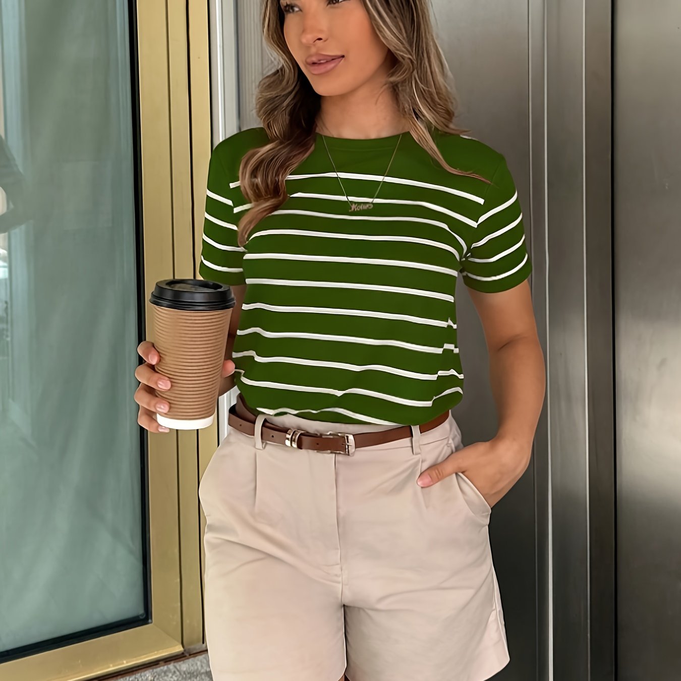 Women'S Y2K Green & White Striped T-Shirt - Casual, Versatile Top for Spring/Summer, Short Sleeve, Round Neck, Casual Attire | Casual Style | Glossy Finish