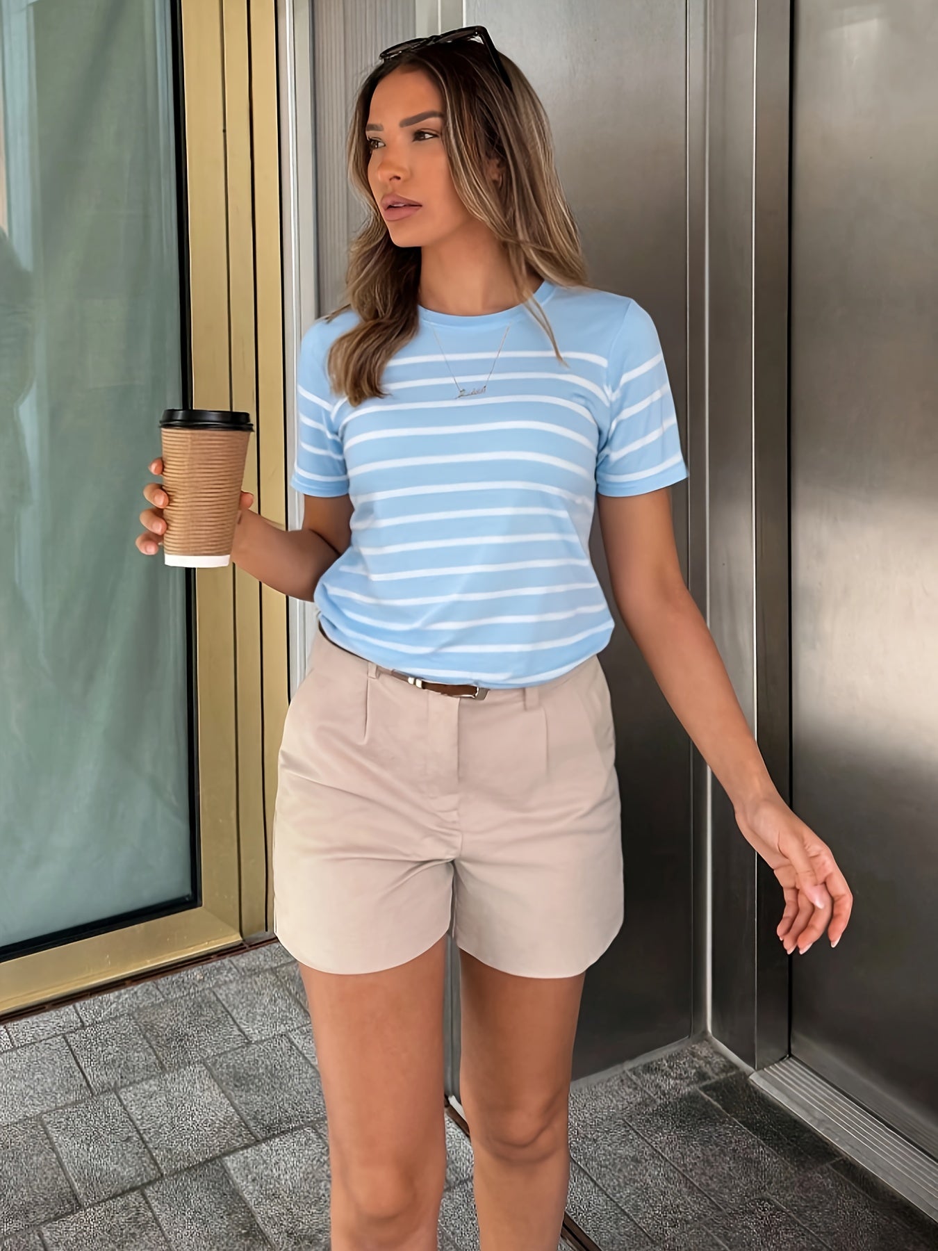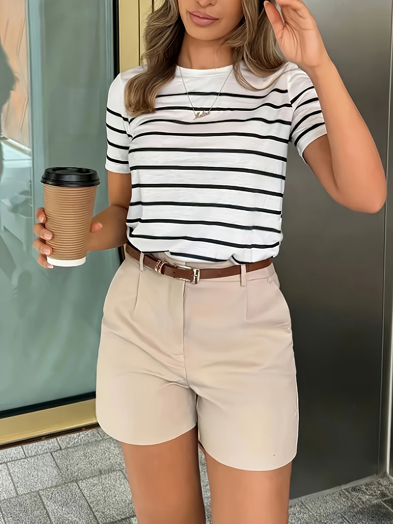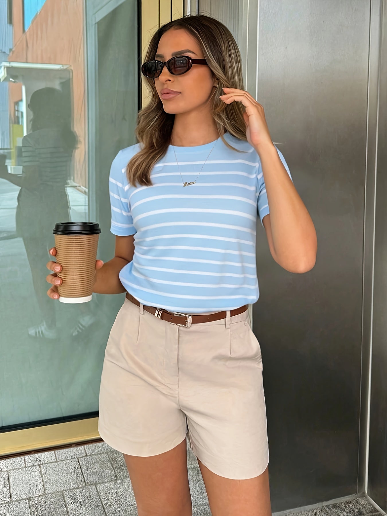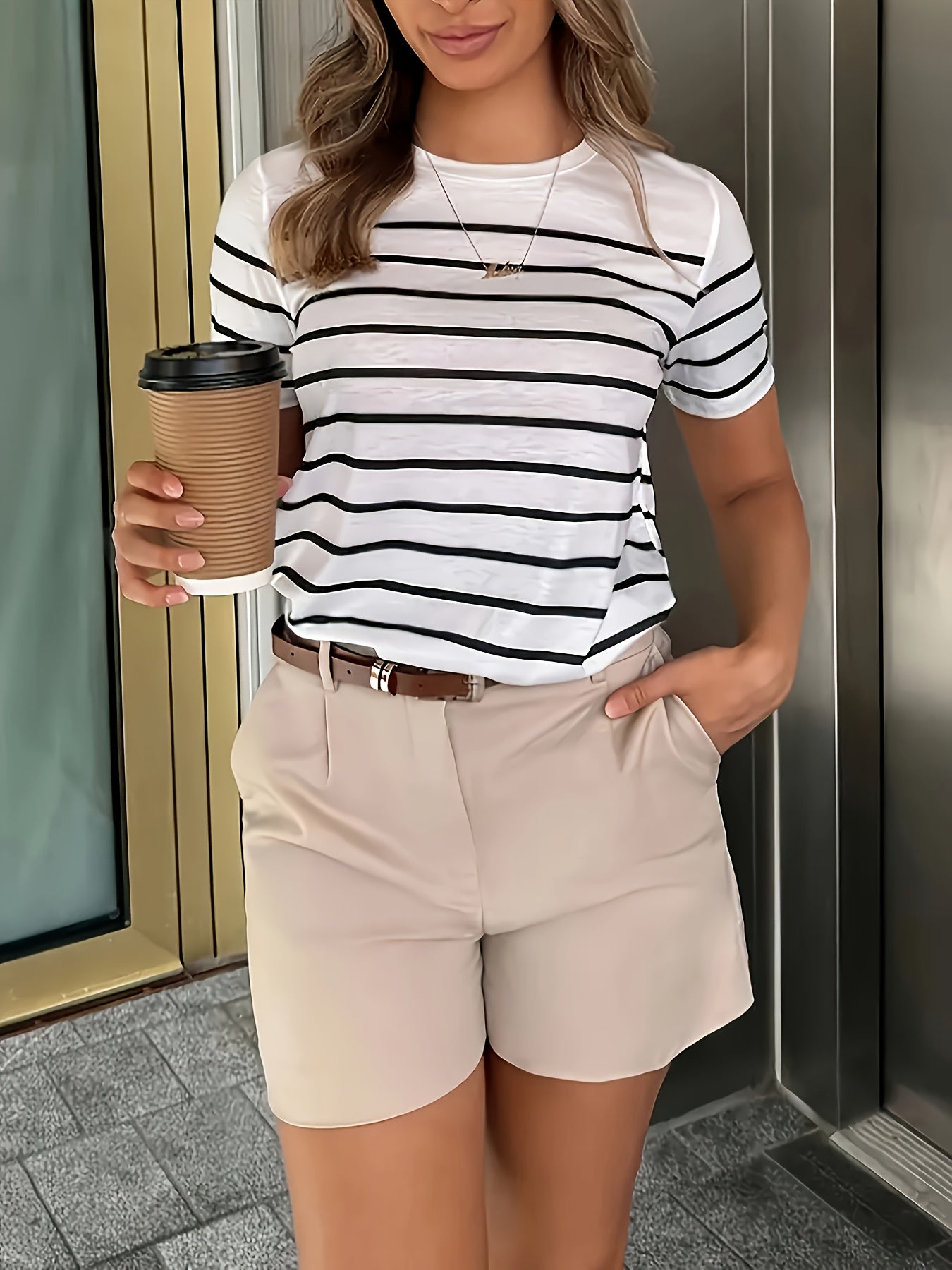 Women'S Y2K Green & White Striped T-Shirt - Casual, Versatile Top for Spring/Summer, Short Sleeve, Round Neck, Casual Attire | Casual Style | Glossy Finish