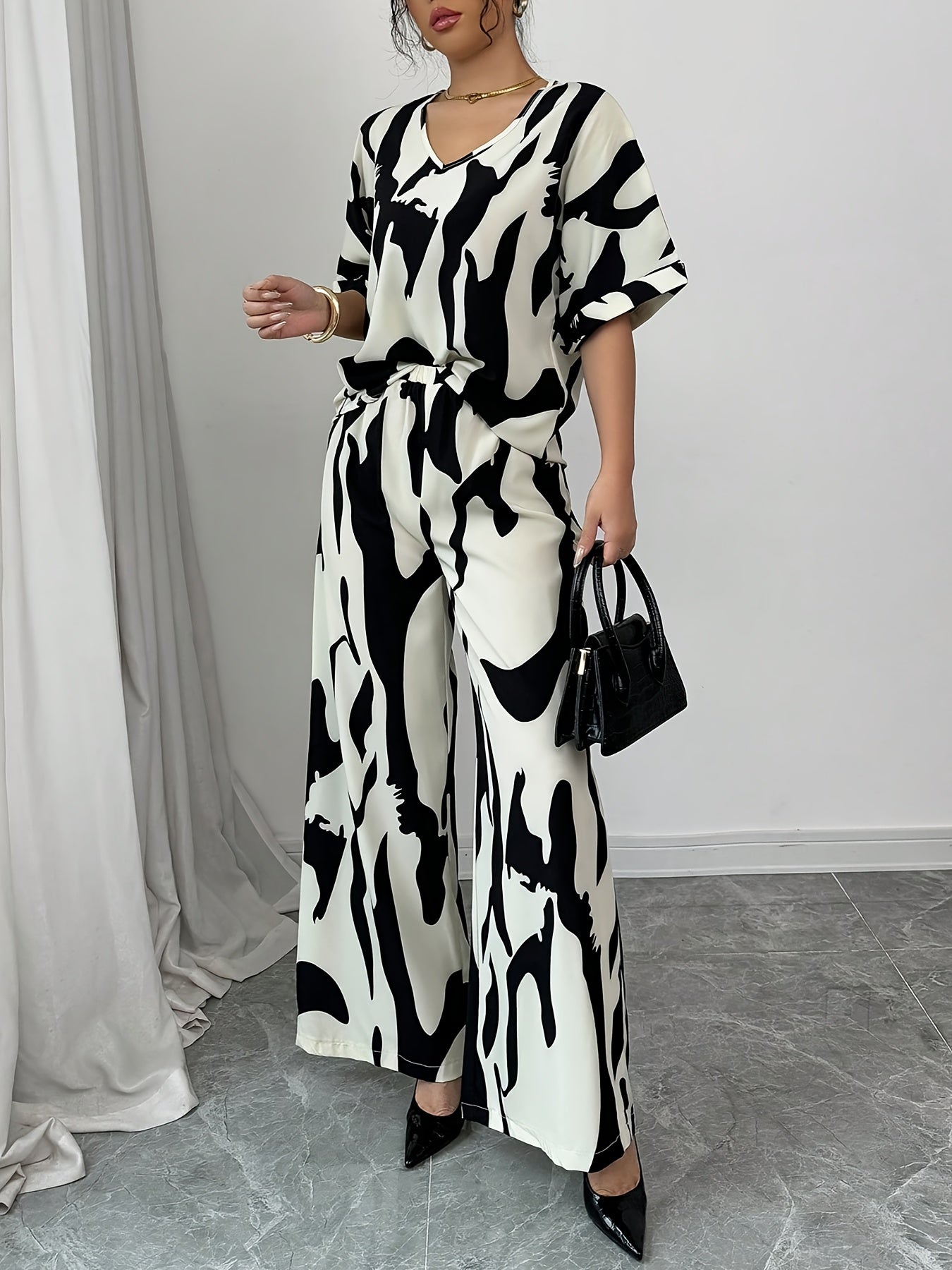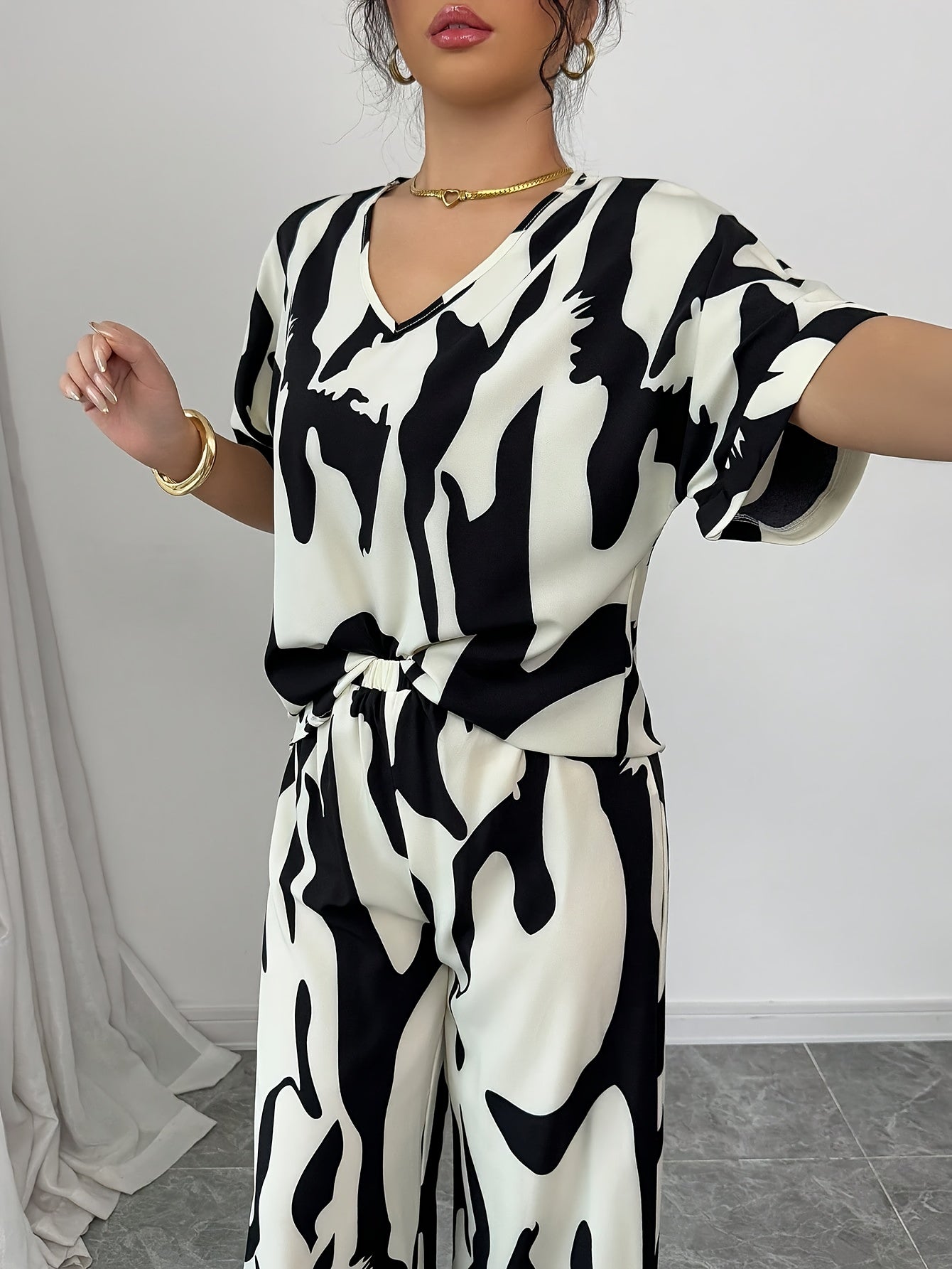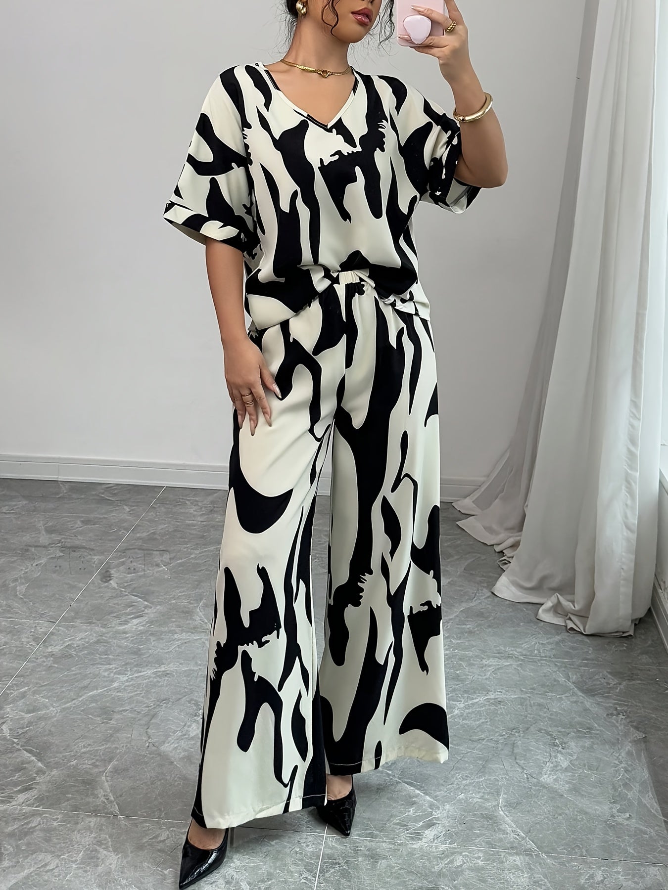 -Yy0207476-2pcs Women'S V-Neck Short-Sleeved Black And White Printed Casual Top And Pants Set