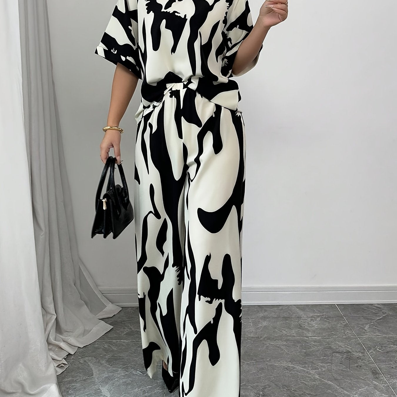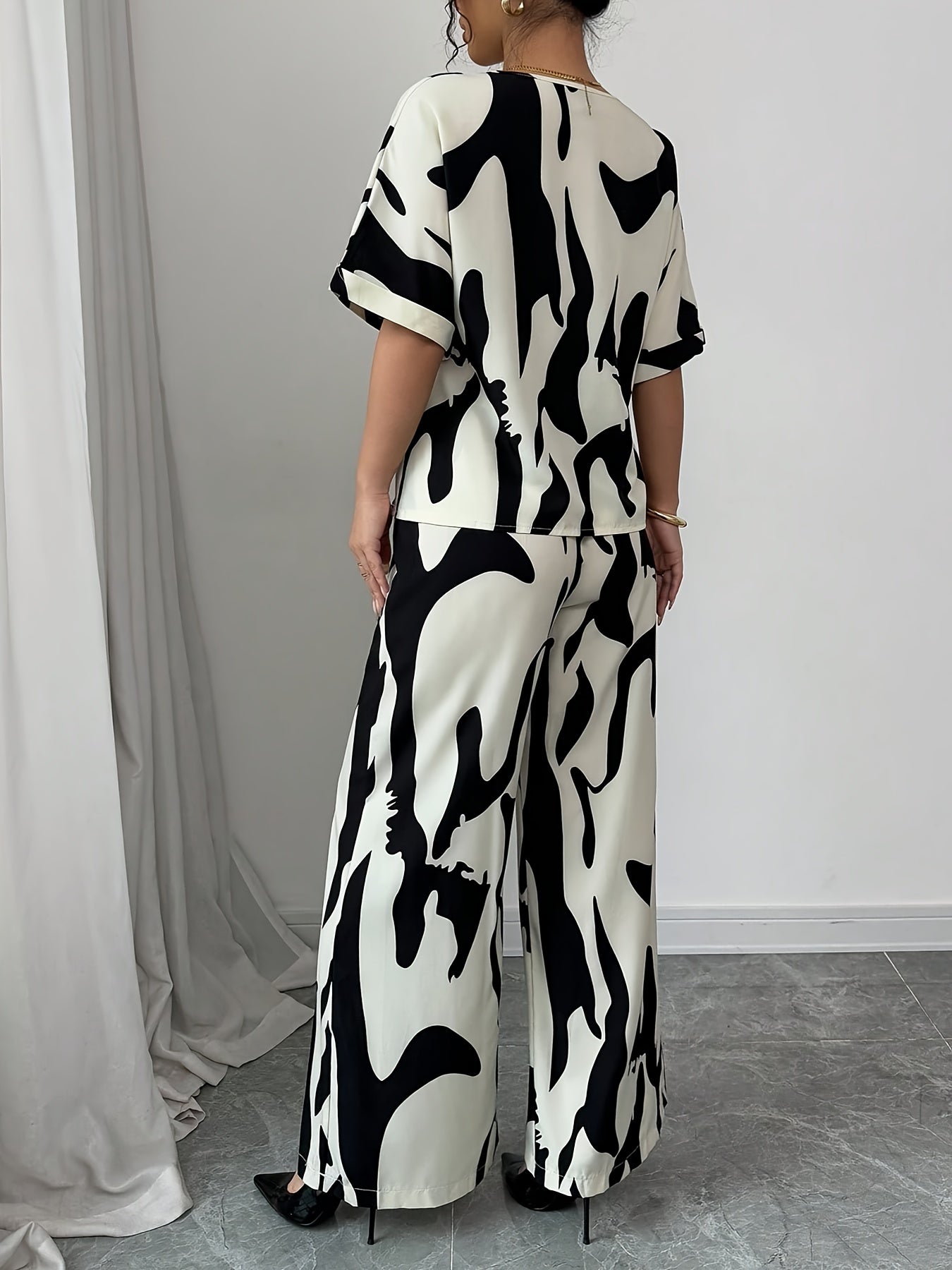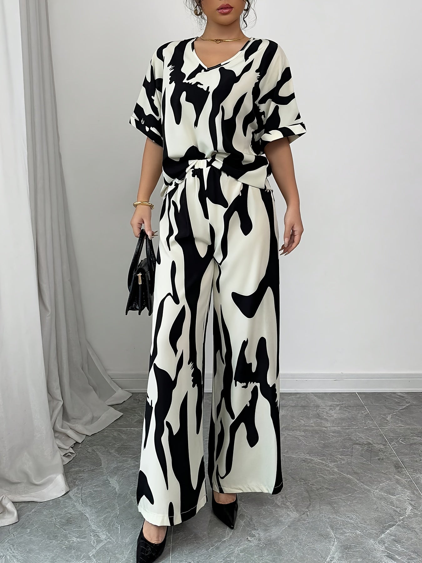 -Yy0207476-2pcs Women'S V-Neck Short-Sleeved Black And White Printed Casual Top And Pants Set