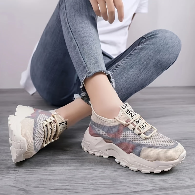 1 զույգ կանացի շնչող ցանցից պատահական սպորտային կոշիկներ, բոլոր սեզոնային ցածր վերնաշապիկով ժանյակավոր սպորտային կոշիկներ պարզ ծայրով, գործվածքից վերին/ներքին, TPR ներբան, Հարմարավետ տրիկոտաժե գործվածքի միջանցք: