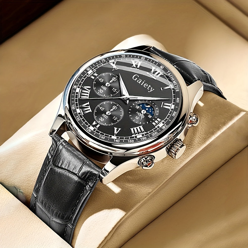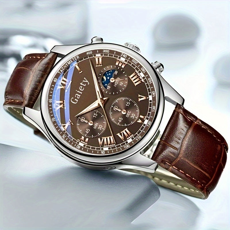 1 հատ GAIETY տղամարդու շքեղ քվարցային ժամացույց՝ համապատասխան արհեստական կաշվե գոտիով, կլոր համաձուլվածքից պատյանով, չլիցքավորվող մարտկոցով - Fashion Business Sport ժամացույցների համադրություն