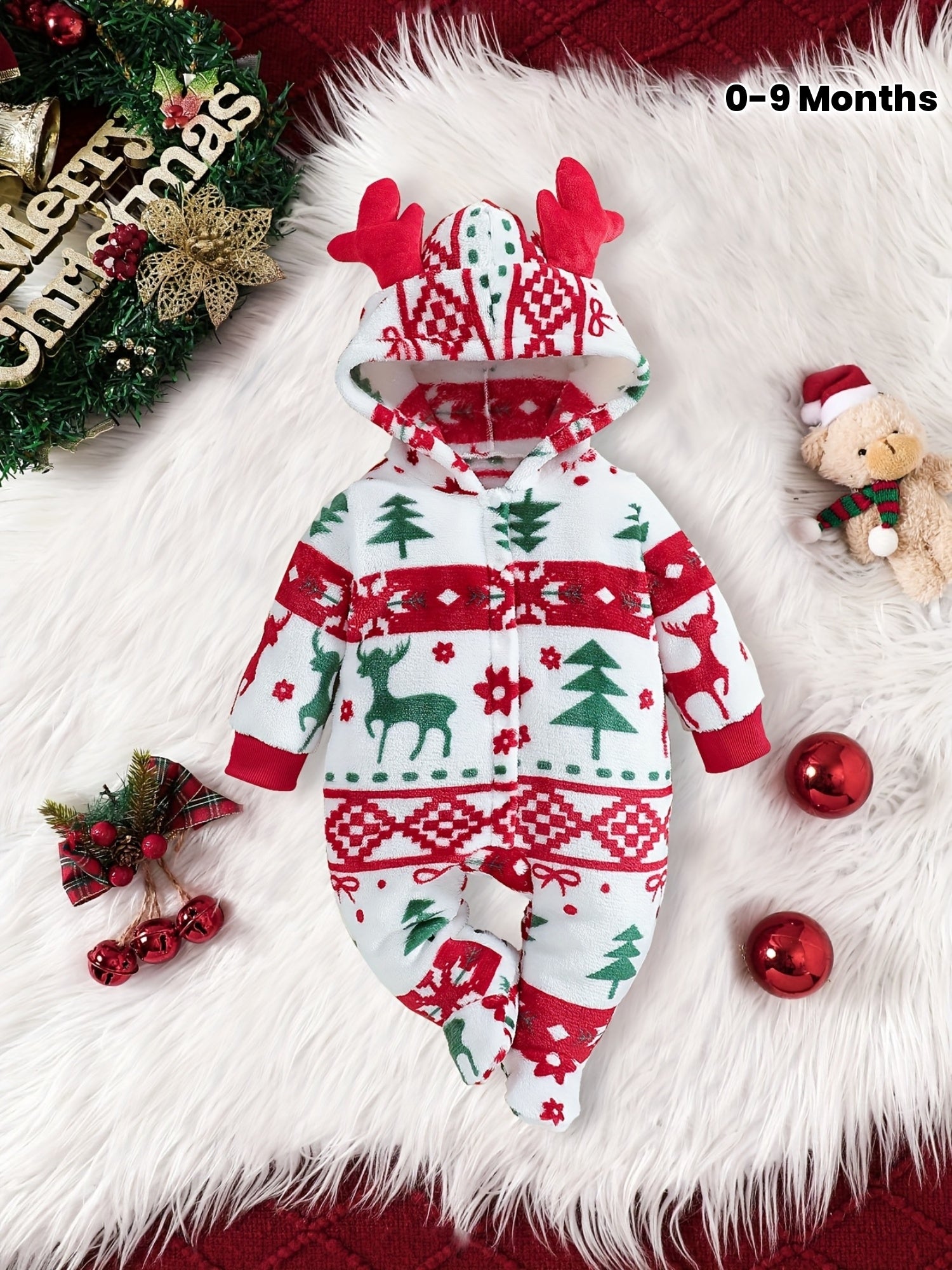 1pc Girls' Winter Warm Hooded Plush Outfit - Soft Long Sleeve Romper with Deer & Tree Pattern, Cozy Fleece Lined Leggings, Red & Green Holiday Design, for Outdoor, Christmas, New Year - Machine Washable, Perfect For Outdoor