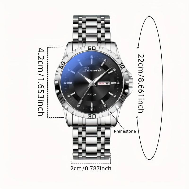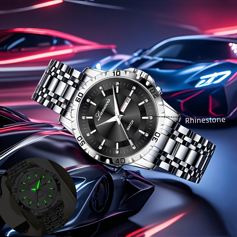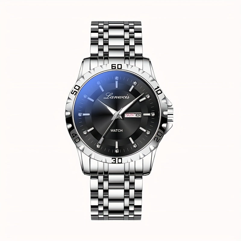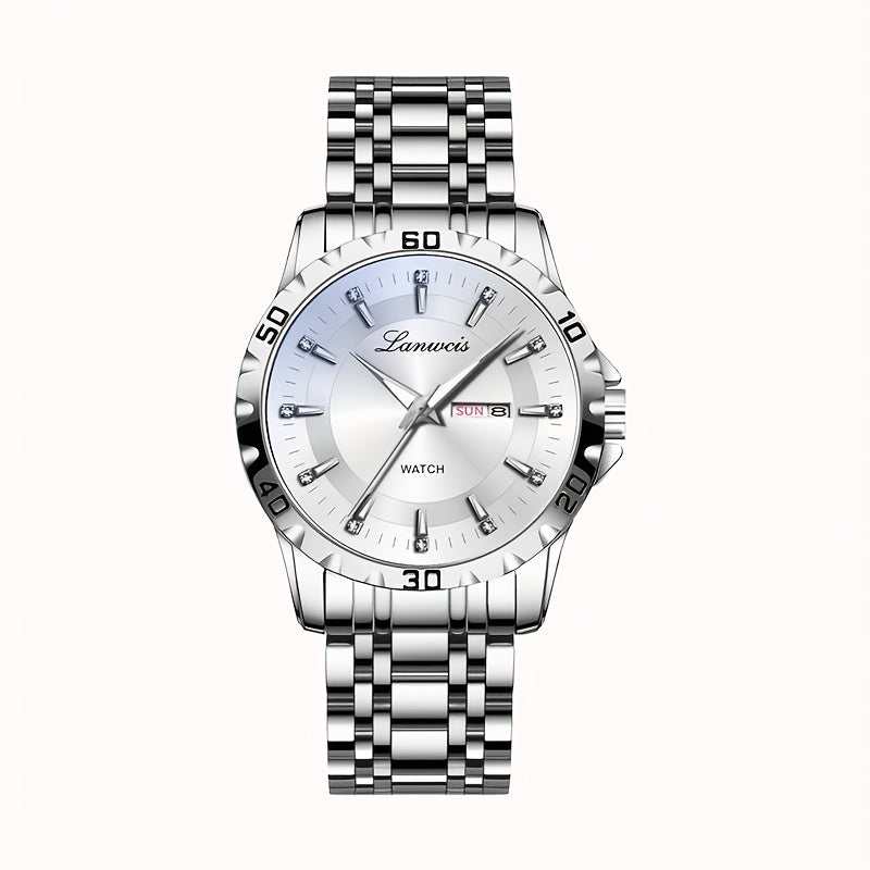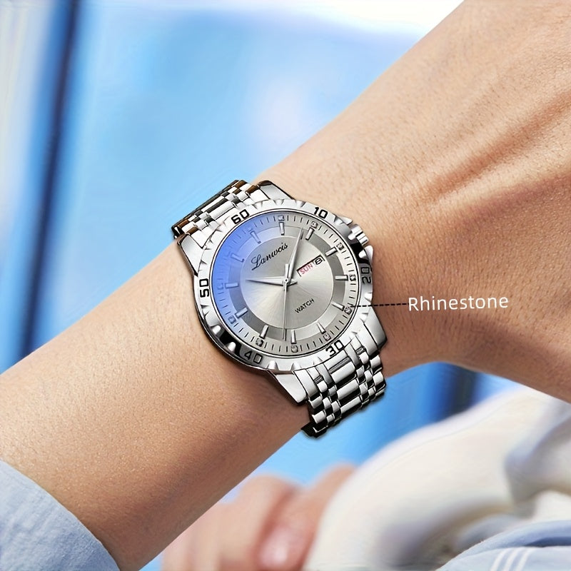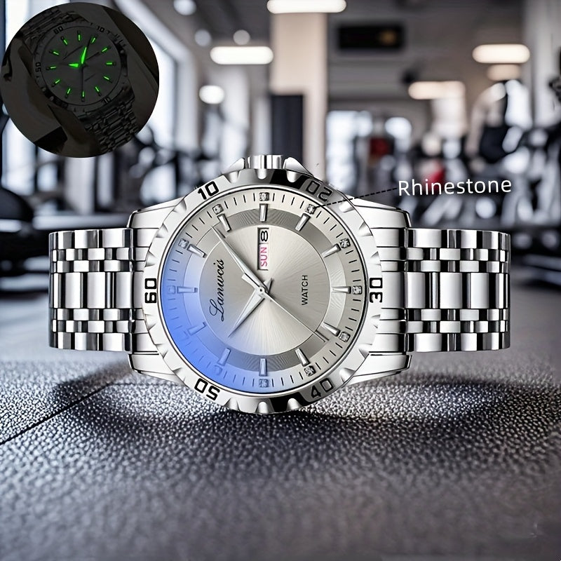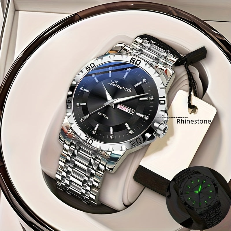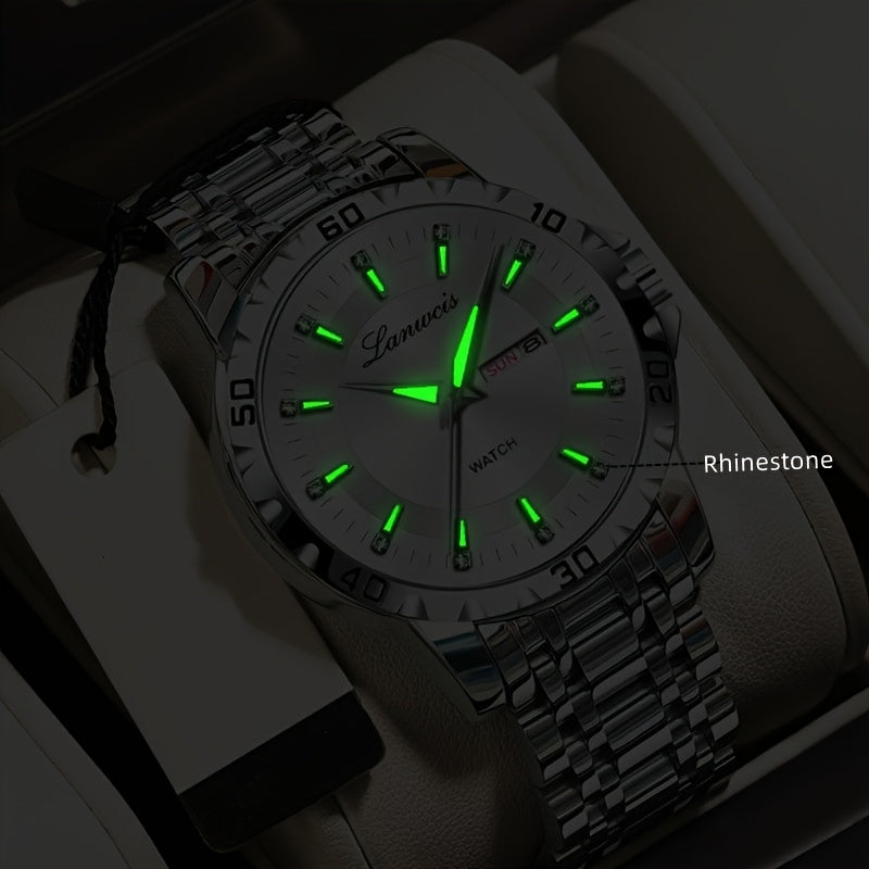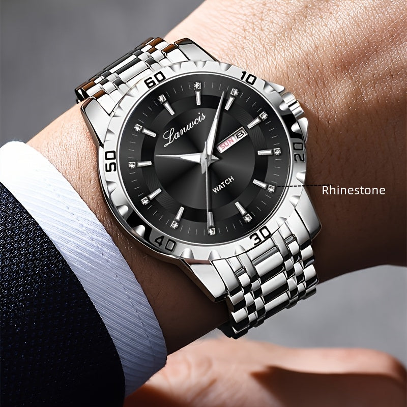 1pc Men's Business Style Stainless Steel Strap Watch - IPX7 Waterproof, Luminous Hands & Dial, Calendar & Week Display, Quartz Movement, Travel Leisure Sports Watch with Gift Box, Luxury Wristwatch | Sleek Metallic Finish | D