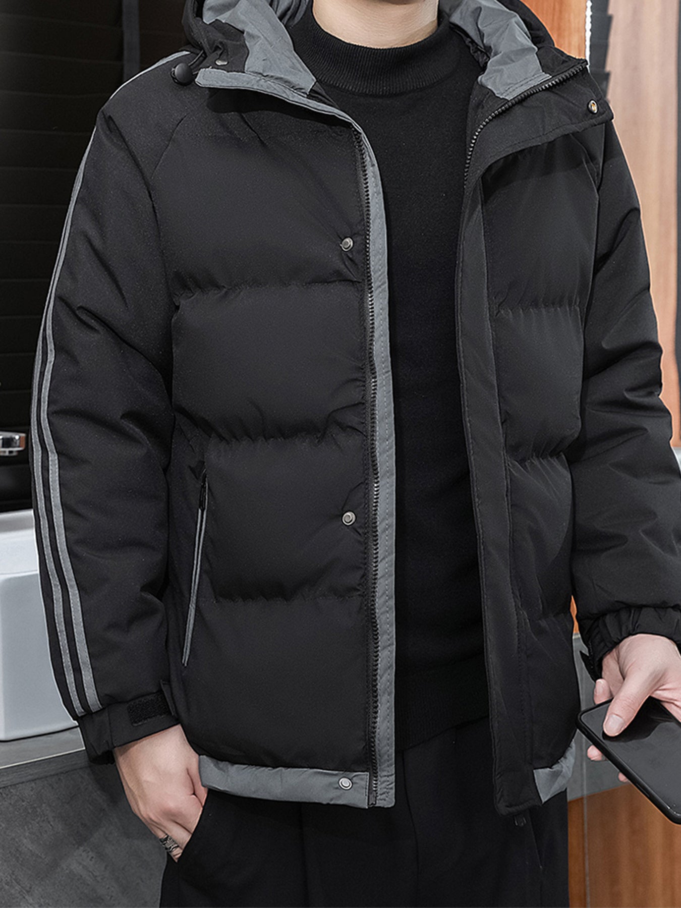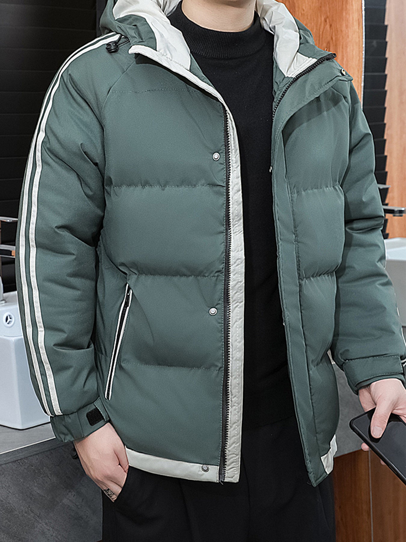 1 հատ տղամարդու ձմեռային բաճկոն գլխարկով, լցոնված վերարկու, սպիտակ և մուգ կանաչ, ոսկեգույն կայծակաճարմանդով, լվացվող մեքենայով, ամենօրյա, արտաքին հագուստի համար (ձյունակայուն, քամուց պաշտպանված) - սովորական, դահուկավազքի, ցրտի համար