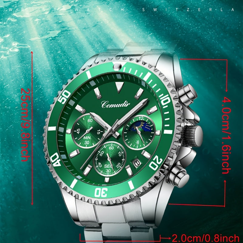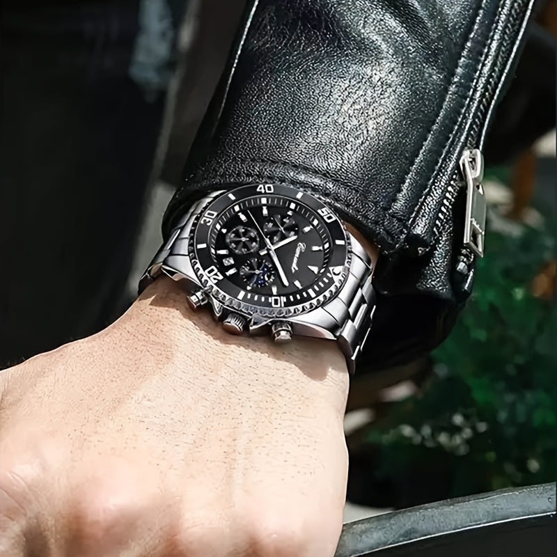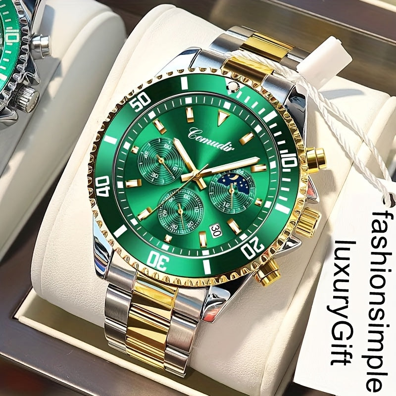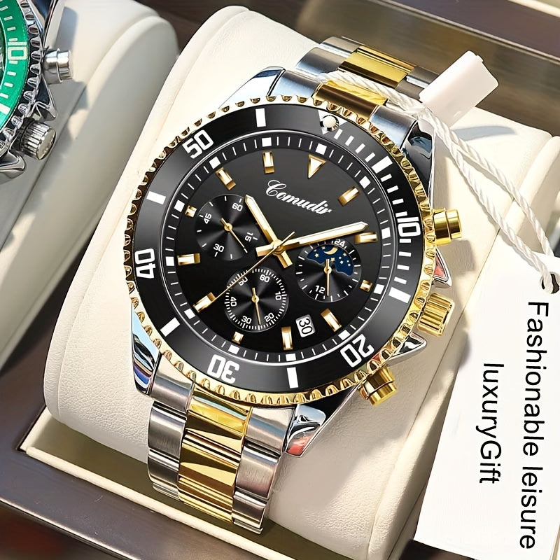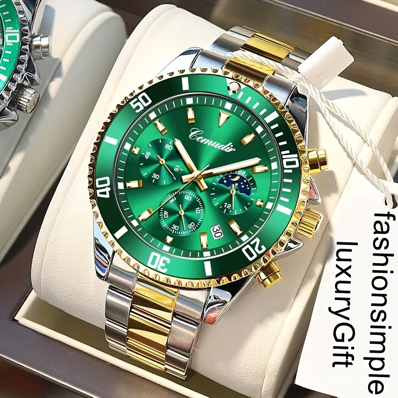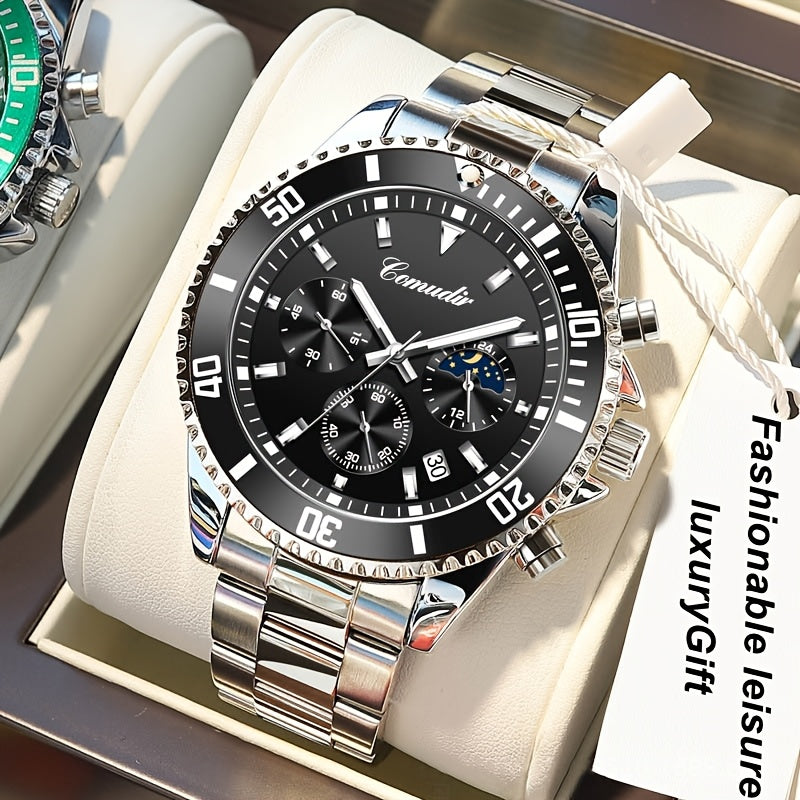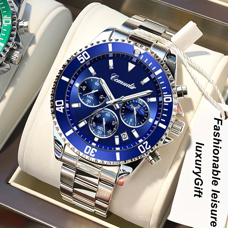 1 հատ նորաձև, շքեղ քվարցե ժամացույց՝ չժանգոտվող պողպատից, բարձրակարգ, ամենօրյա, կլոր ցուցատախտակով, բազմամասշտաբ, գիշերային լույսով, ամսաթվի ցուցիչով, ծննդյան, տոնական, տարեդարձի, տղամարդկանց համար, ճանապարհորդության, երեկույթի համար