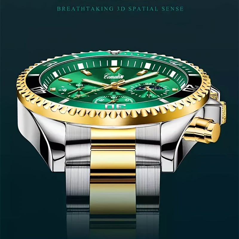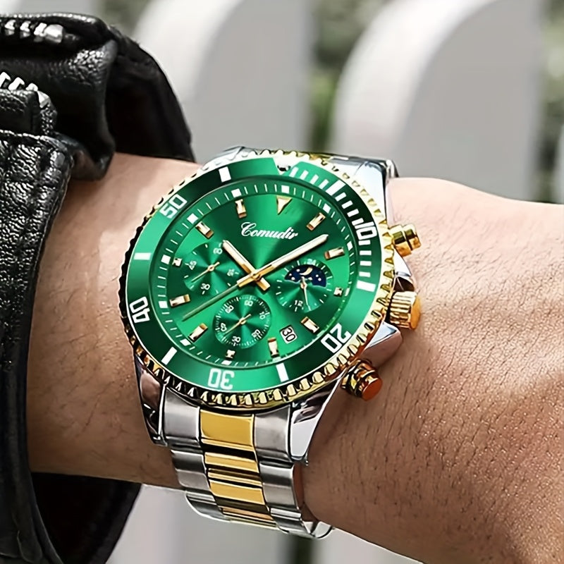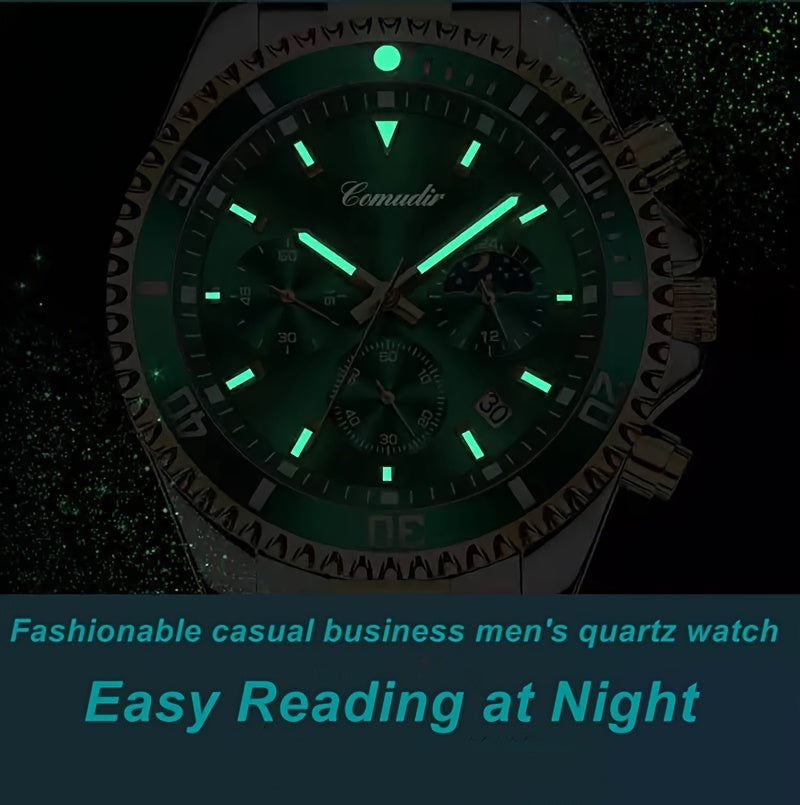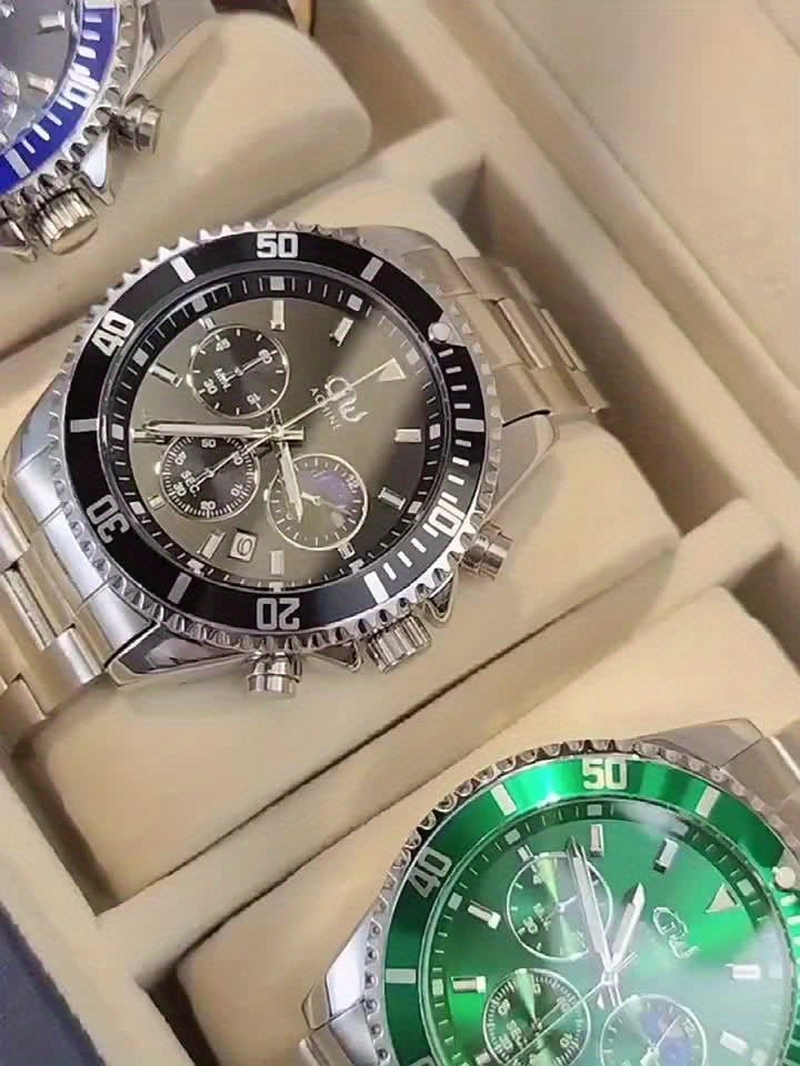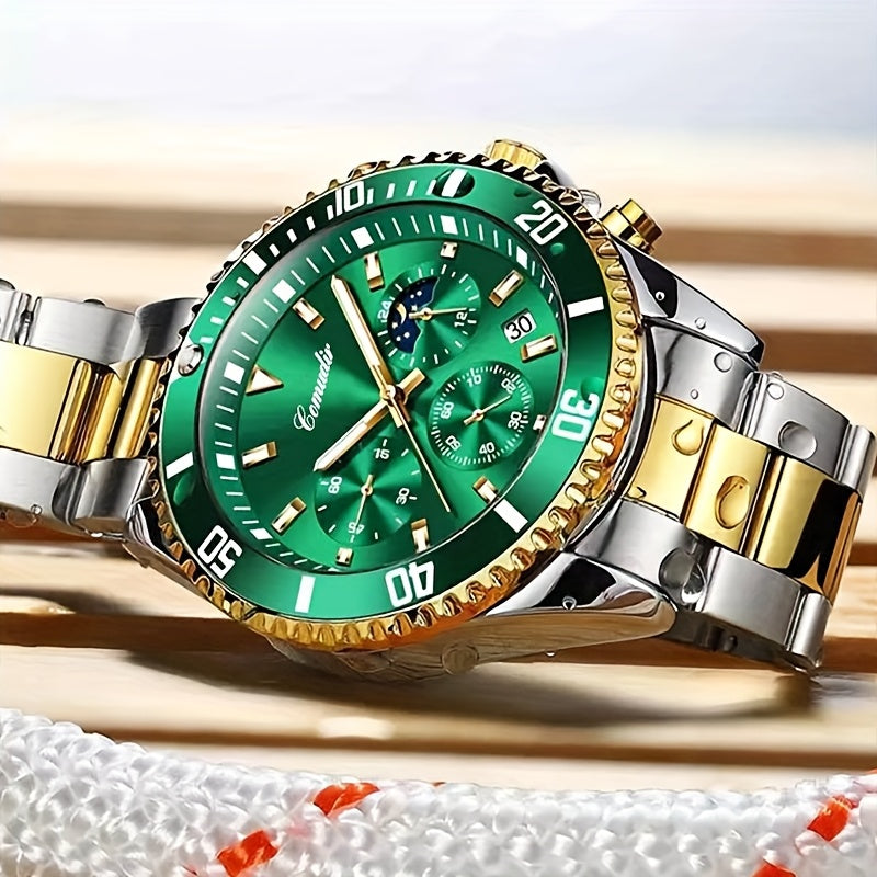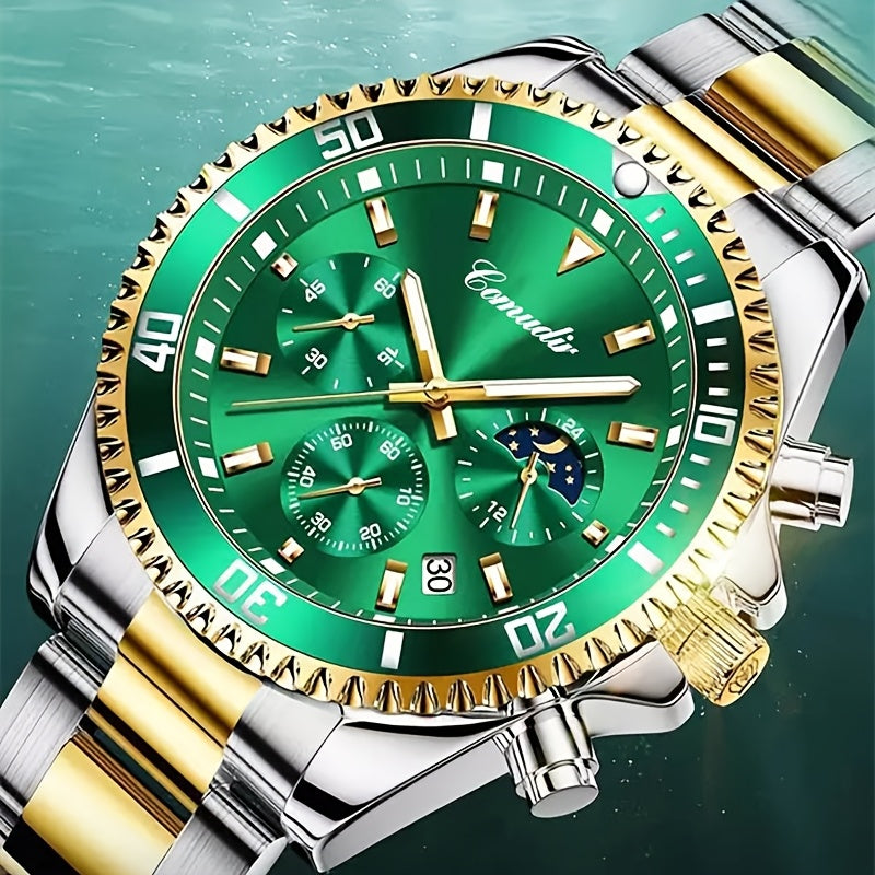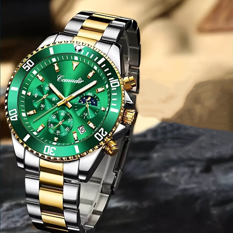 1 հատ նորաձև, շքեղ քվարցե ժամացույց՝ չժանգոտվող պողպատից, բարձրակարգ, ամենօրյա, կլոր ցուցատախտակով, բազմամասշտաբ, գիշերային լույսով, ամսաթվի ցուցիչով, ծննդյան, տոնական, տարեդարձի, տղամարդկանց համար, ճանապարհորդության, երեկույթի համար