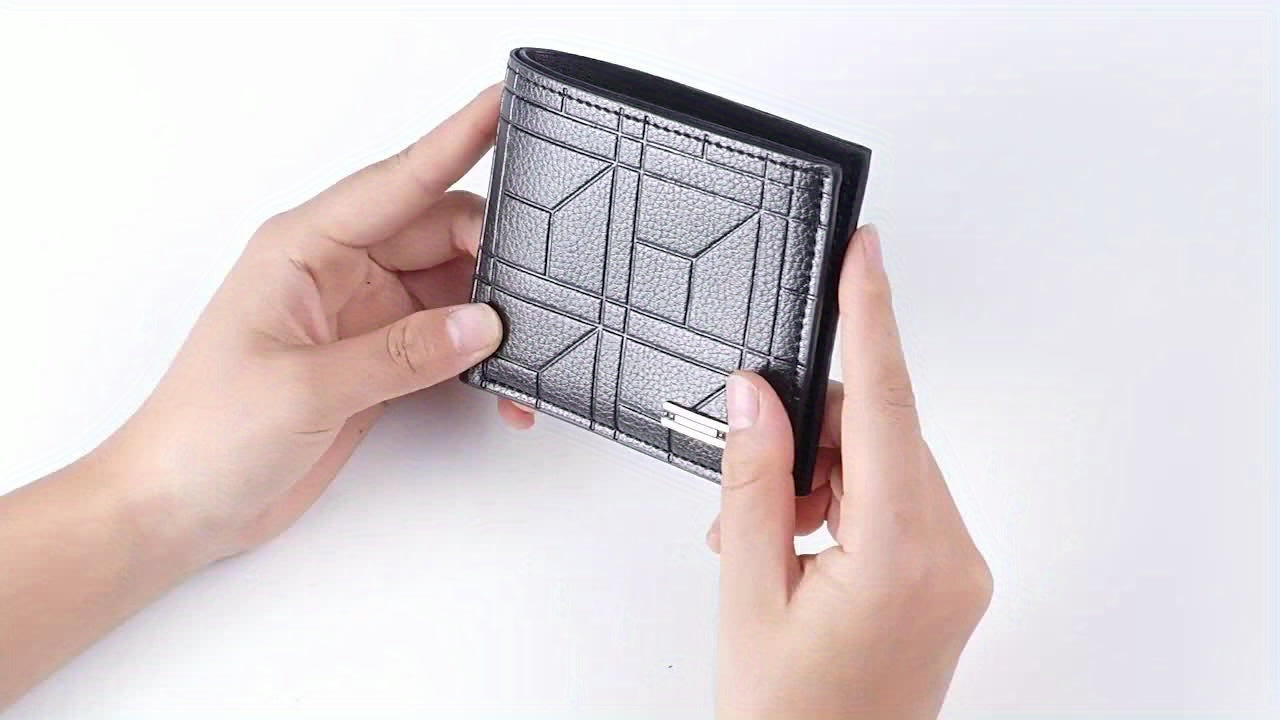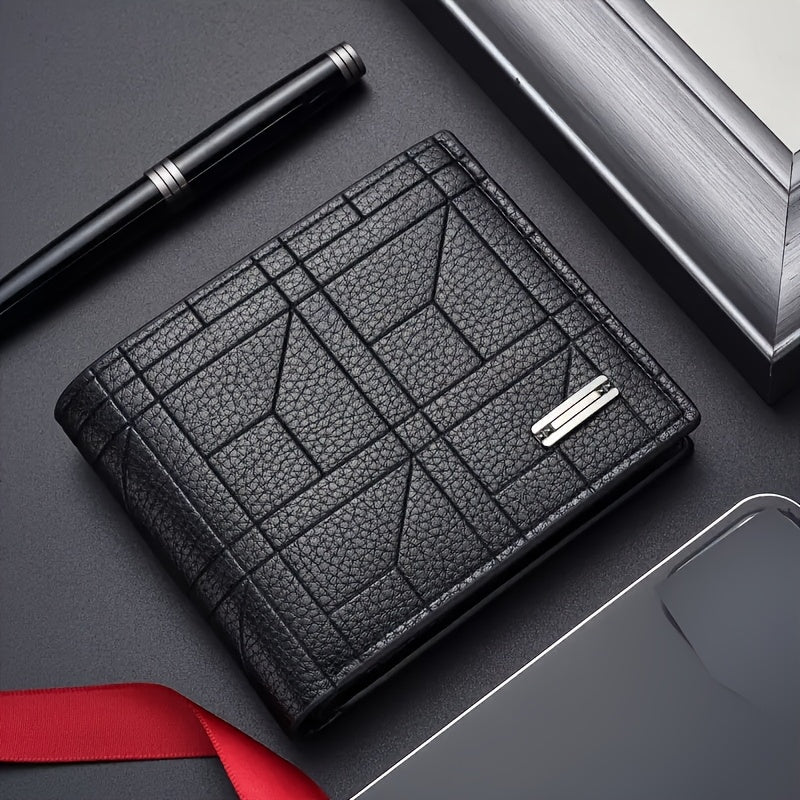1 հատ նորաձև տղամարդու սինթետիկ կաշվե դրամապանակ՝ բազմաթիվ քարտերի համար նախատեսված անցքերով՝ սև երկրաչափական դիզայնով, կատարյալ է բիզնեսի և ամենօրյա օգտագործման համար, իդեալական Սուրբ Ծննդյան նվեր նրա համար