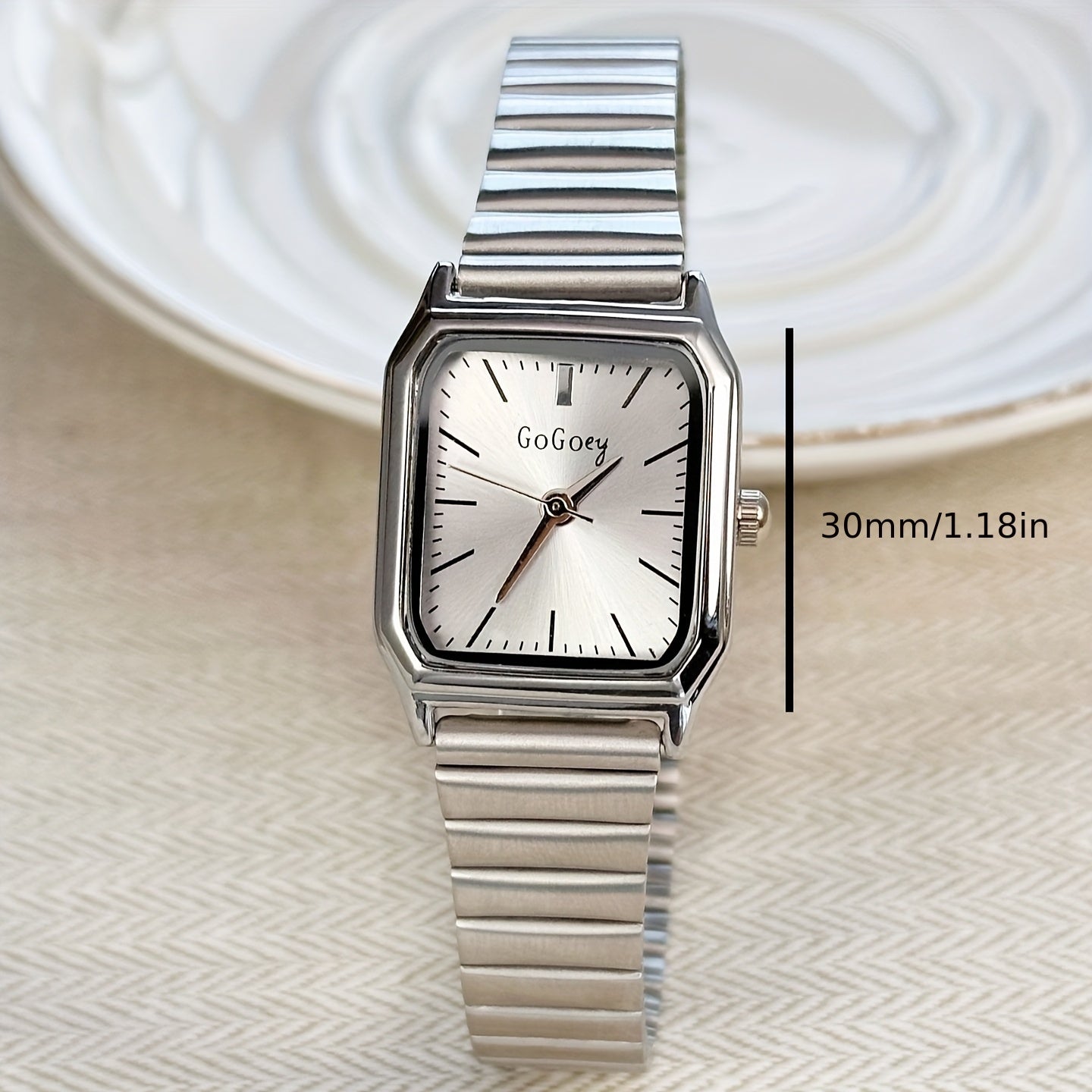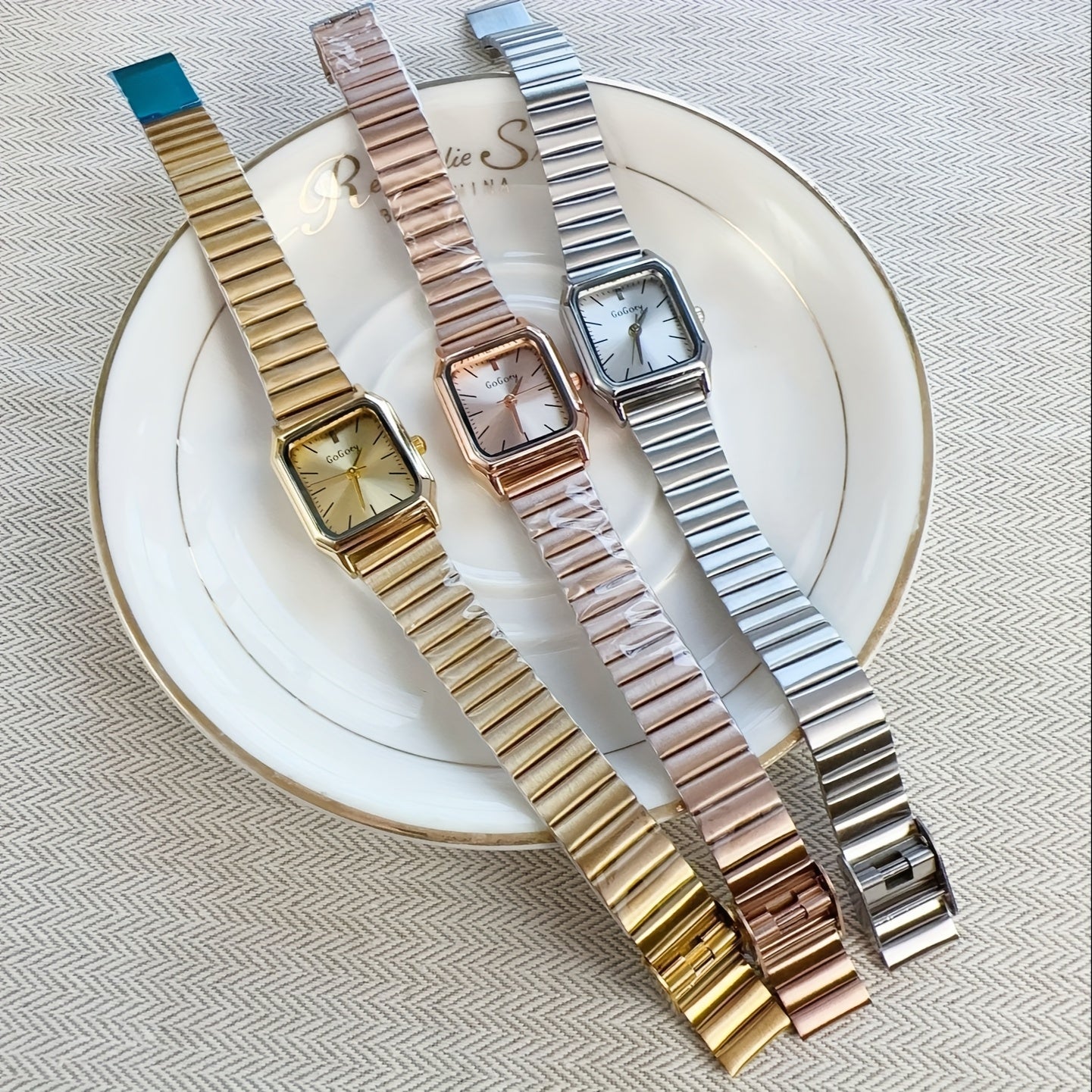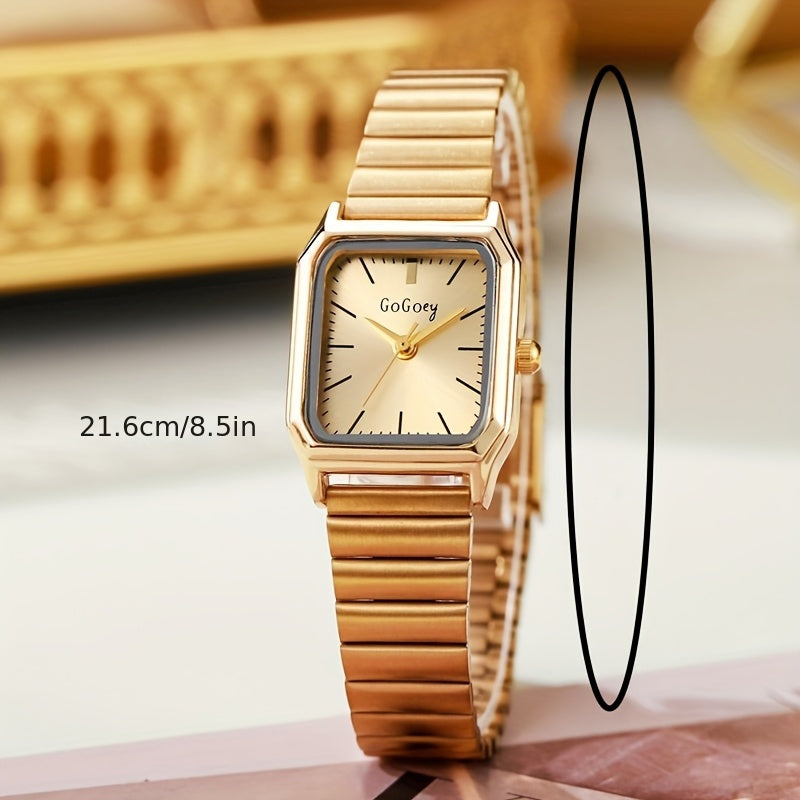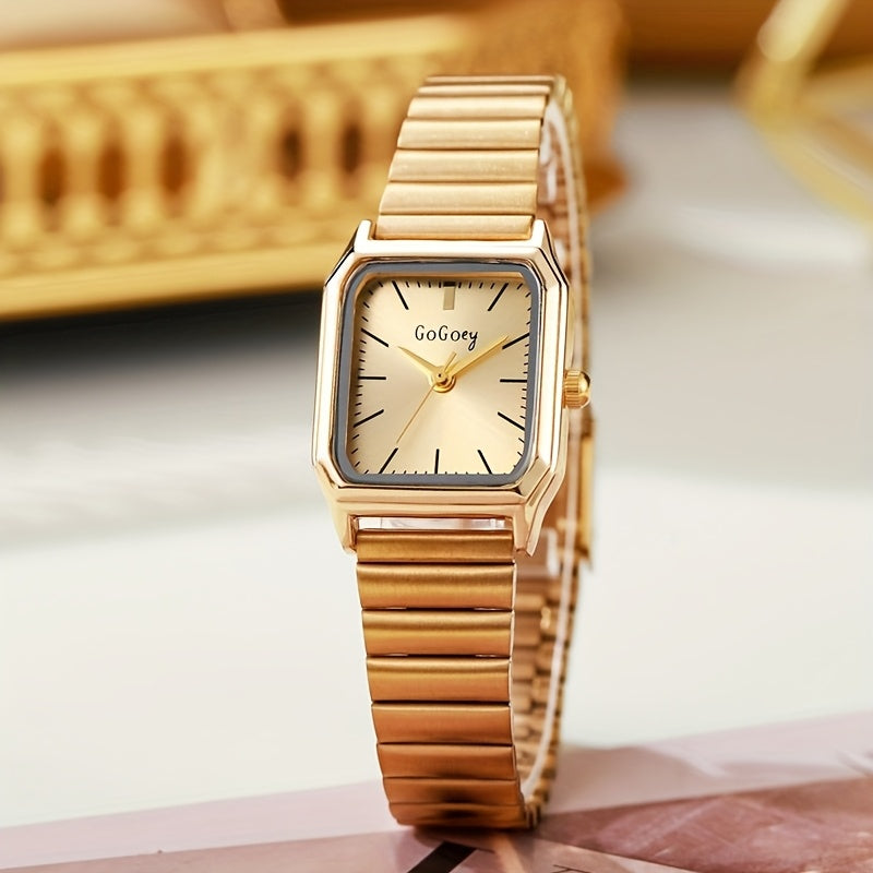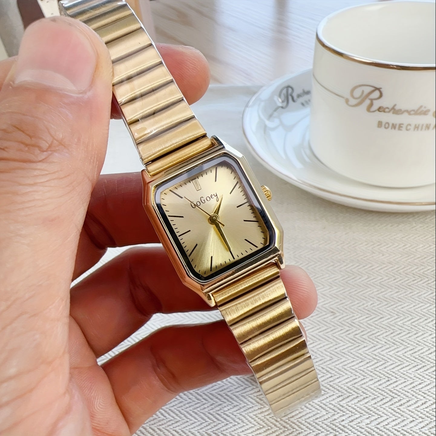 1 հատ կանացի ոսկեգույն չժանգոտվող պողպատե ժապավենով նորաձև քառակուսի թվատախտակով քվարցային ժամացույց, առօրյա կյանքի համար, տոնական նվեր