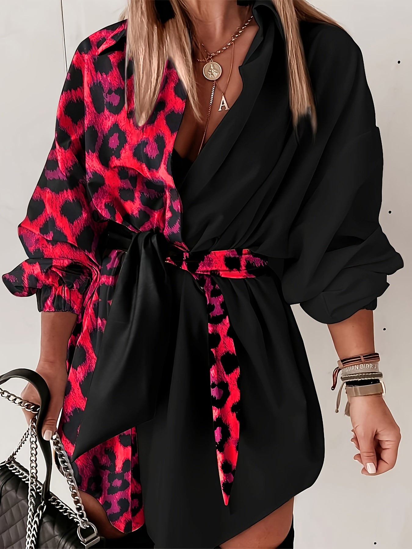 1 հատ կանացի ընձառյուծի պրինտով կապող վերնաշապիկ՝ փողկապով գոտկատեղով, V- պարանոցով պոլիեսթեր բլուզի զգեստ, ամբողջ սեզոնային հյուսված կոճակով դետալ, 100% պոլիեսթեր մեծահասակների հագուստ