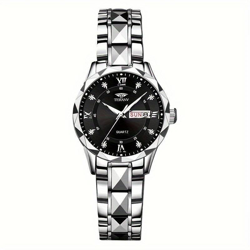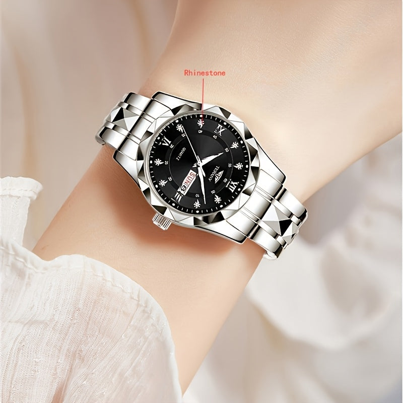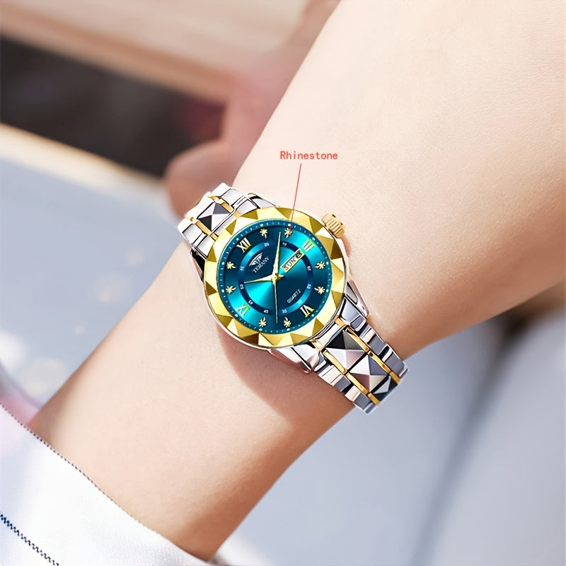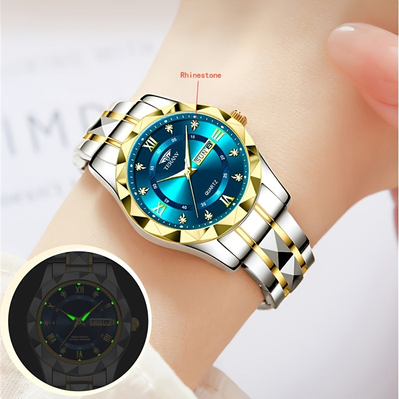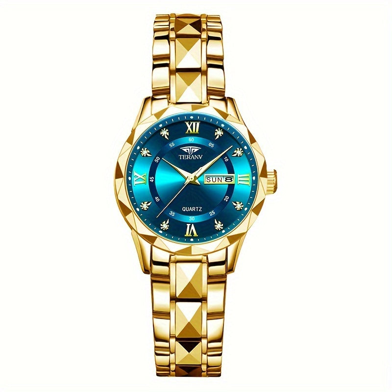 1pc Women's Stainless Steel Watch with Luminous Blue Dial, Date & Day Display, High Quality IPX7, Quartz Movement - Casual Elegant Design for Sports & Travel, Birthday Holiday Gift, Casual Attire, Secure Clasp Wristwatch
