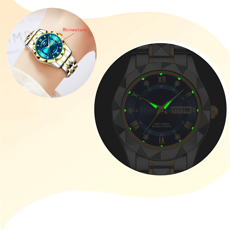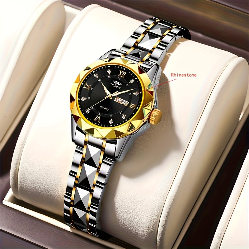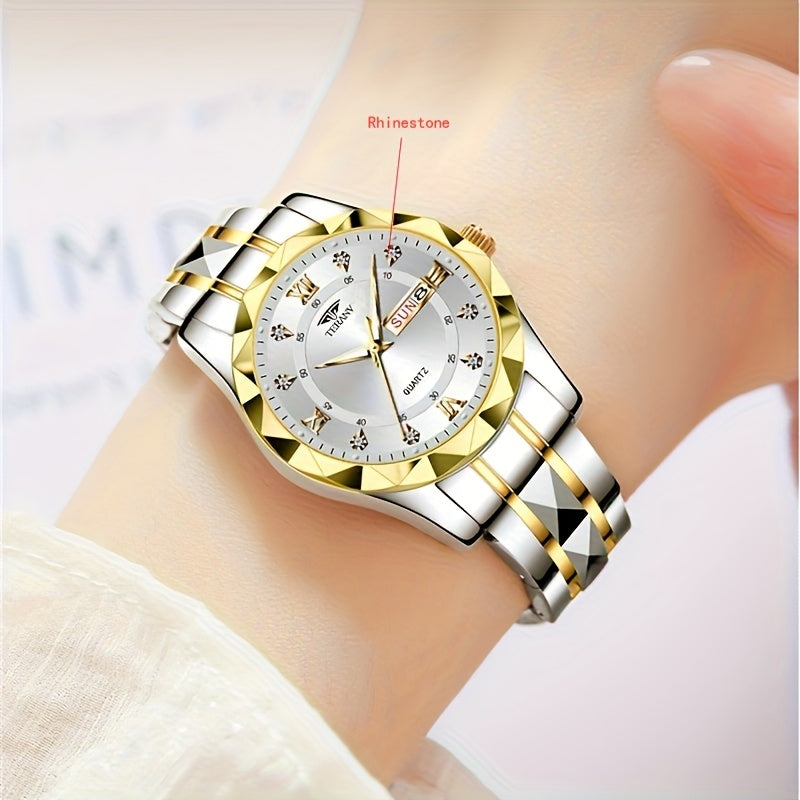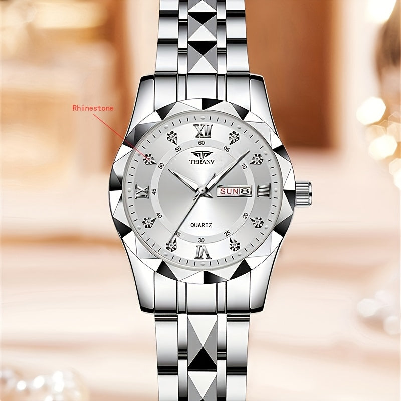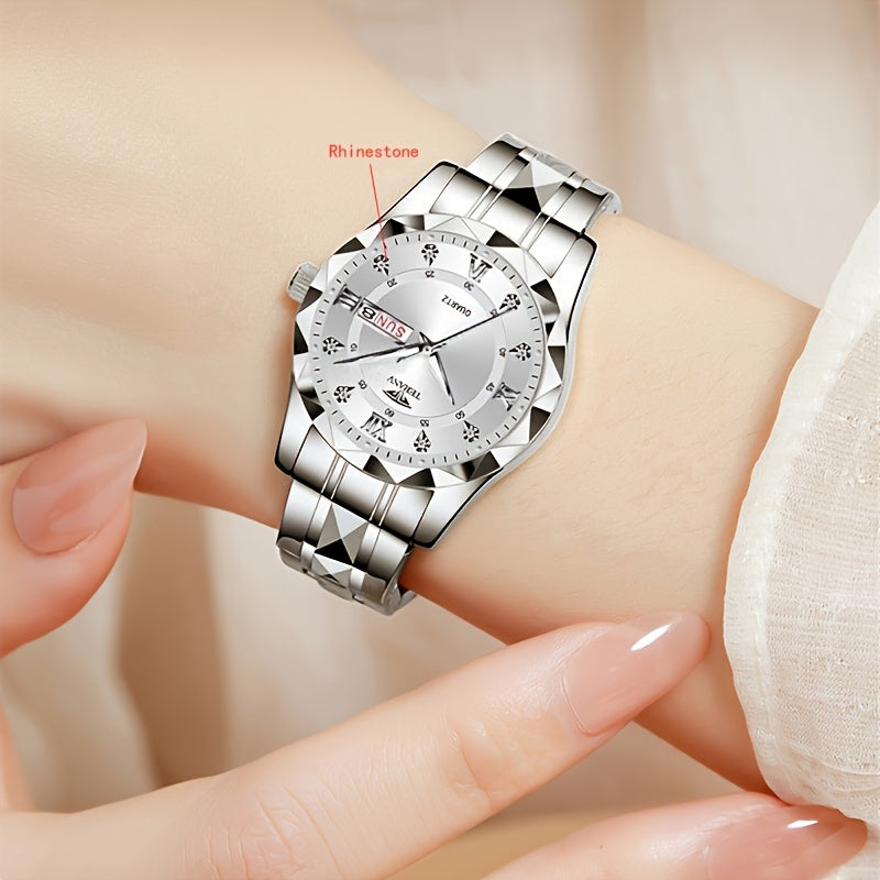 1pc Women's Stainless Steel Watch with Luminous Blue Dial, Date & Day Display, High Quality IPX7, Quartz Movement - Casual Elegant Design for Sports & Travel, Birthday Holiday Gift, Casual Attire, Secure Clasp Wristwatch