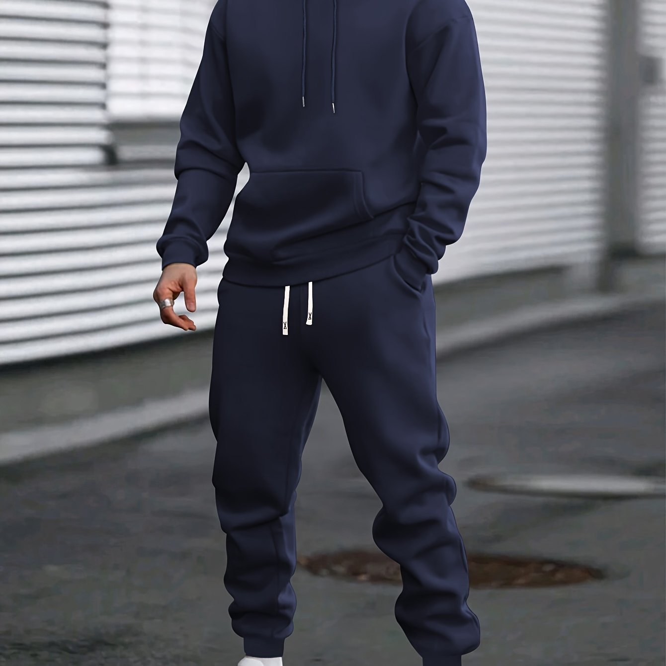 Տղամարդու առօրյա սպորտային կոստյում, պոլիեսթերից գլխարկով սվիտերի և վազքի տաբատի հավաքածու, միագույն, առաձգական գոտկատեղով, թևքերով կոճեր, տրիկոտաժե սվիտեր գրպաններով, սովորական չափսի՝ բացօթյա վազքի և վազքի համար - Գարուն/աշուն հավաքածու