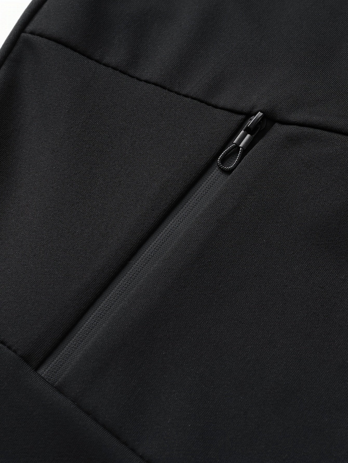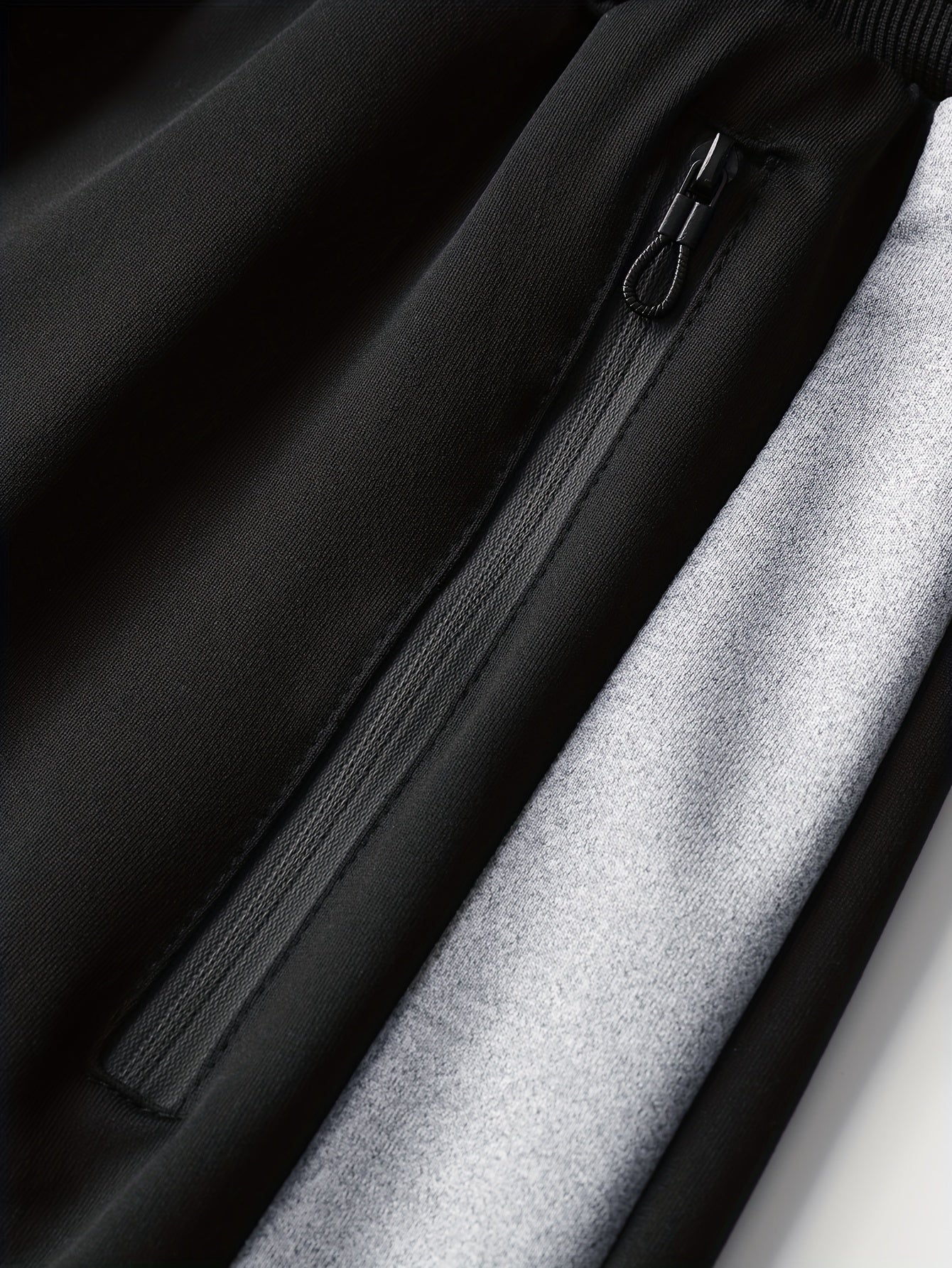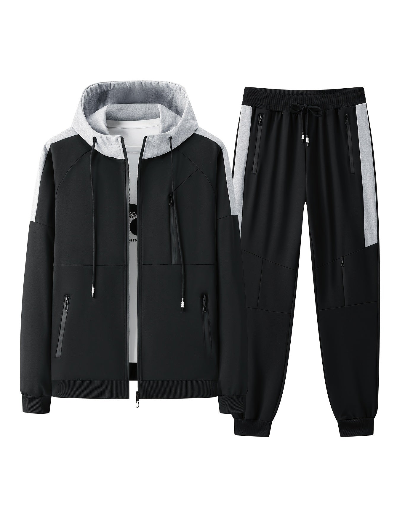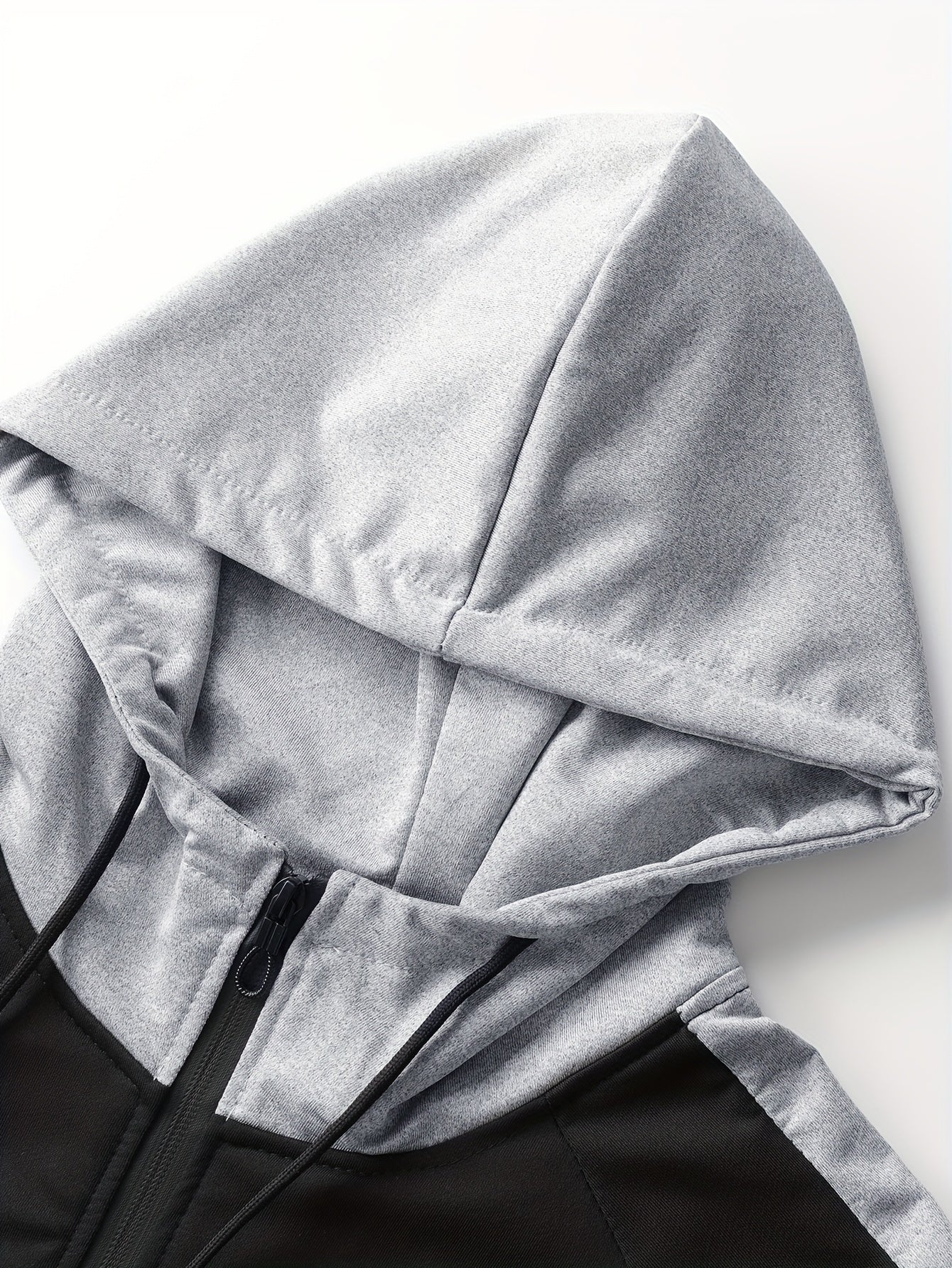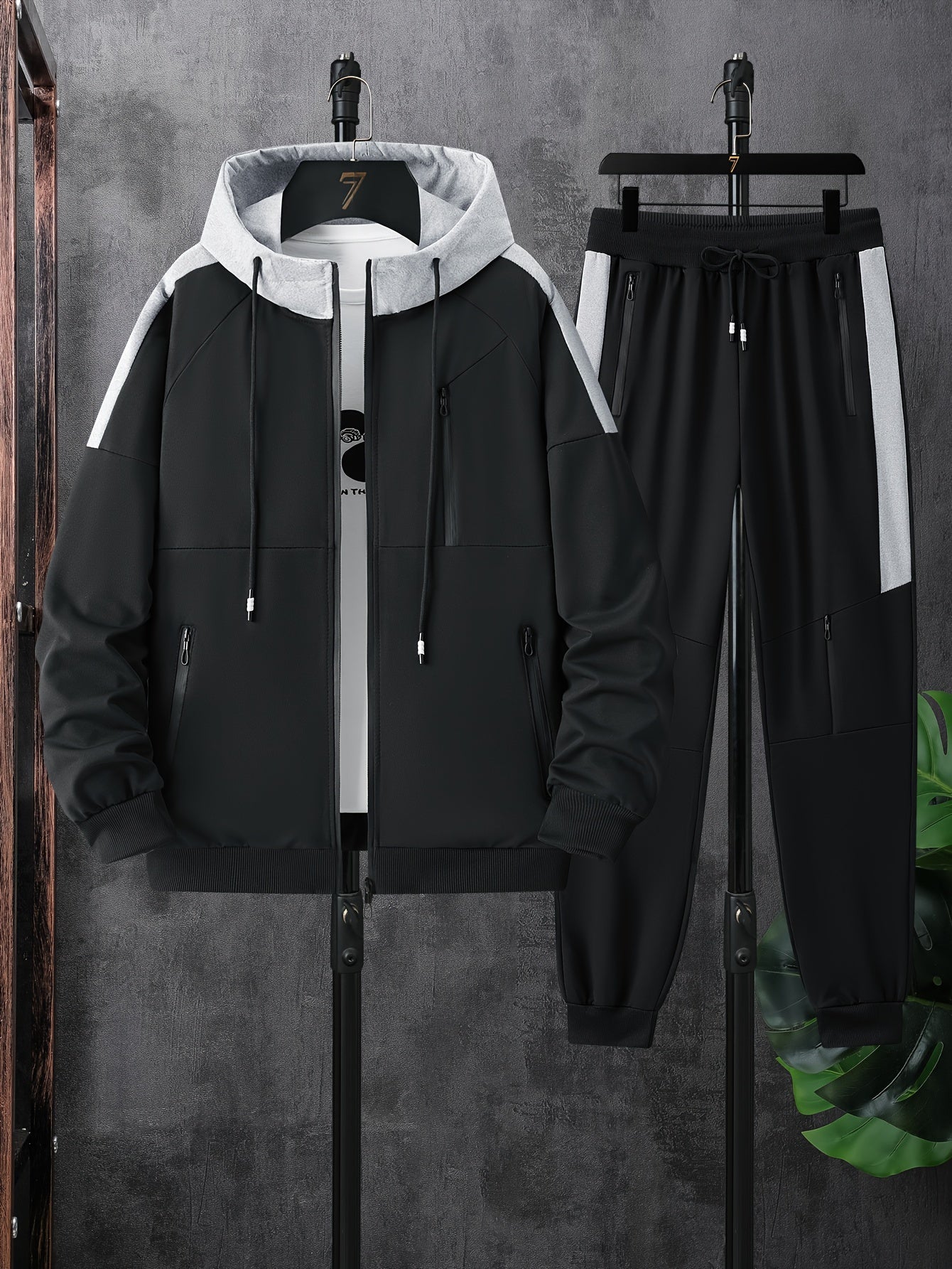 1set Men'S Sports Hooded Jacket and Joggers Set, Polyester Knit Fabric with Slight Stretch, Patchwork Design, Regular Fit, Spring/Fall Season, with Pockets
