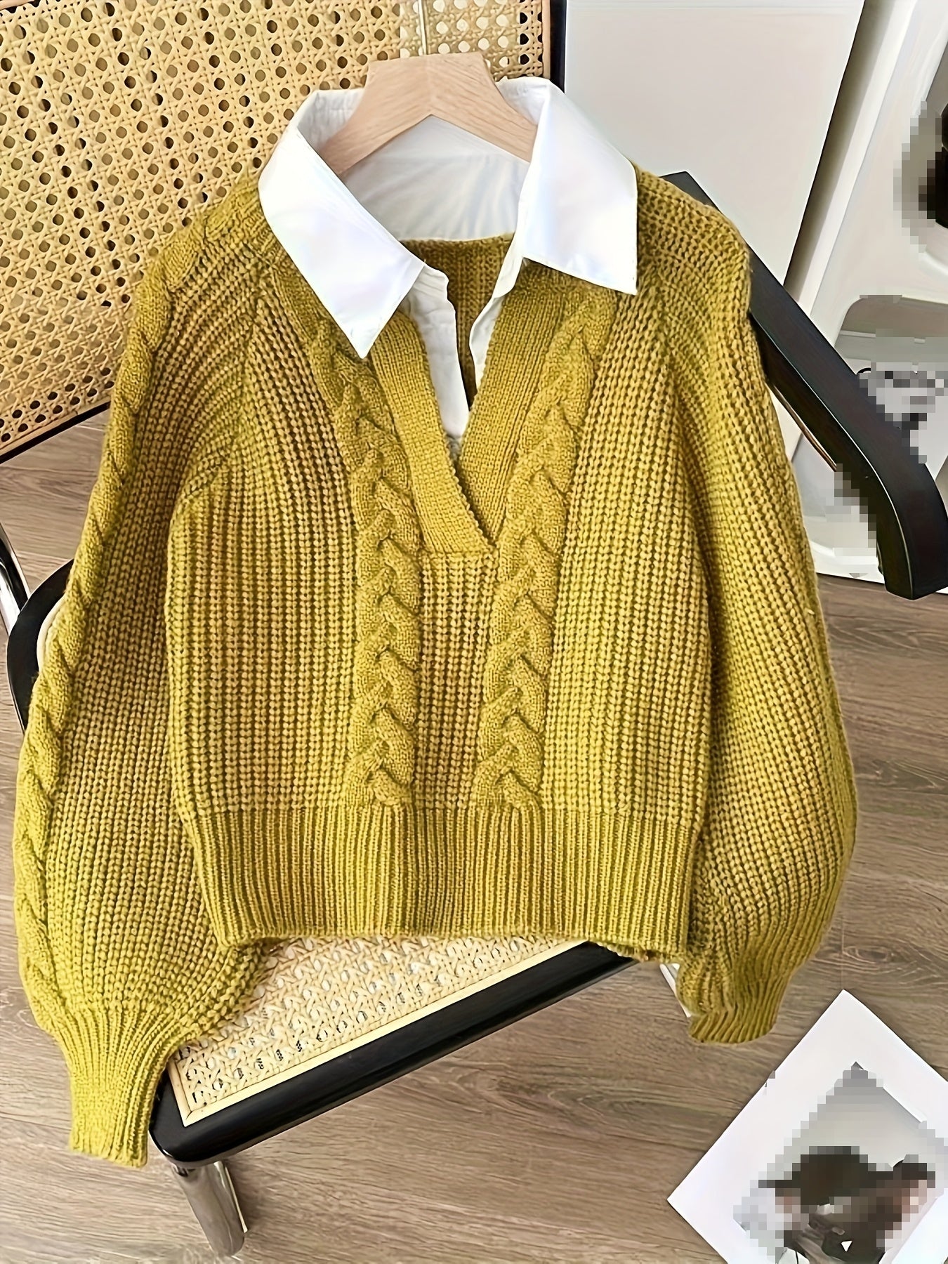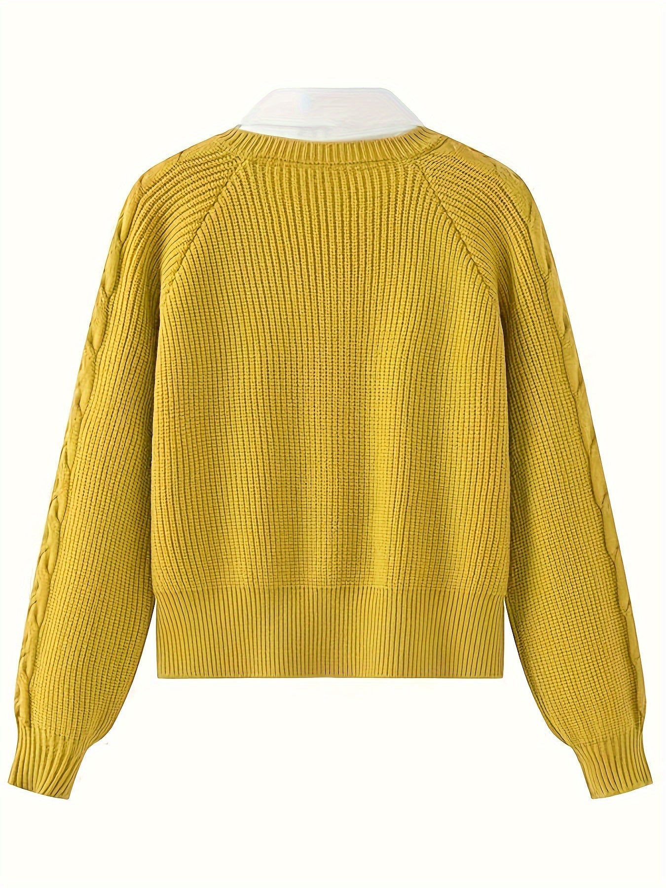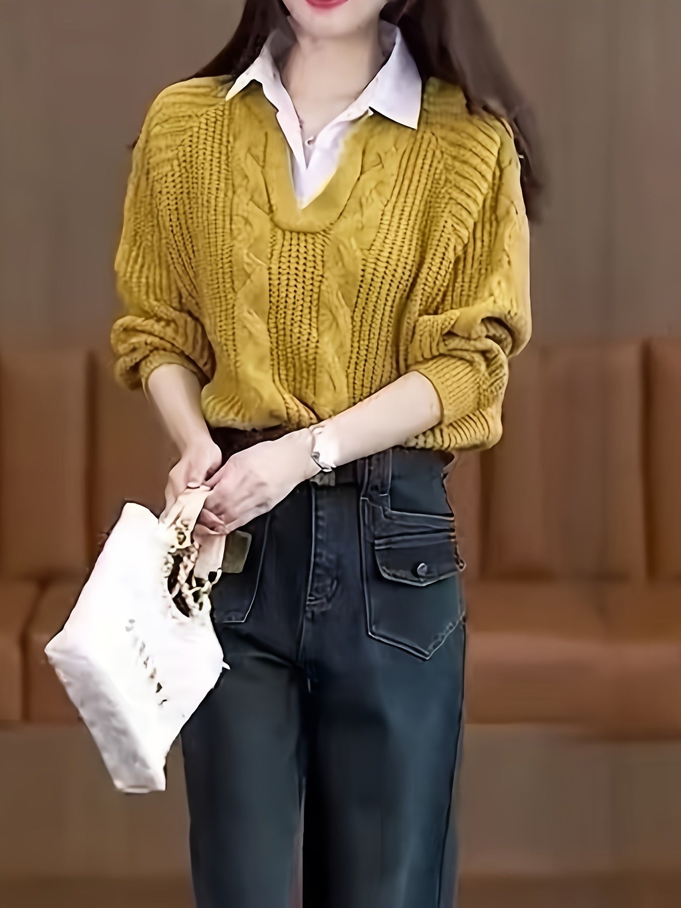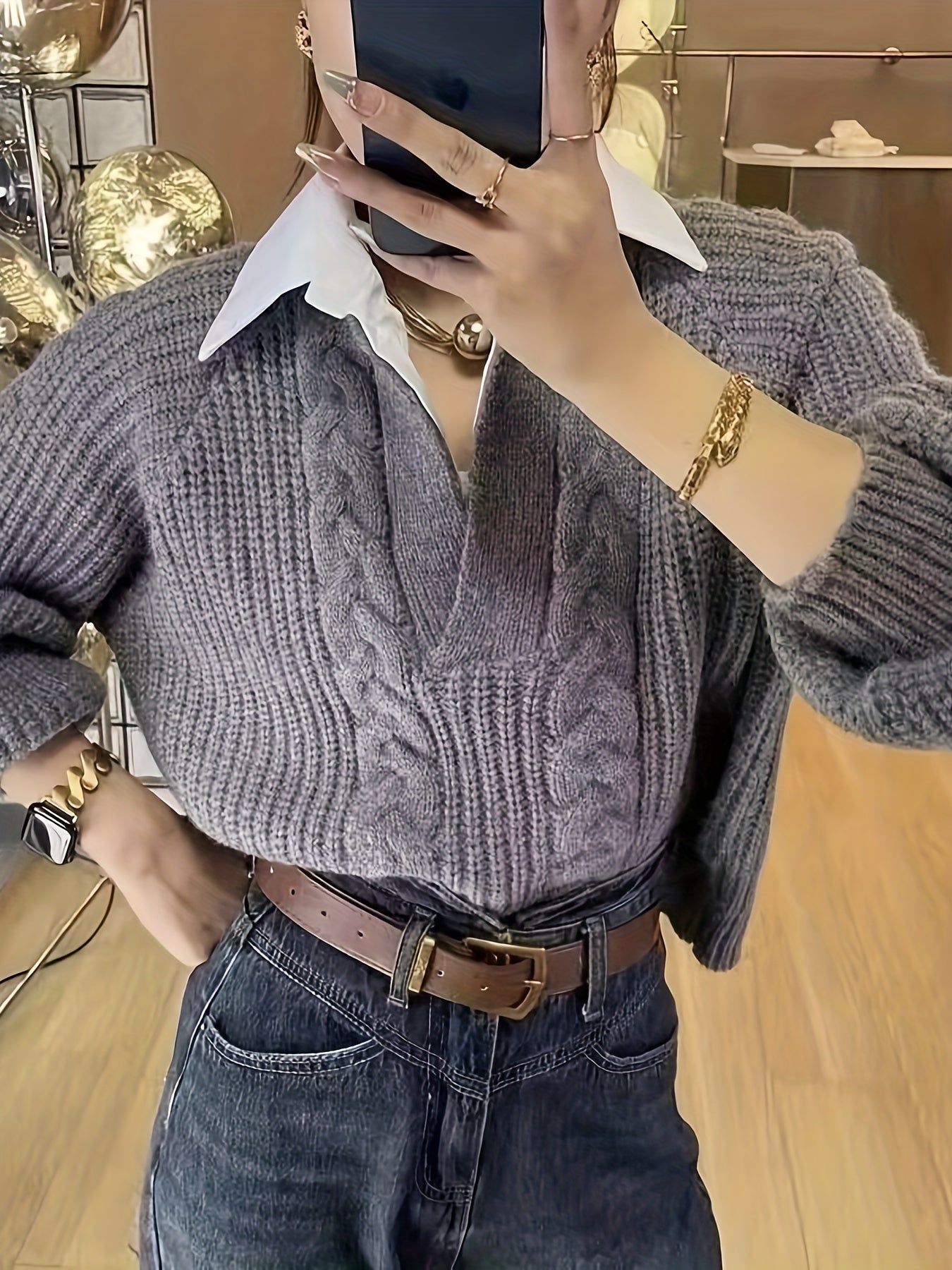 2-ը մեկ կոնտրաստ գույնի օձիքով սվիտեր, շքեղ կաբելային տրիկոտաժե երկարաթև պոլո սվիտեր աշնանային և ձմեռային համար, կանացի հագուստ