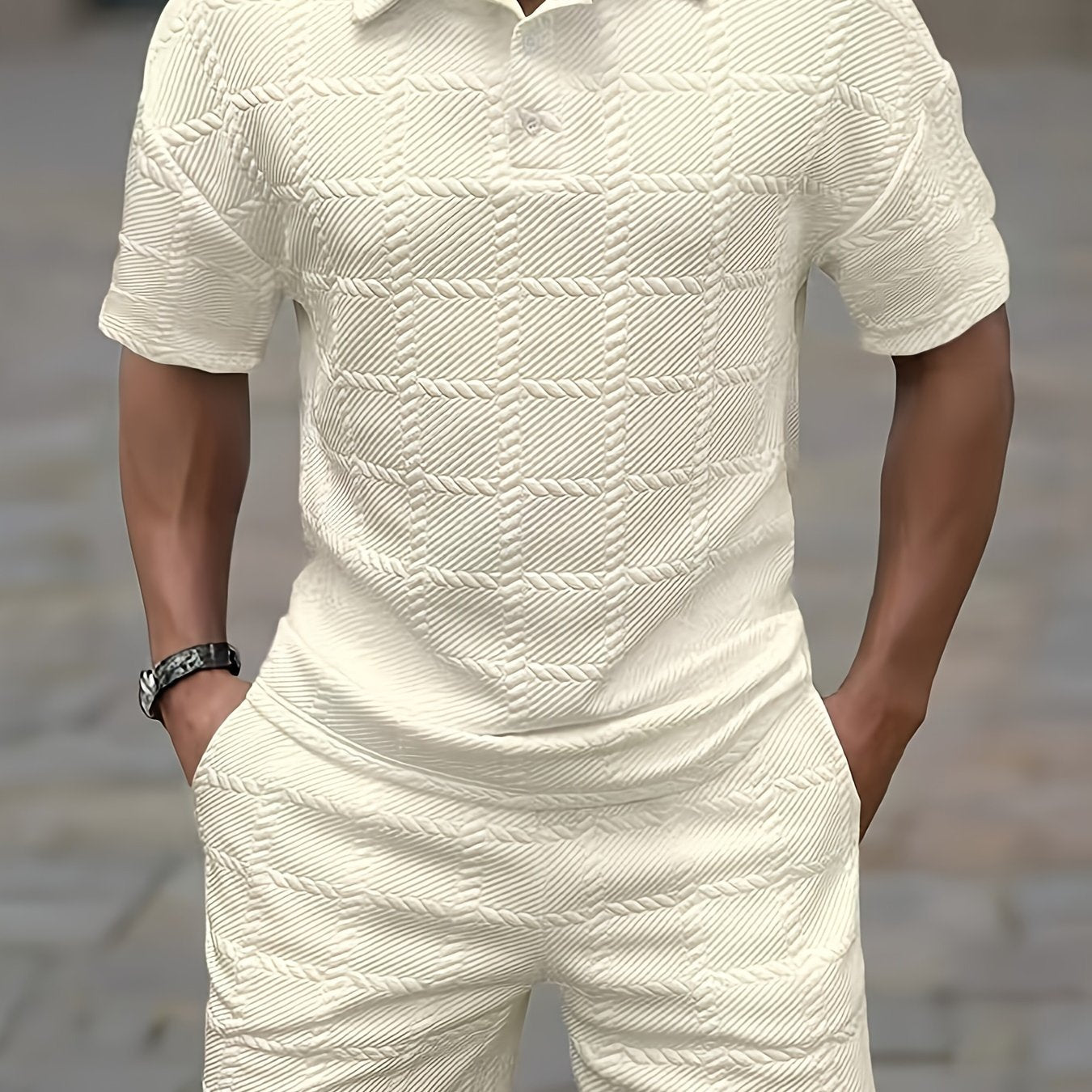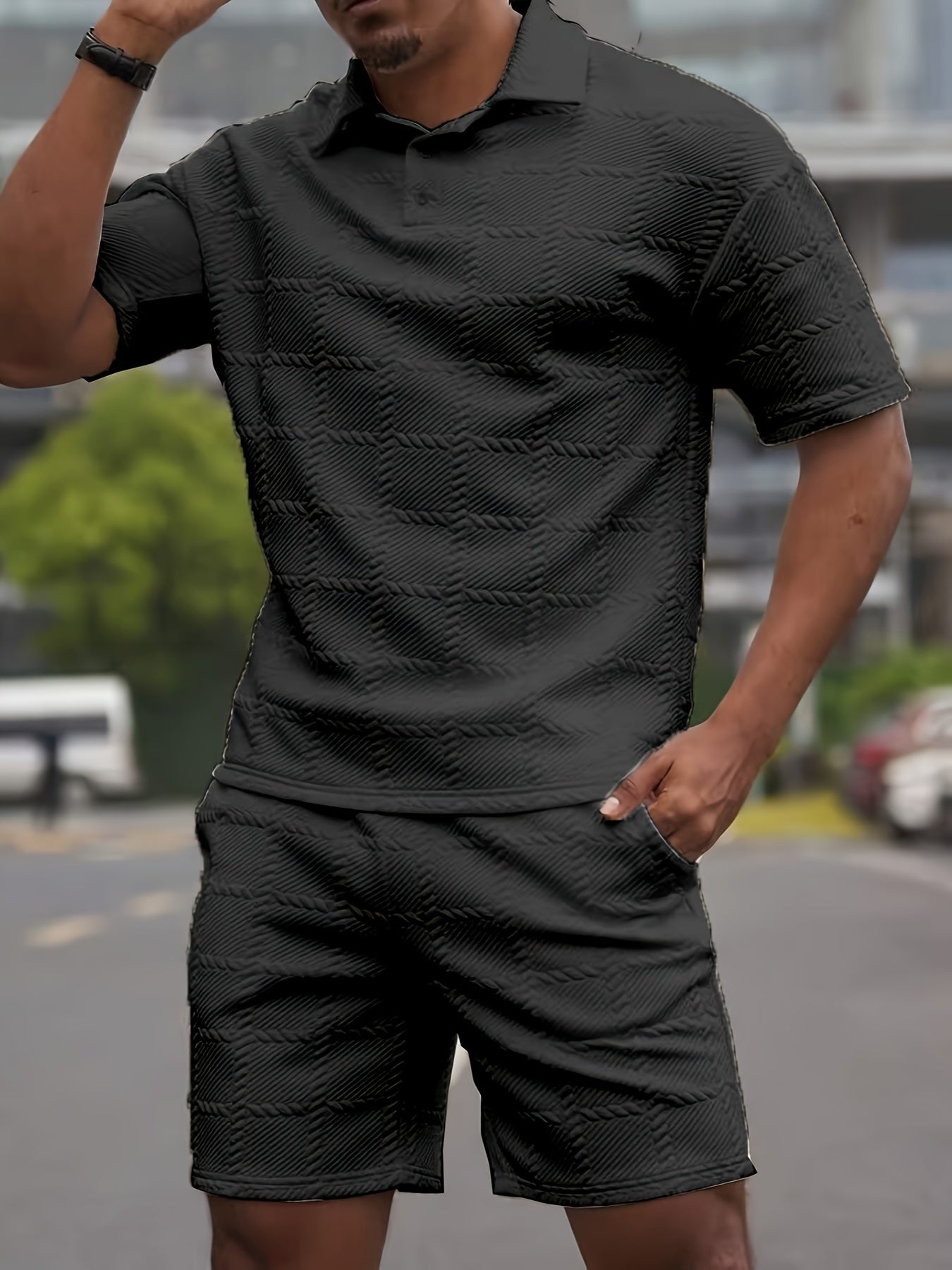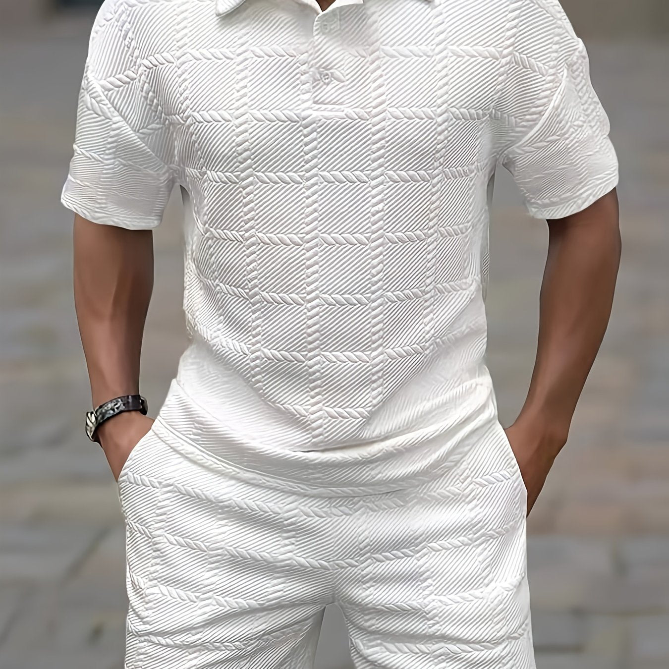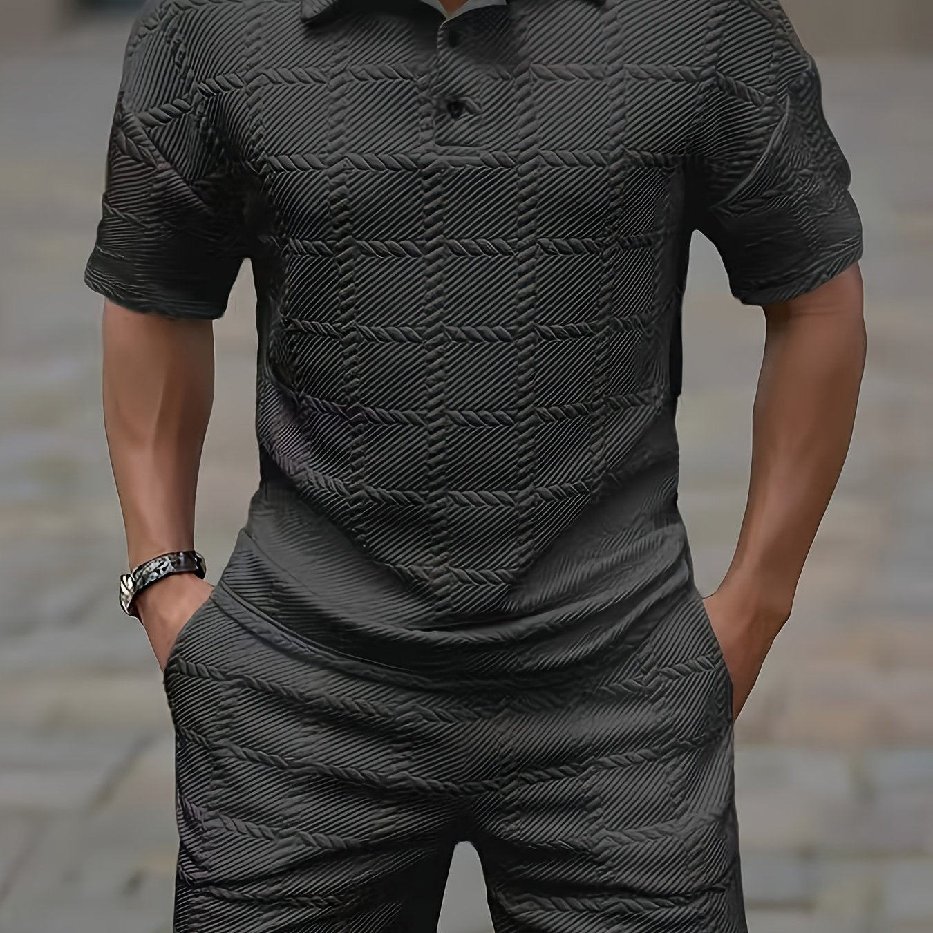Տղամարդկանց ամառային հանդերձանքի հավաքածու 2-կտորանոց ամուր հյուսվածքով դիզայնով, տղամարդկանց կարճաթև շապիկով գոլֆի վերնաշապիկ և էլաստիկ իրանով շորտեր գրպաններով