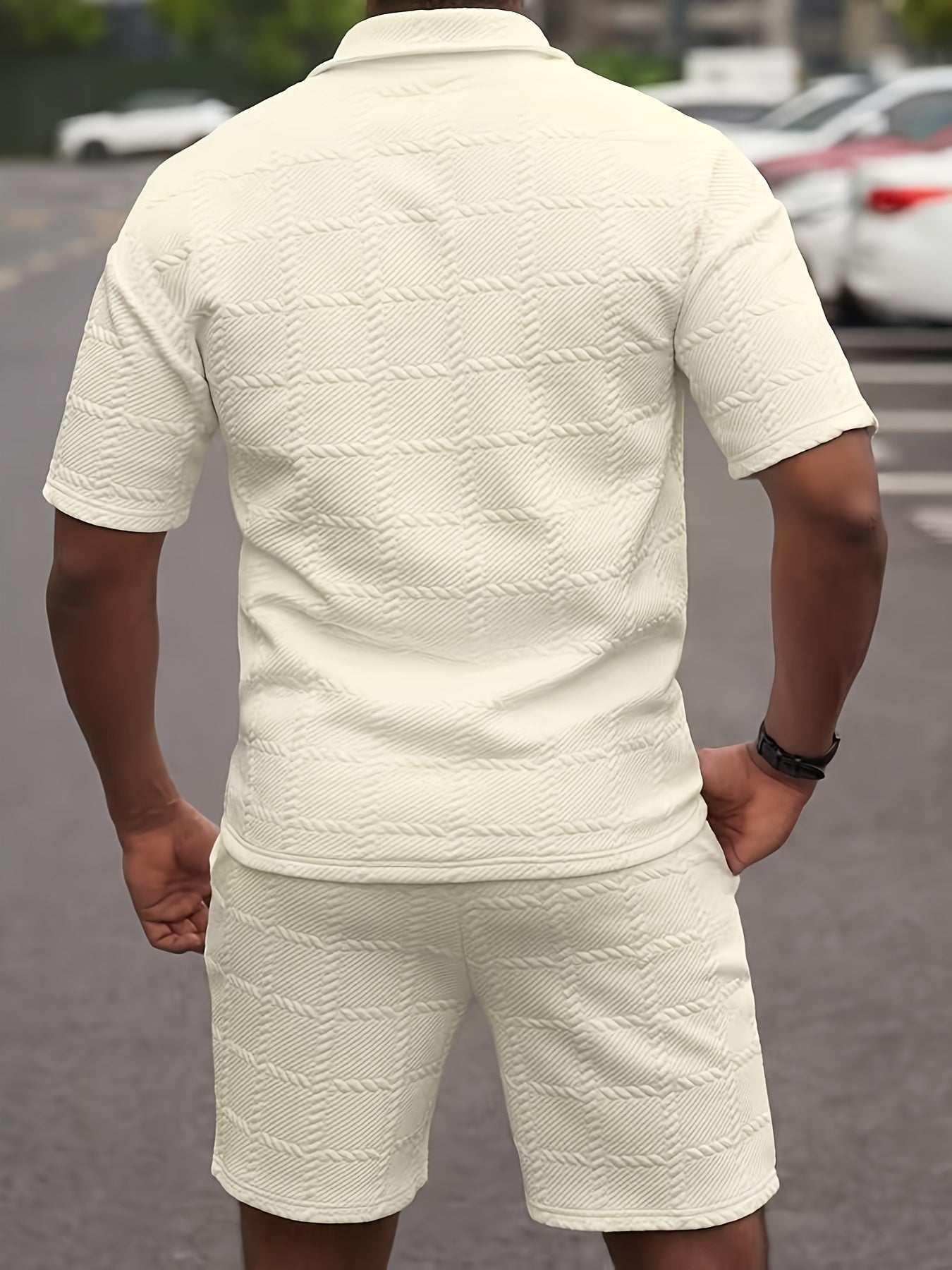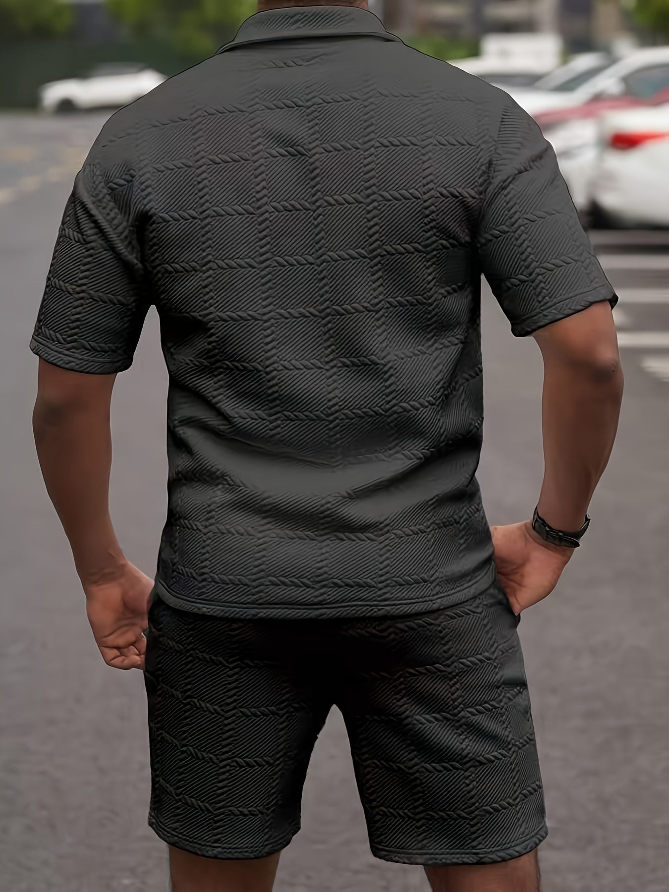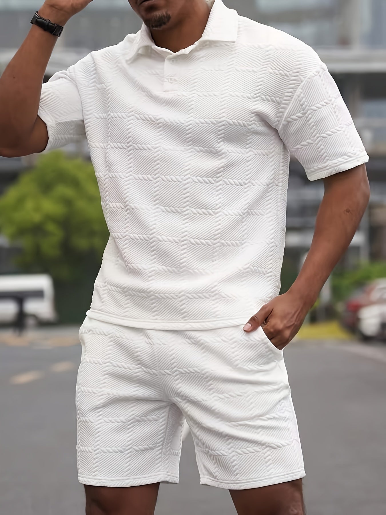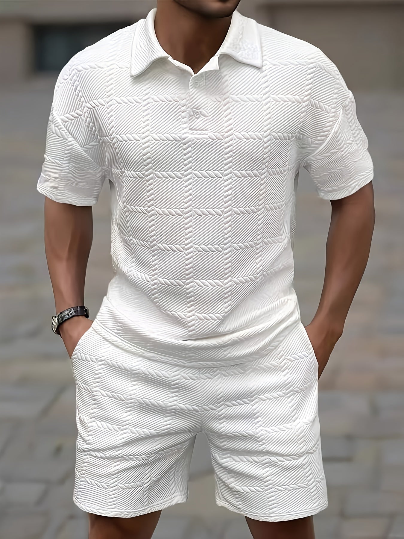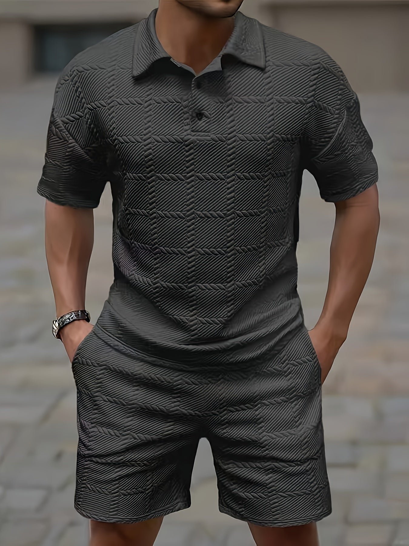 Տղամարդկանց ամառային հանդերձանքի հավաքածու 2-կտորանոց ամուր հյուսվածքով դիզայնով, տղամարդկանց կարճաթև շապիկով գոլֆի վերնաշապիկ և էլաստիկ իրանով շորտեր գրպաններով