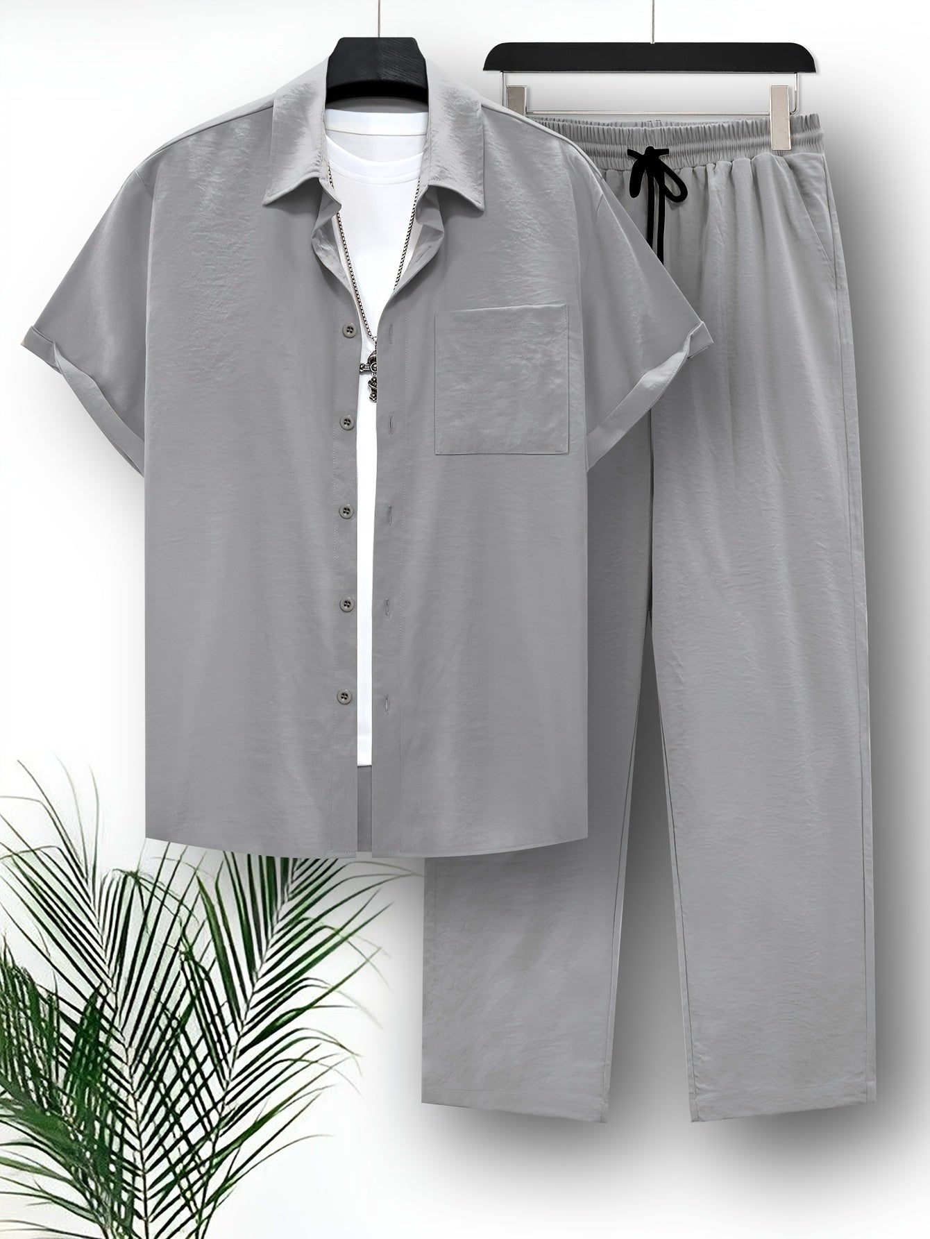 Տղամարդկանց 2-կտորանոց գարուն-ամառային հանգստի հանդերձանքի հավաքածու, տղամարդկանց կարճաթև շապիկ՝ կրծքավանդակի գրպանով և պինդ պարանով երկար տաբատի հավաքածու