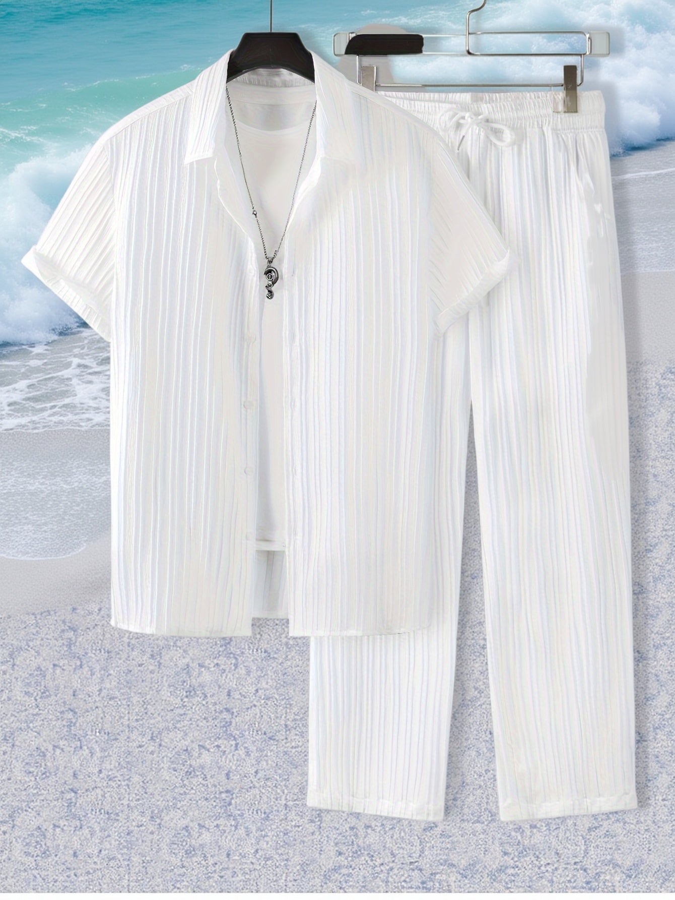 Տղամարդկանց ոճային գարուն-ամառային արձակուրդի 2 մասից բաղկացած հագուստի հավաքածու, տղամարդու կարճ թևքերով ծալքավոր վերնաշապիկ և երկար տաբատ՝ լարով