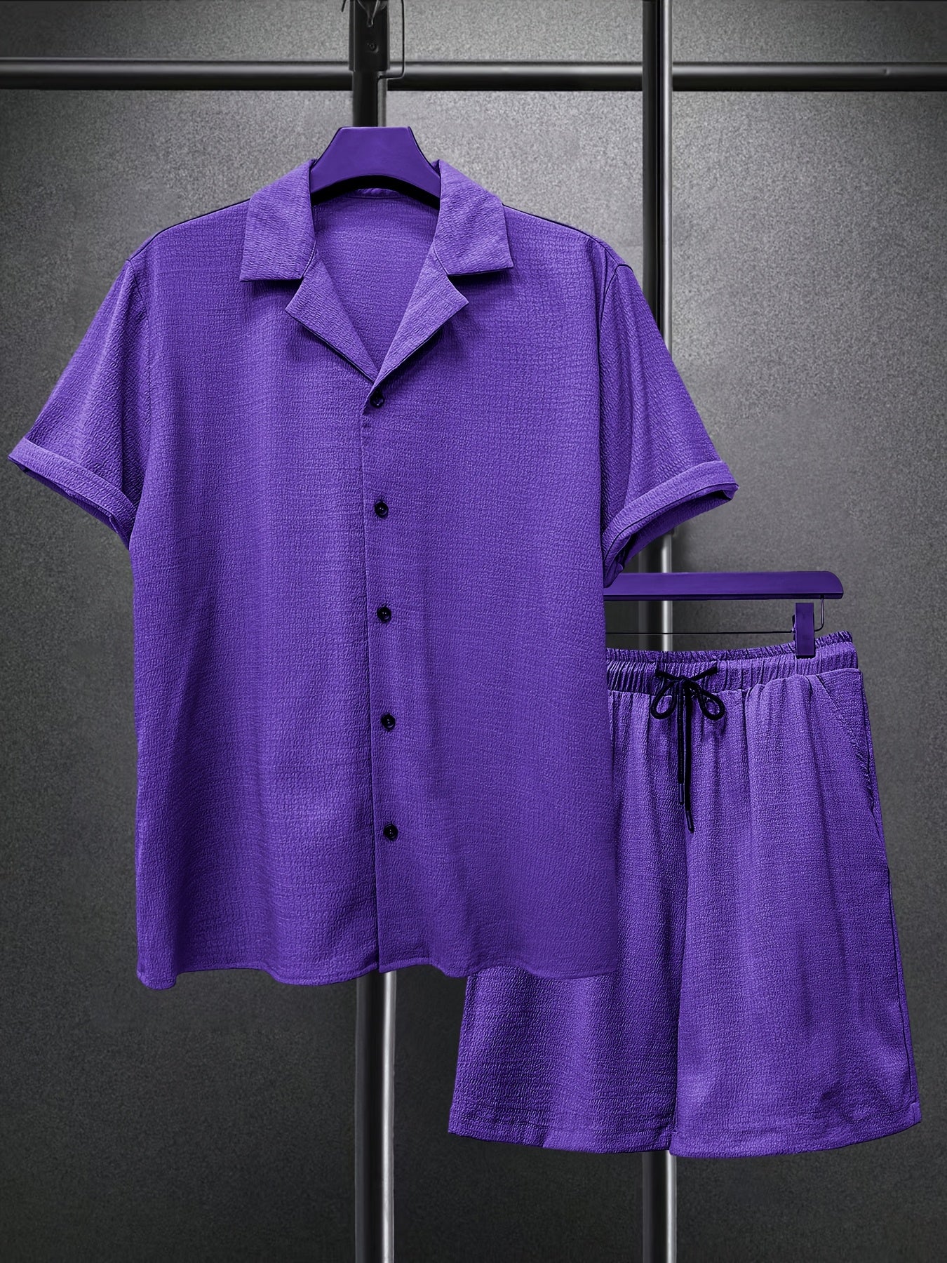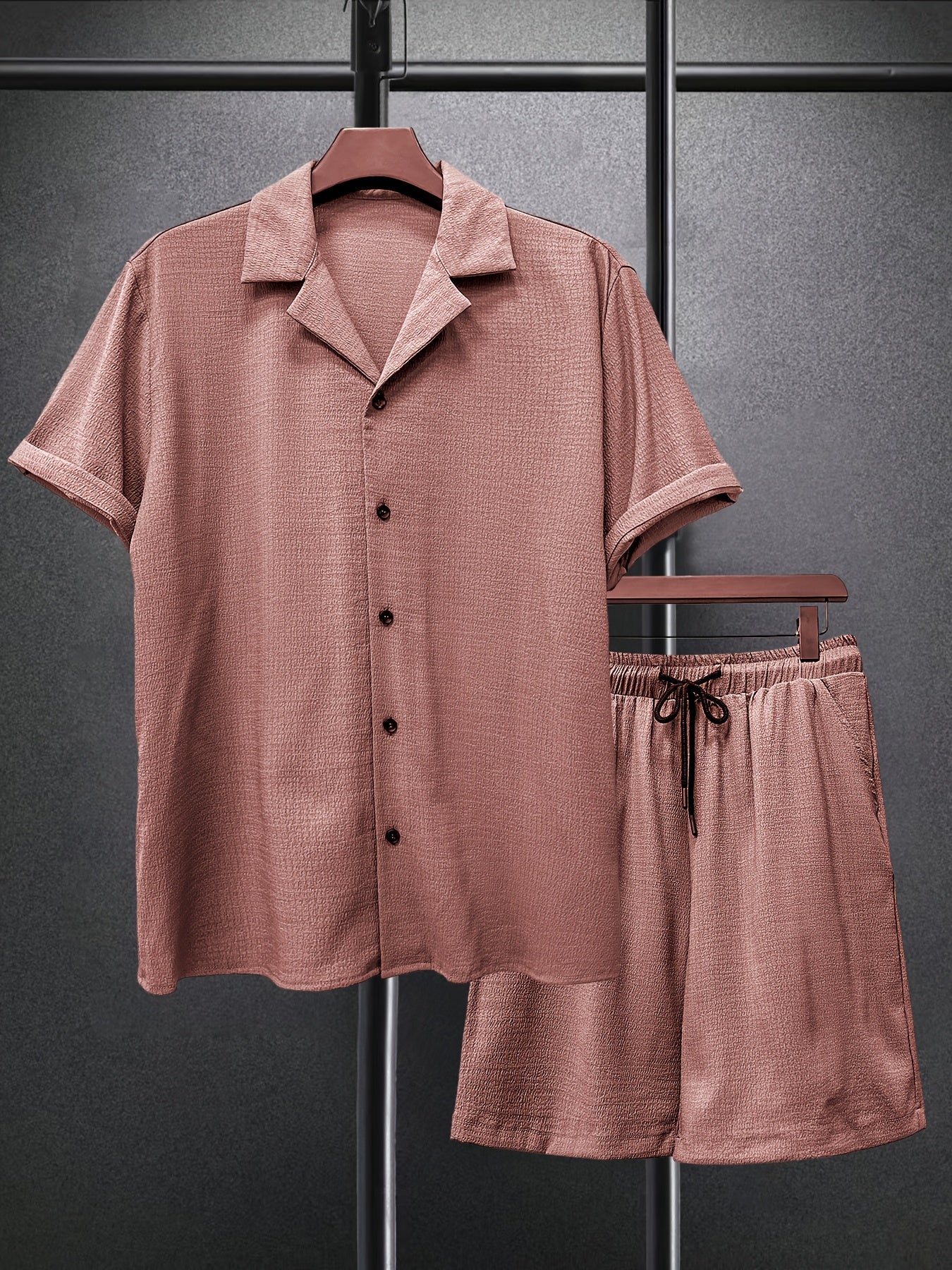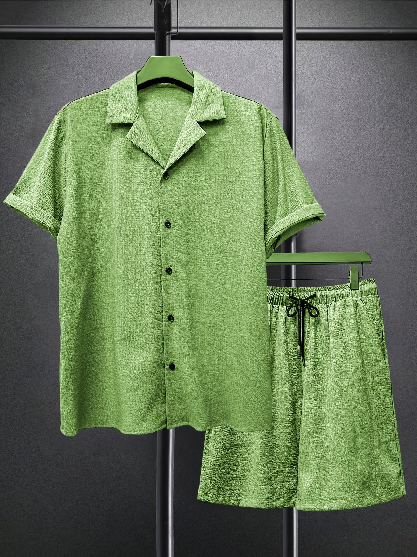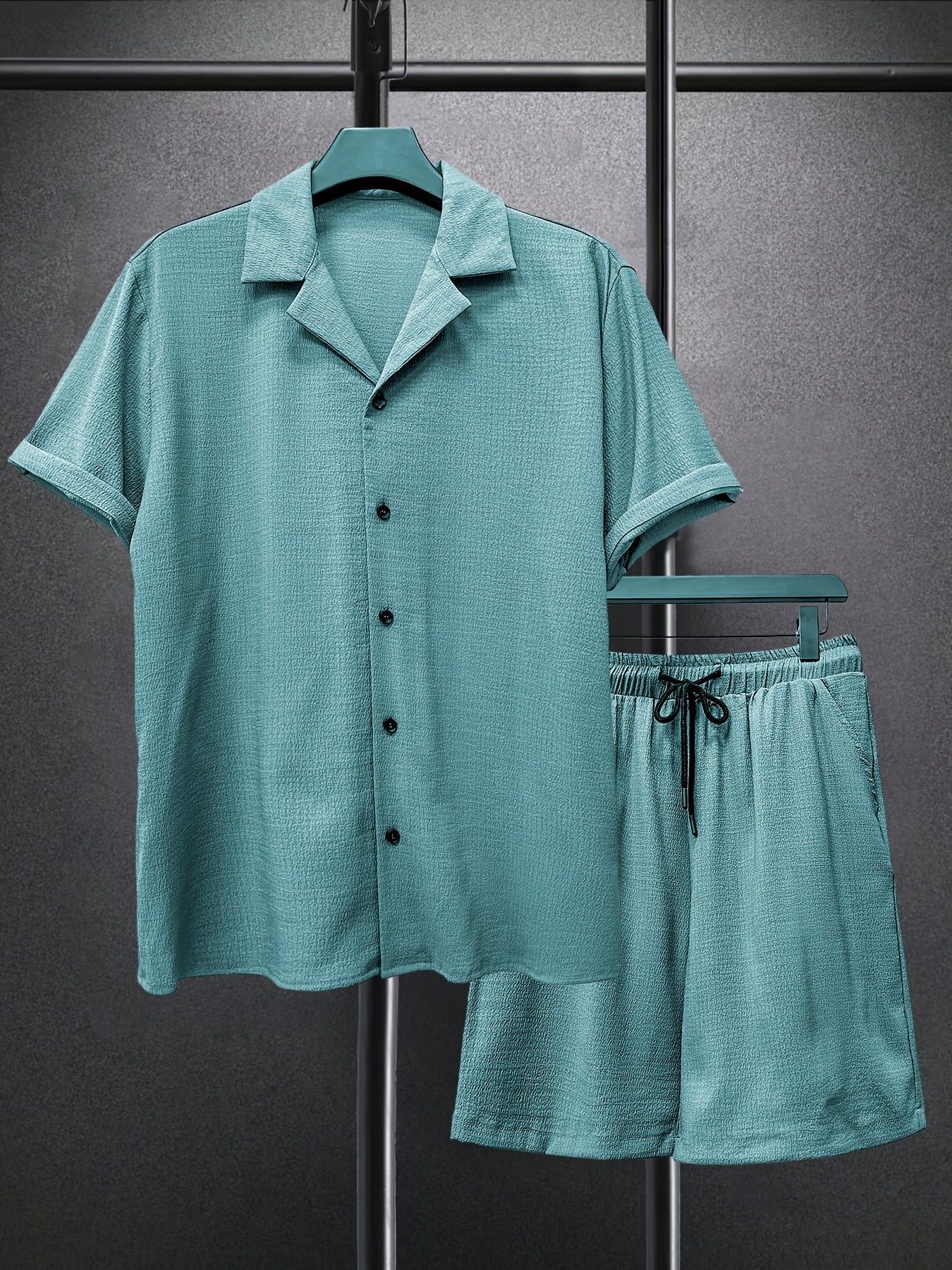 2025 spring and summer new small checkered texture shirt and shorts suit, casual solid color suit collar short-sleeved shirt and shorts Men's 2pcs suit, summer light top and pants Men's beach suit, daily outing, casual travel
