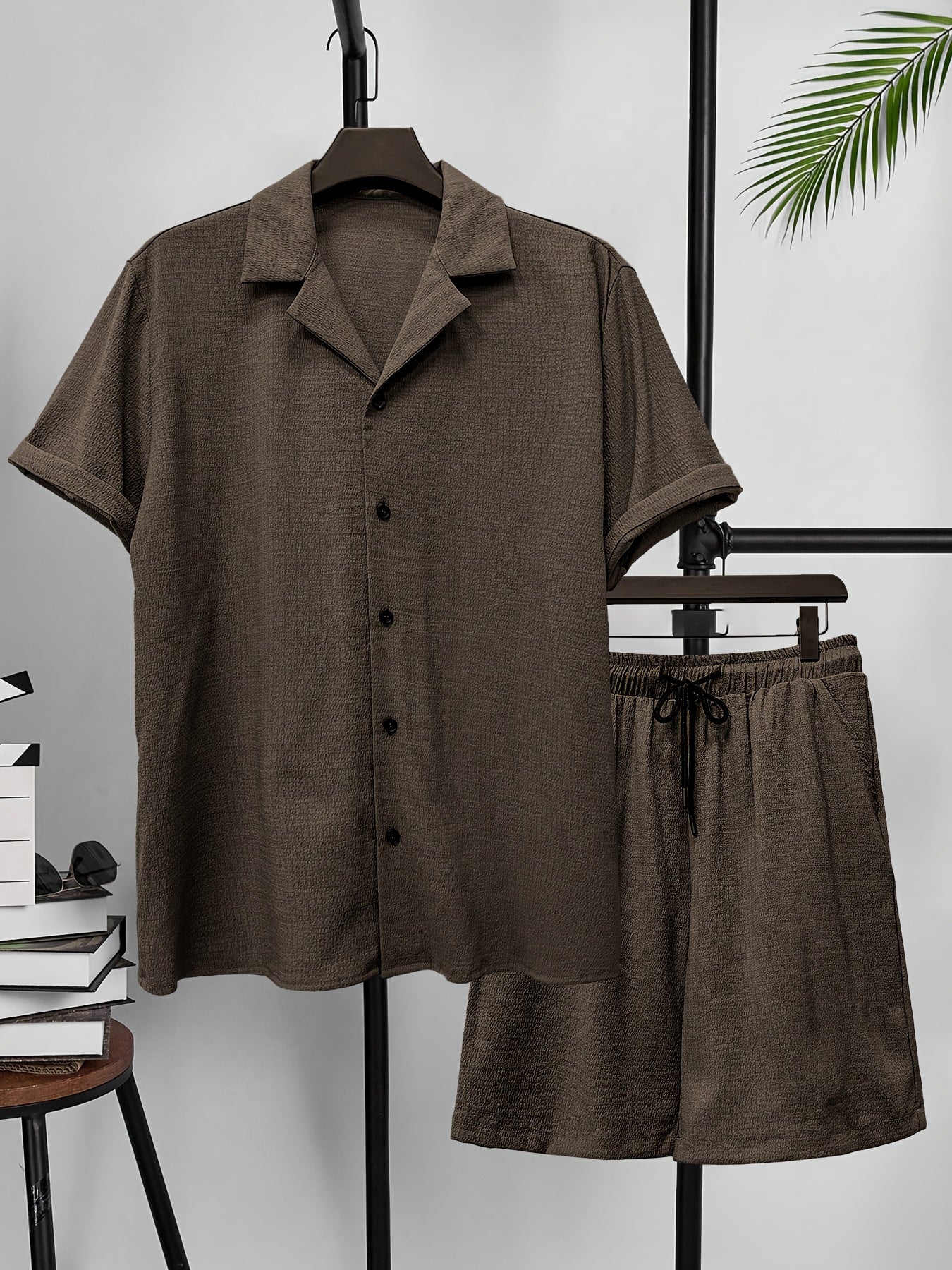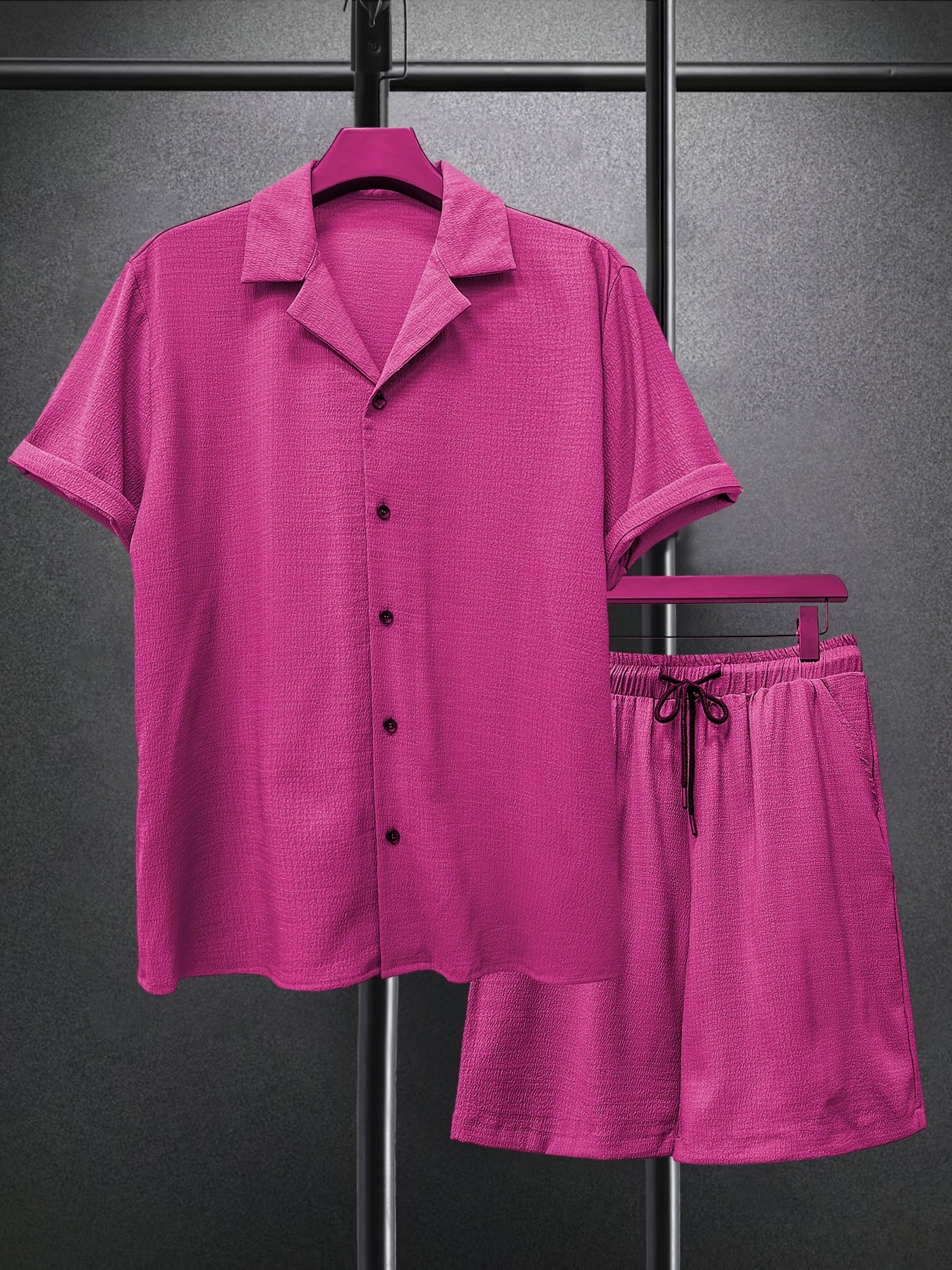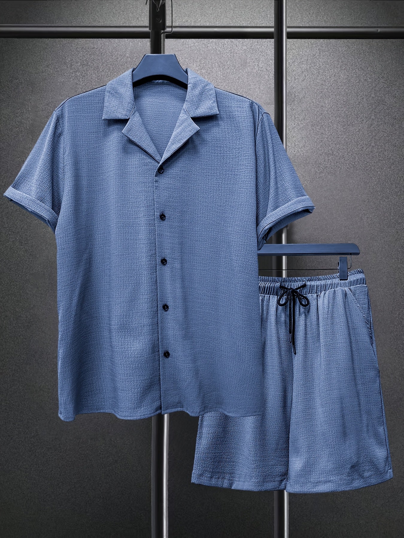 2025 spring and summer new small checkered texture shirt and shorts suit, casual solid color suit collar short-sleeved shirt and shorts Men's 2pcs suit, summer light top and pants Men's beach suit, daily outing, casual travel