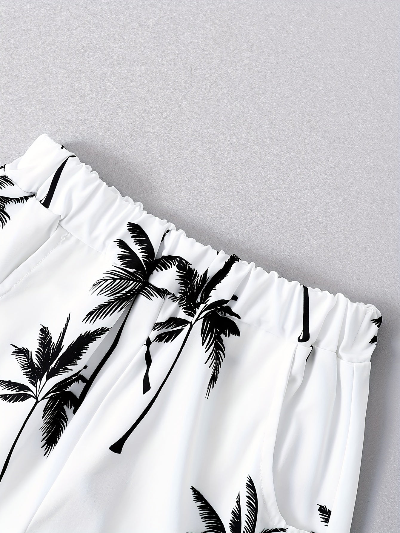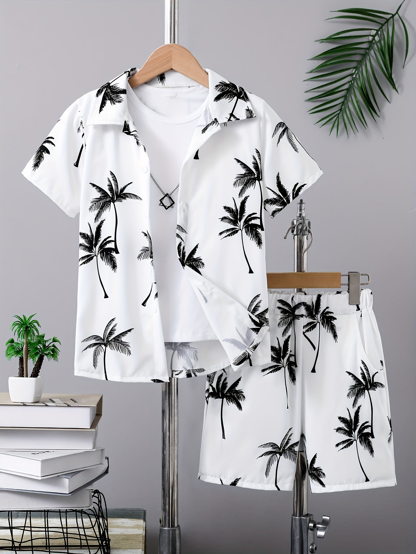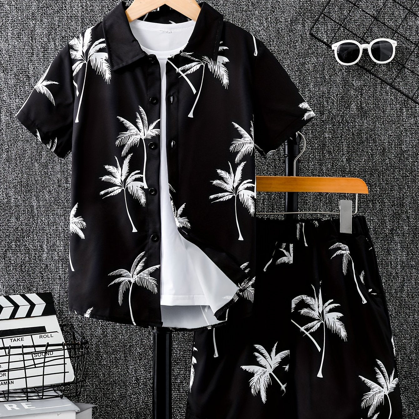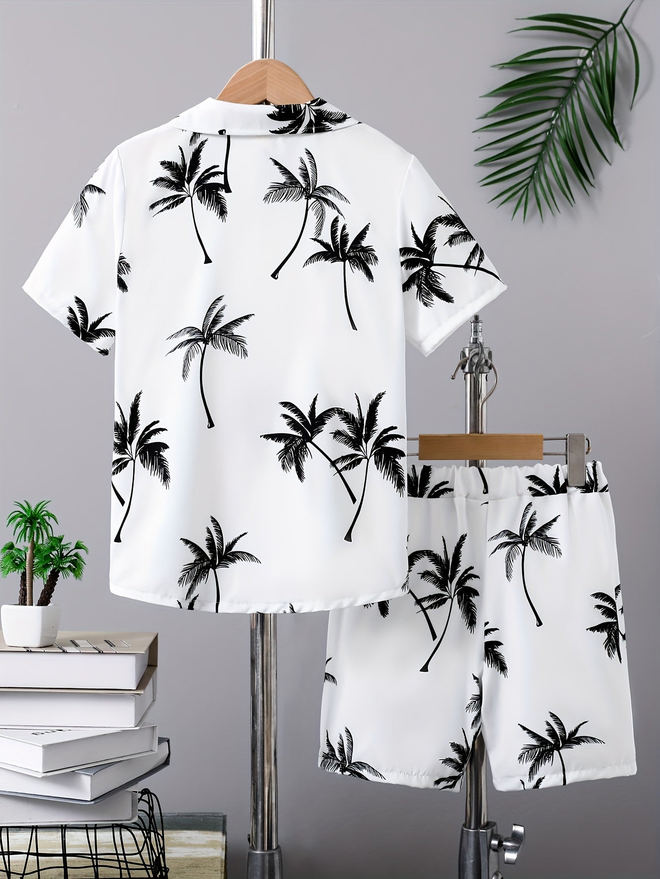 2 հատ տղաների համար նախատեսված կոկոսի ծառի գրաֆիկական նախշերով կարճ թևքով վերնաշապիկ և շորտերի հավաքածու, հարմարավետ ամառային տղաների հագուստ ամենօրյա և բացօթյա հագուստի համար