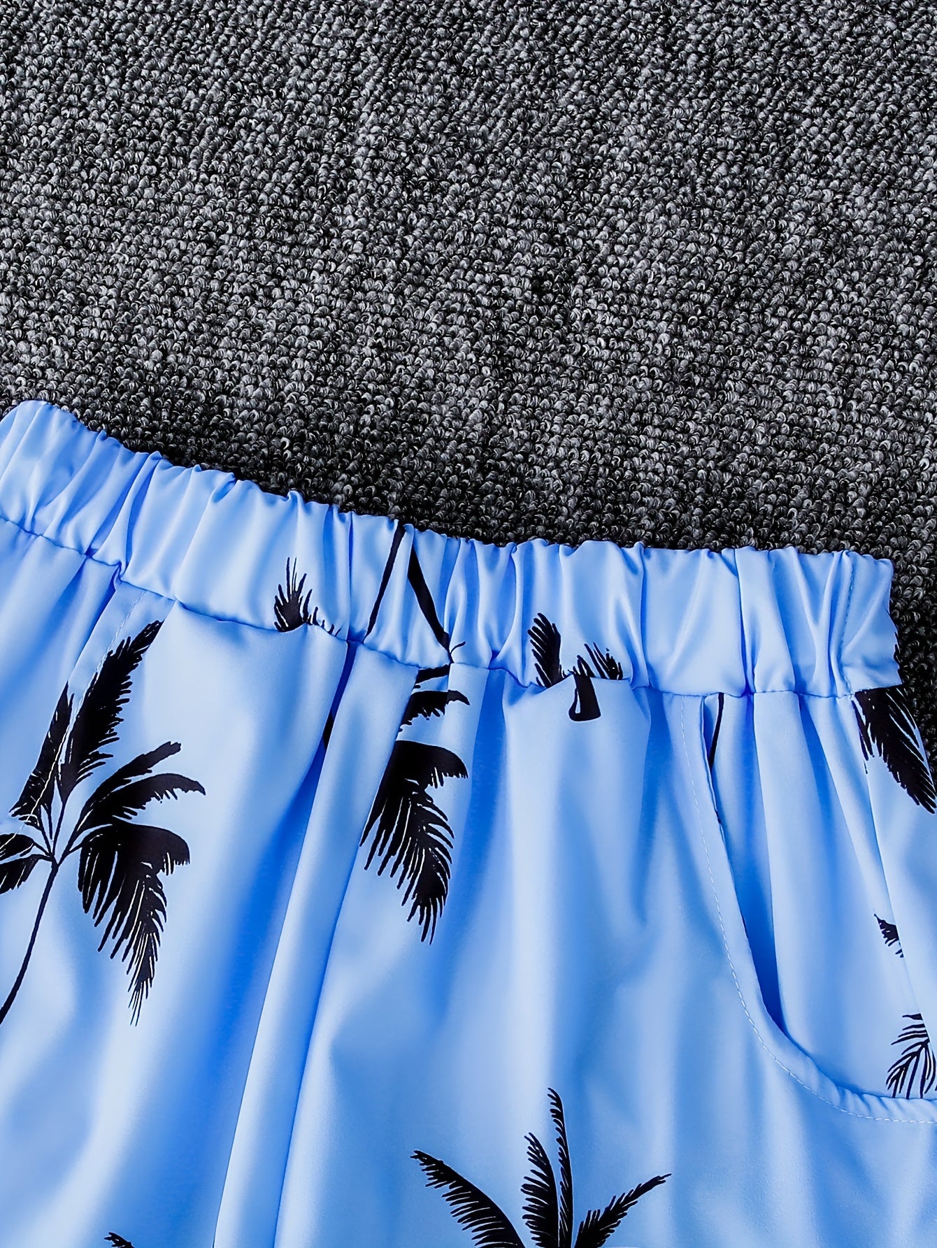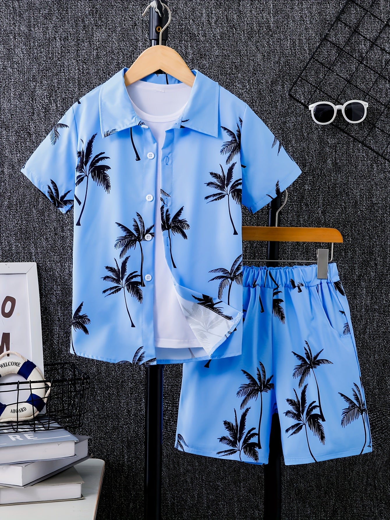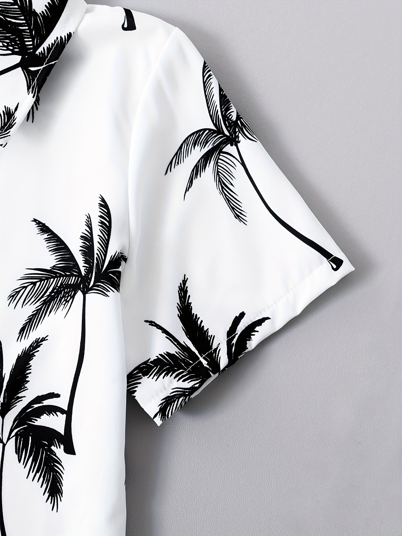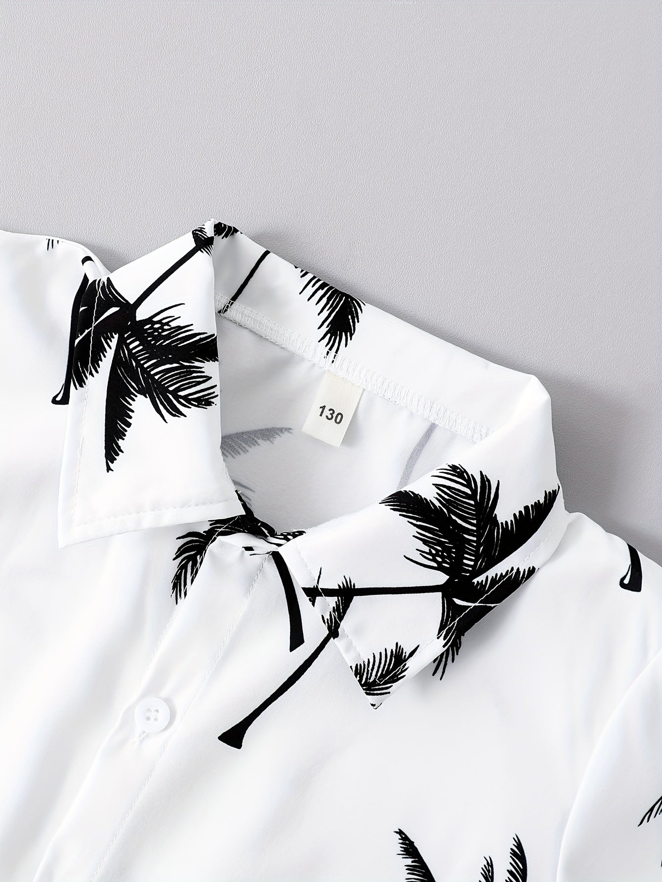 2 հատ տղաների համար նախատեսված կոկոսի ծառի գրաֆիկական նախշերով կարճ թևքով վերնաշապիկ և շորտերի հավաքածու, հարմարավետ ամառային տղաների հագուստ ամենօրյա և բացօթյա հագուստի համար