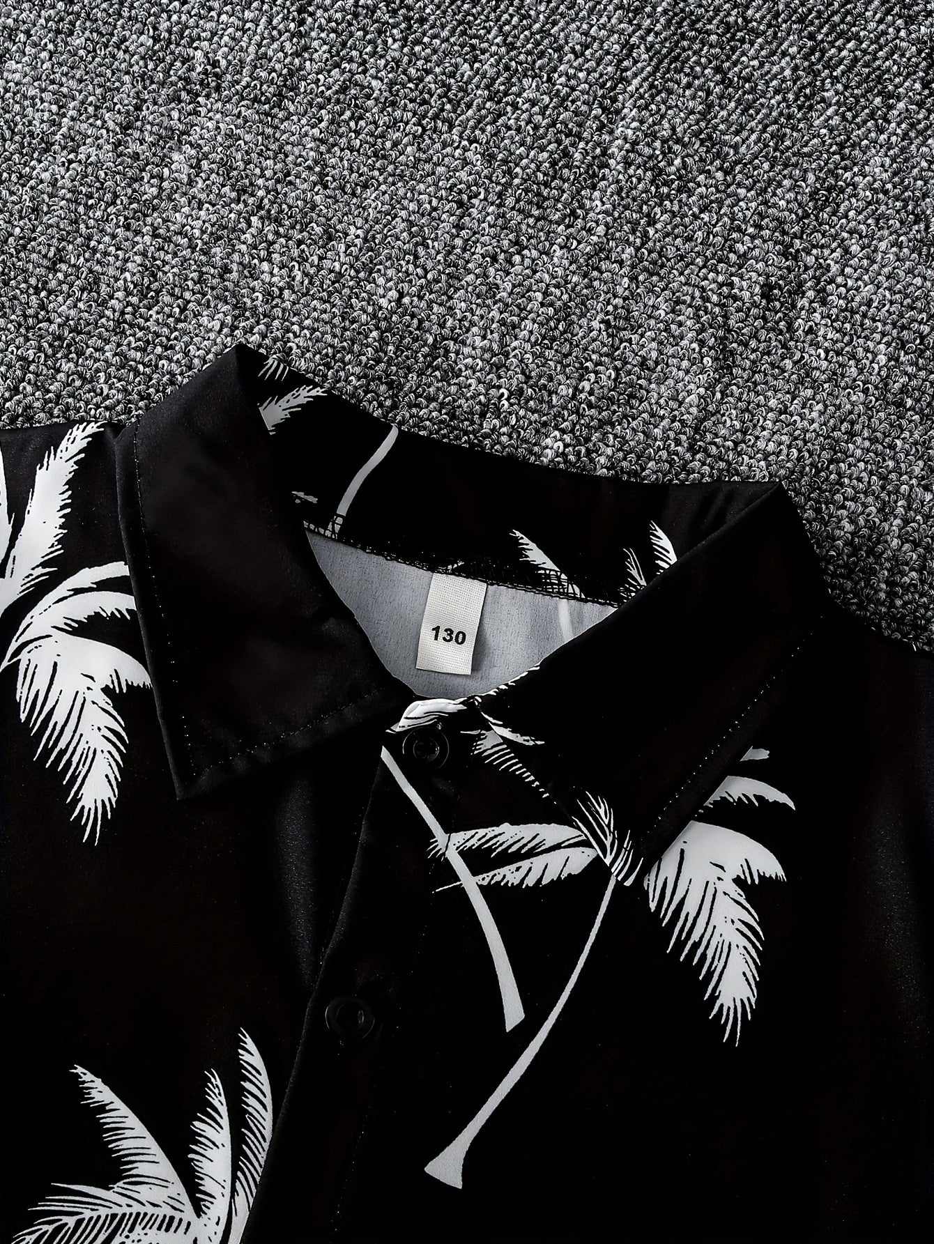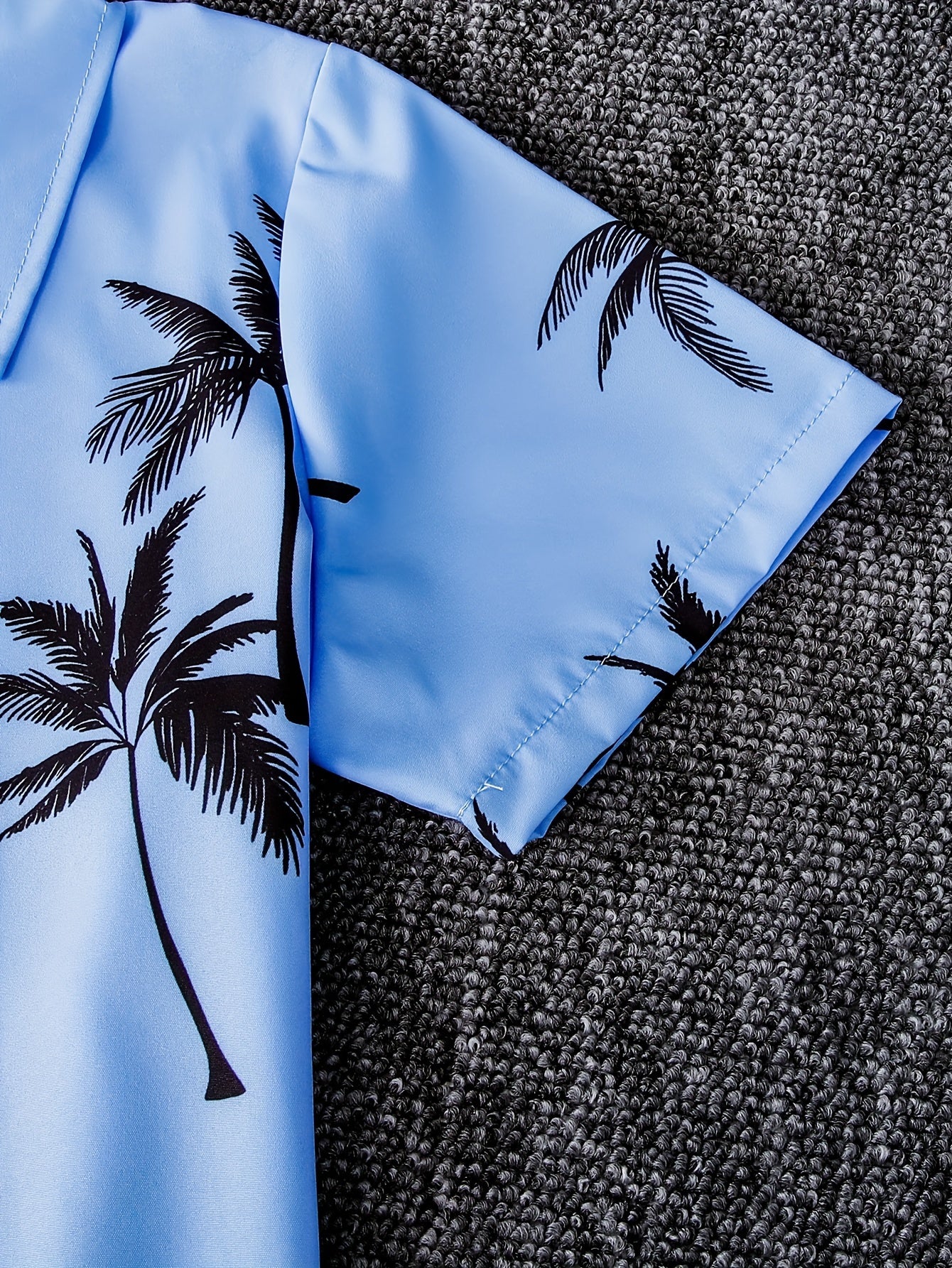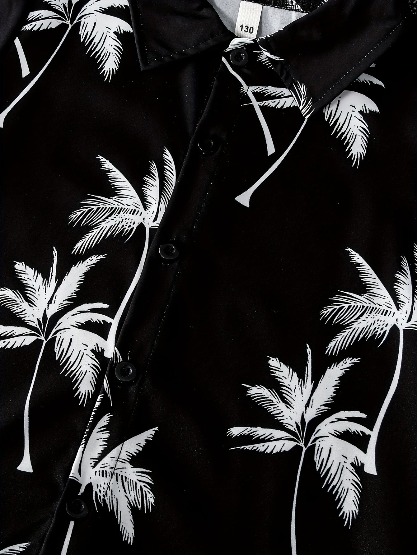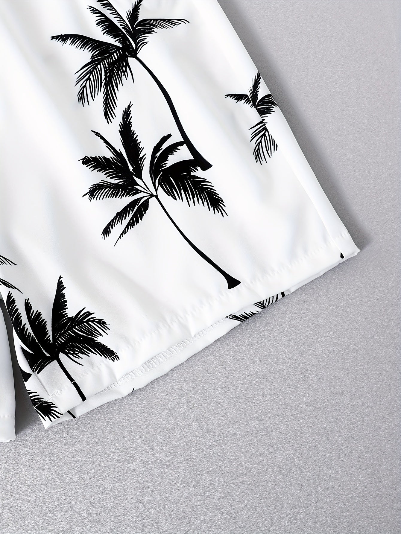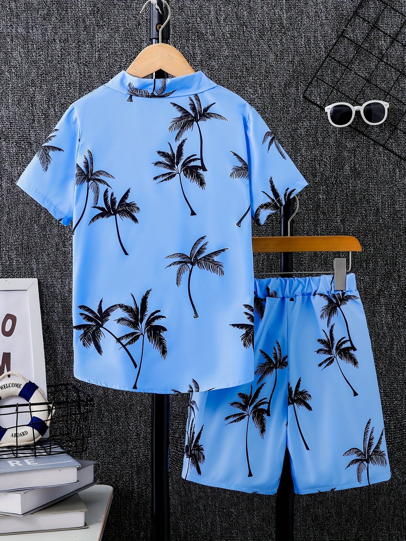 2 հատ տղաների համար նախատեսված կոկոսի ծառի գրաֆիկական նախշերով կարճ թևքով վերնաշապիկ և շորտերի հավաքածու, հարմարավետ ամառային տղաների հագուստ ամենօրյա և բացօթյա հագուստի համար