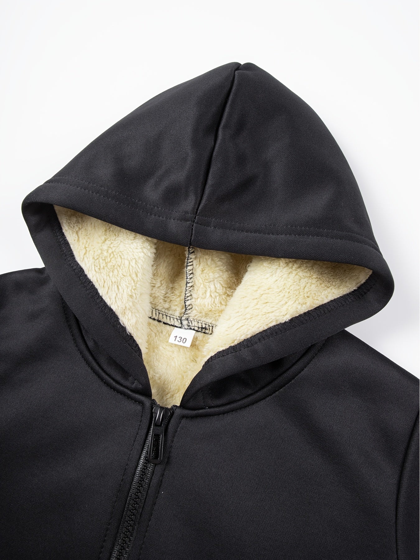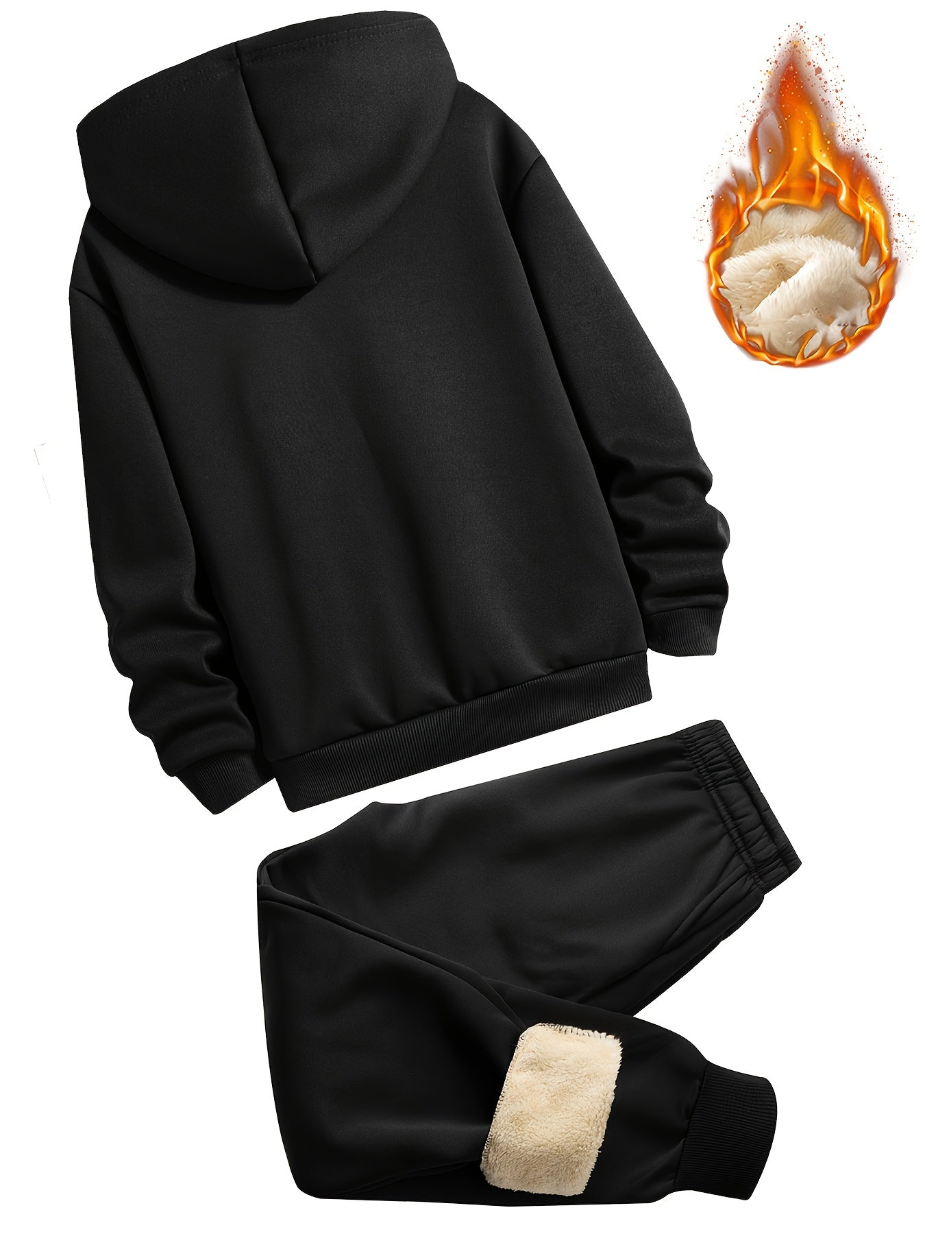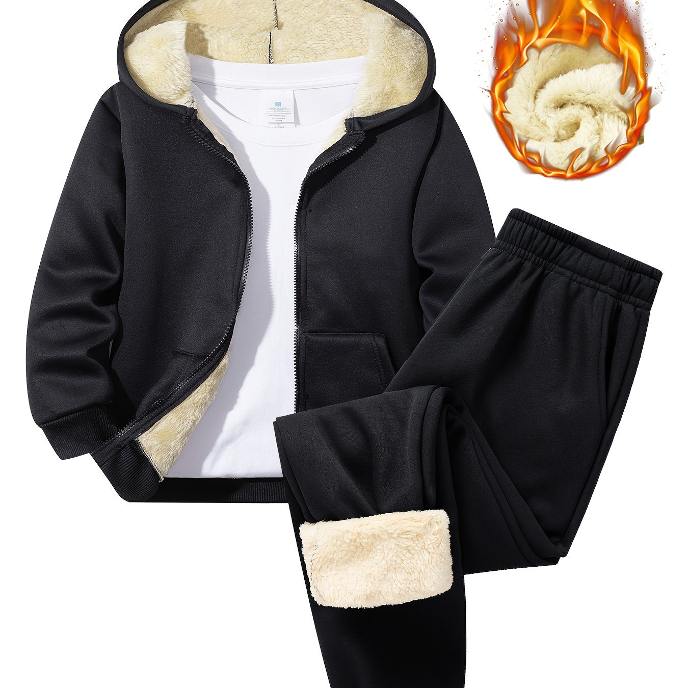 2 հատ տղաների համար նախատեսված բրդյա աստառով գլխարկով սվիտեր + առօրյա տաբատների հավաքածու, միագույն երկարաթև, կայծակաճարմանդով վերնաշապիկ՝ միջին ձգվողության տաք գործվածքից, աշուն/ձմեռ սեզոնի համար, իդեալական է