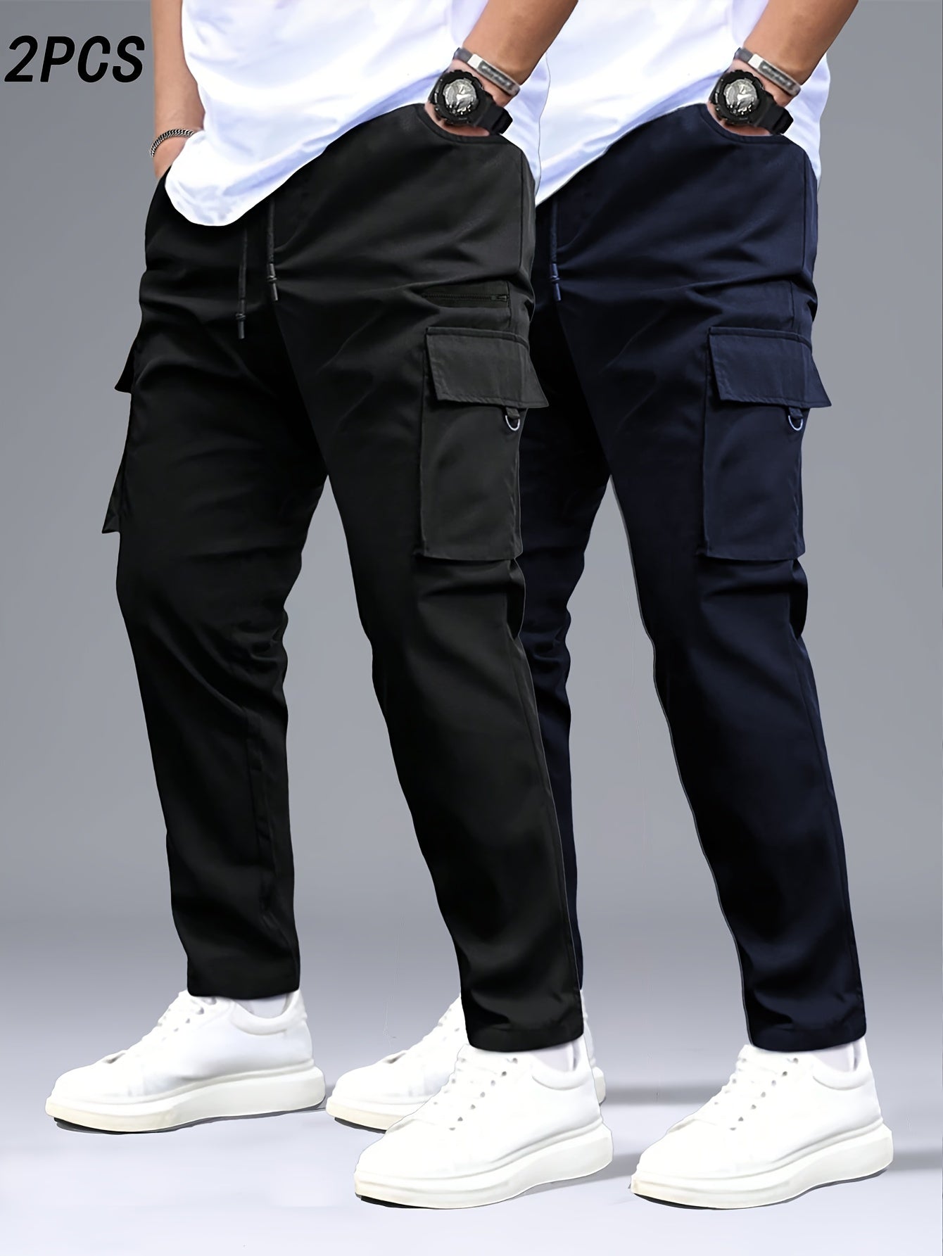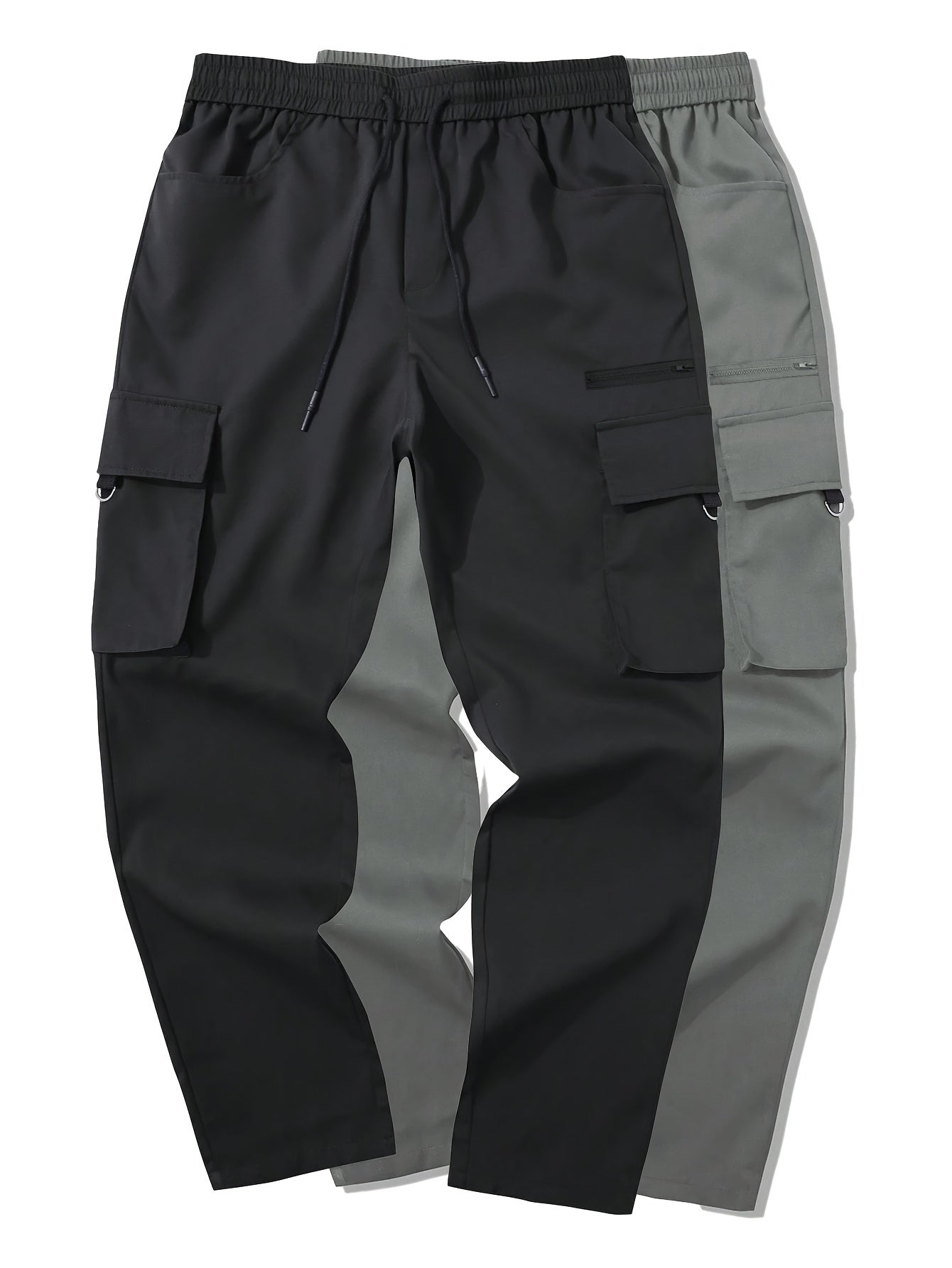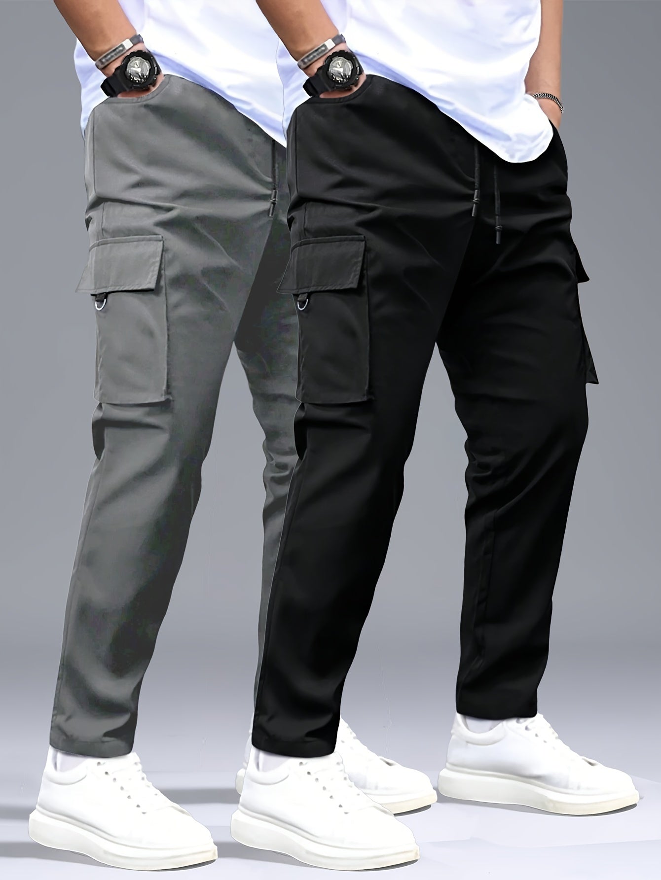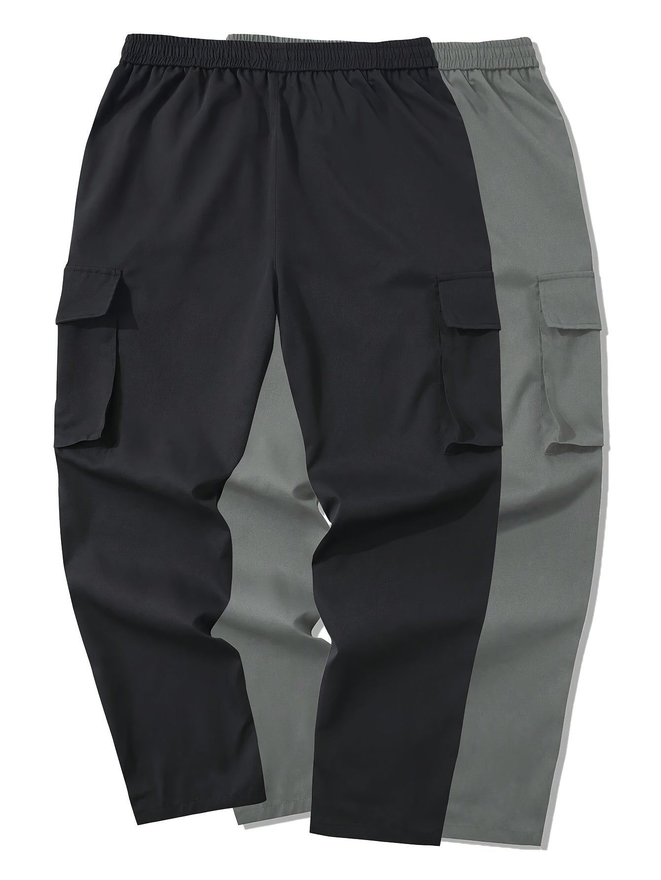 2 հատ Տղամարդկանց բեռների շալվար, սև և մոխրագույն գոտկատեղով և բազմաթիվ գրպաններով, դիմացկուն պոլիեսթեր, իդեալական բացօթյա գործունեության և ամենօրյա հագուստի համար, ամենօրյա հագուստի շալվար | Multiple Pocket Design | Երկարակյաց գործվածքից շալվար