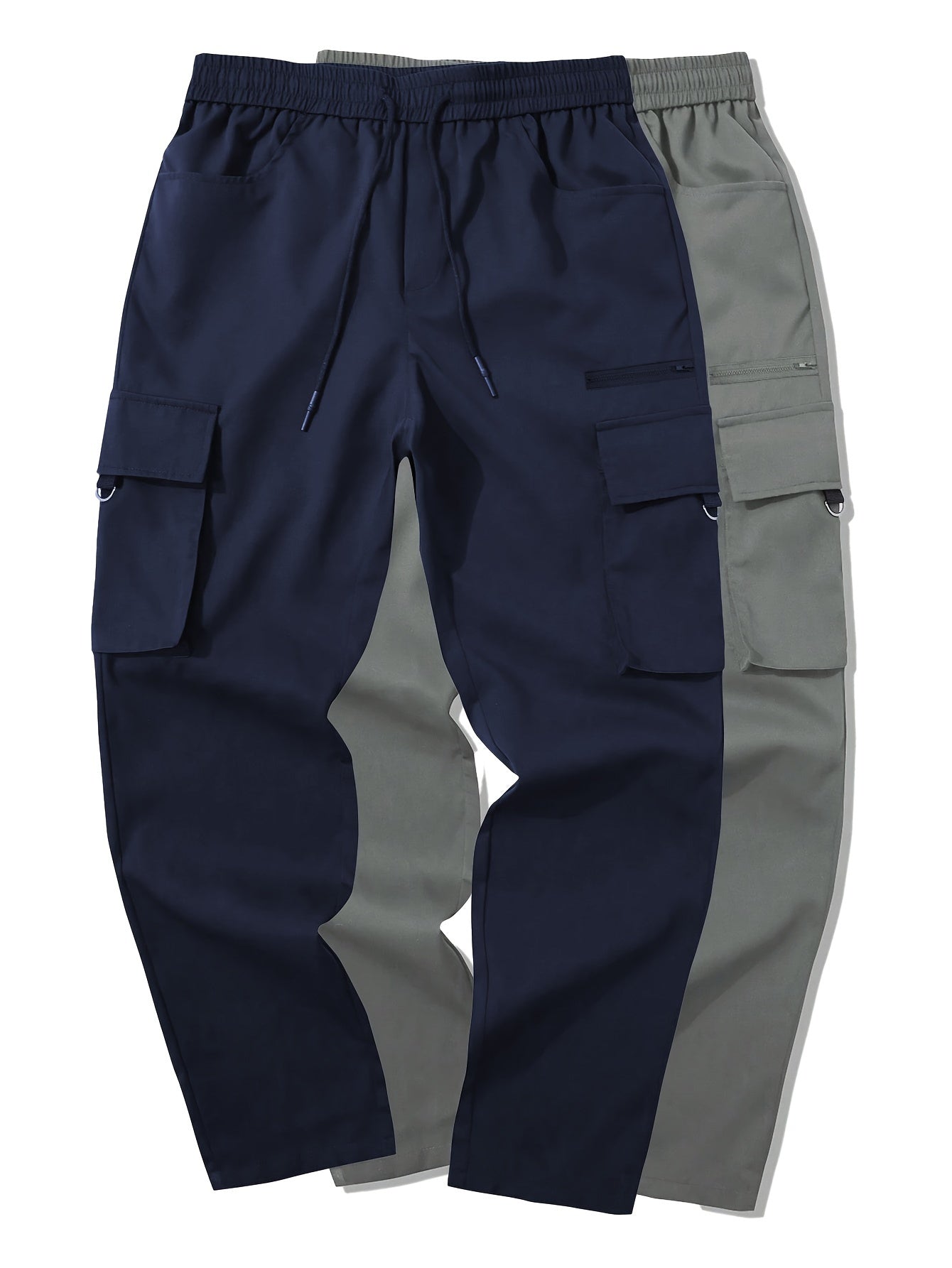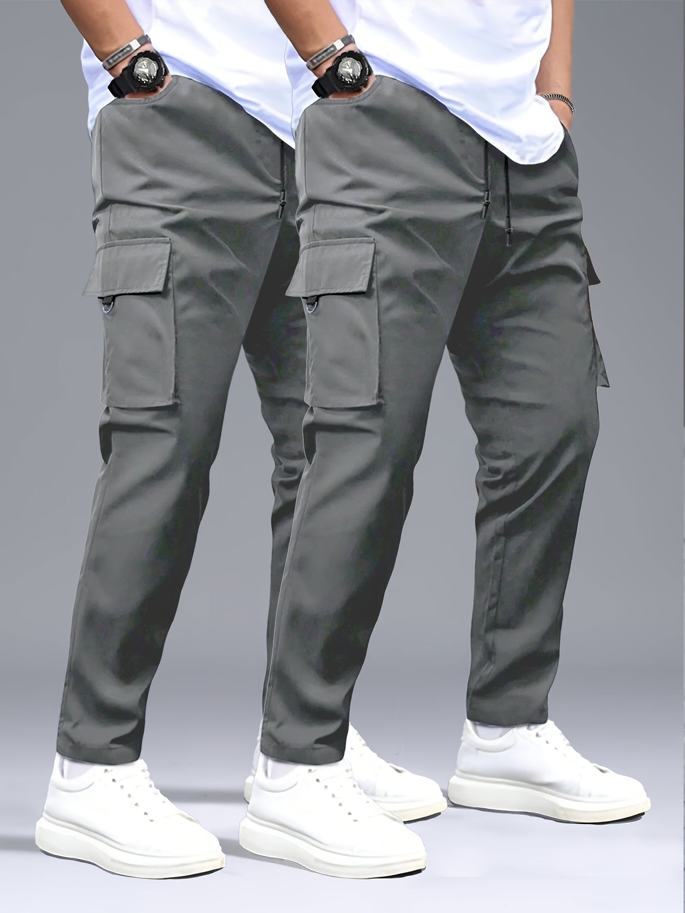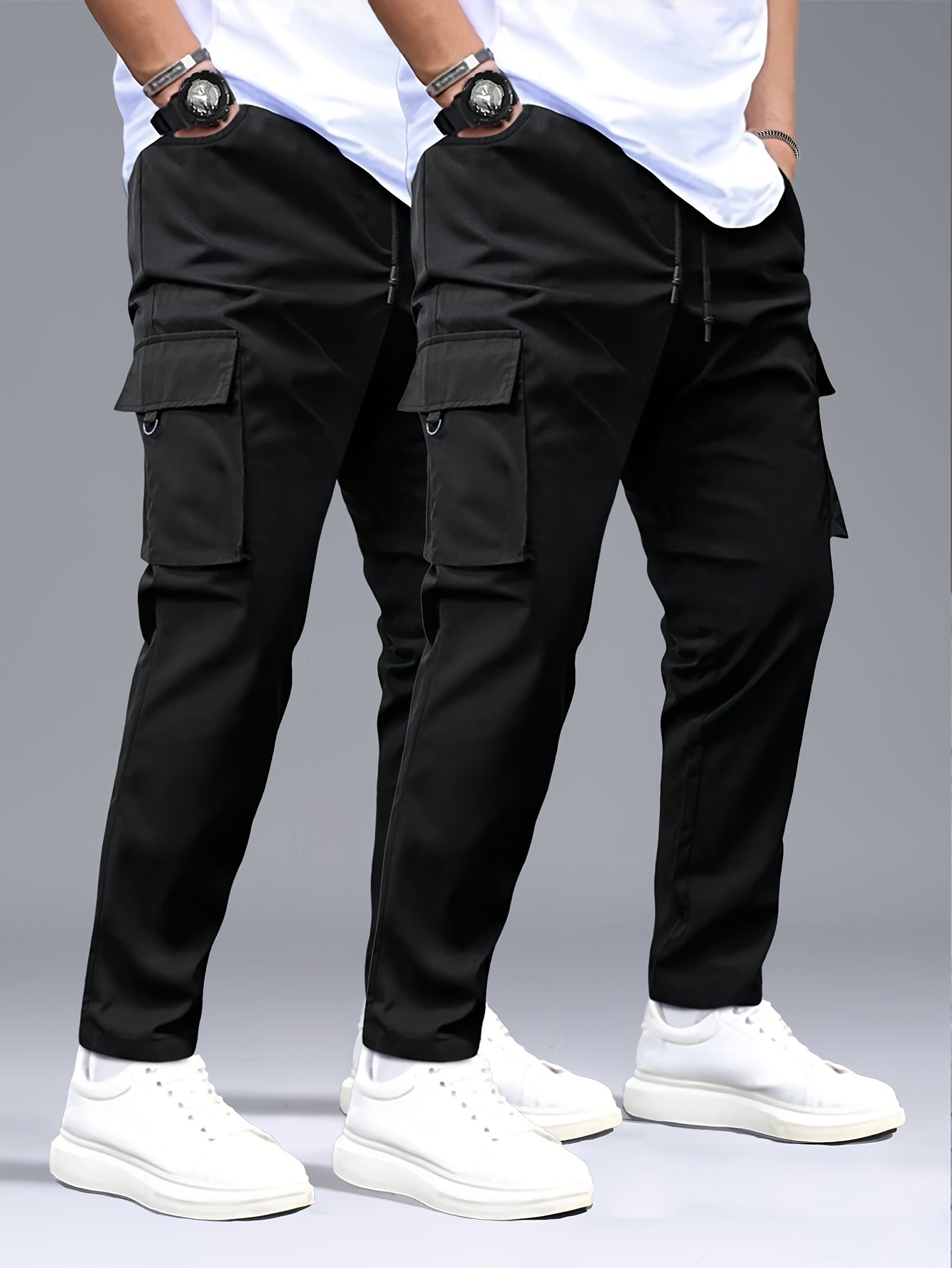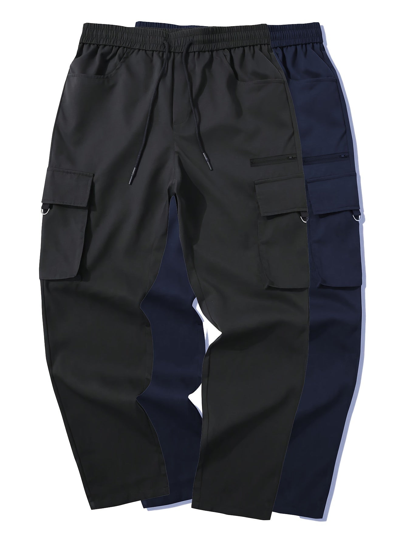 2 հատ Տղամարդկանց բեռների շալվար, սև և մոխրագույն գոտկատեղով և բազմաթիվ գրպաններով, դիմացկուն պոլիեսթեր, իդեալական բացօթյա գործունեության և ամենօրյա հագուստի համար, ամենօրյա հագուստի շալվար | Multiple Pocket Design | Երկարակյաց գործվածքից շալվար