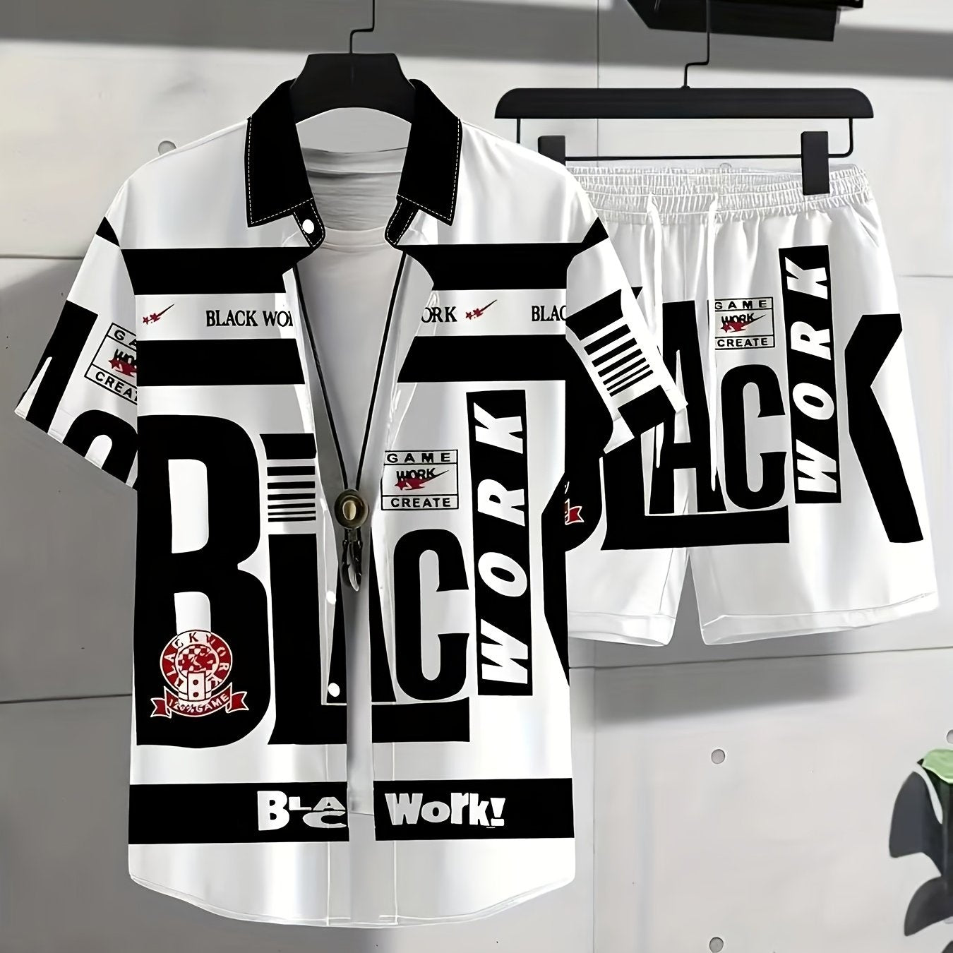 2 հատ տղամարդու առօրյա մեկնման վերնաշապիկի հավաքածու՝ 3D թվային տպագրությամբ, տպագիր օձիքով վերնաշապիկի և շորտերի հավաքածու՝ թեթևակի առաձգականությամբ և կոճակներով։