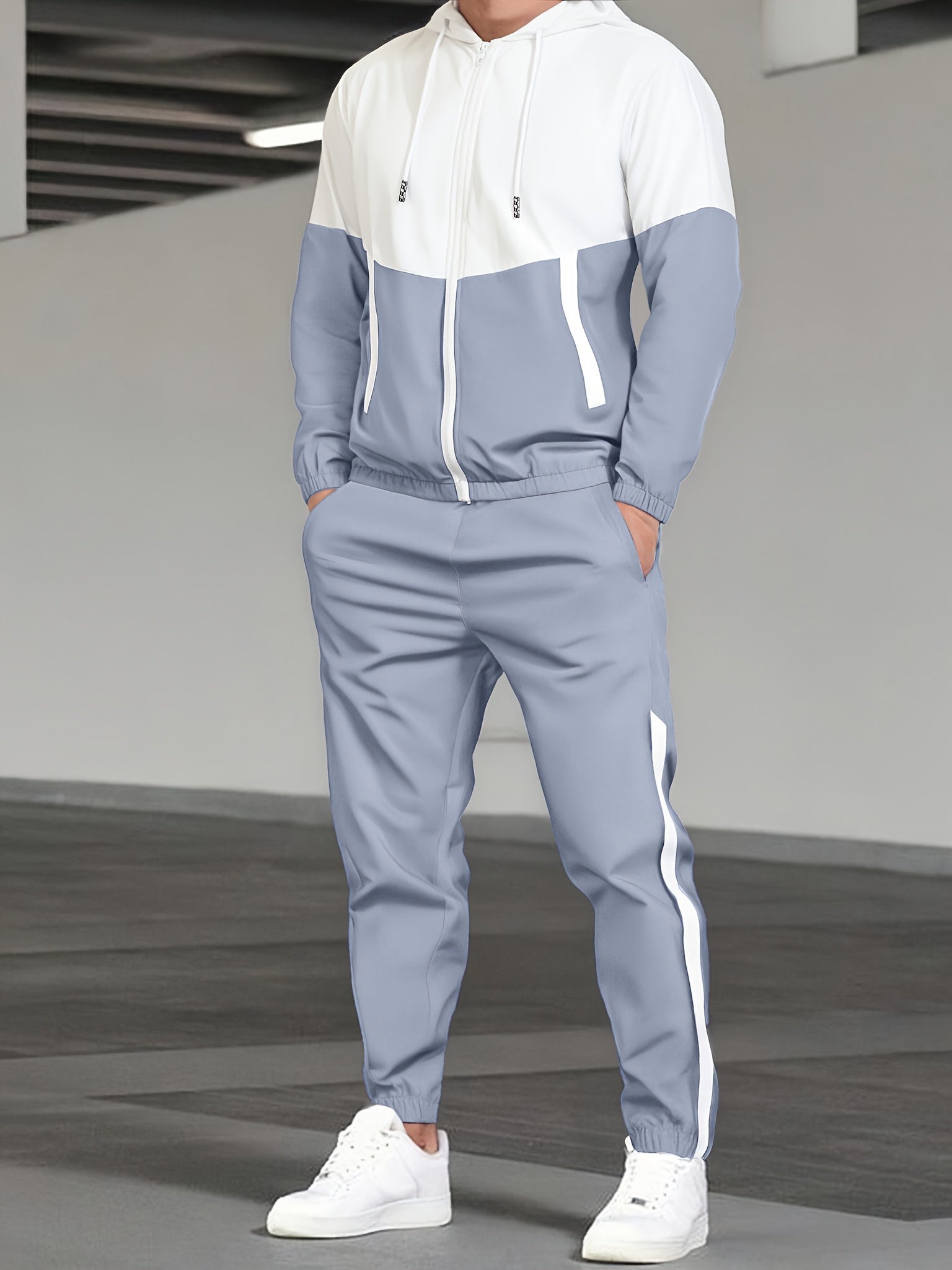 2pcs Men'S Casual Sportswear Set - Color Block Hooded Jacket and Pants, Polyester, Machine Washable, All-Season, with Pockets, Regular Fit, Spring Sportswear|Hooded Sportswear|Machine Washable Fabric