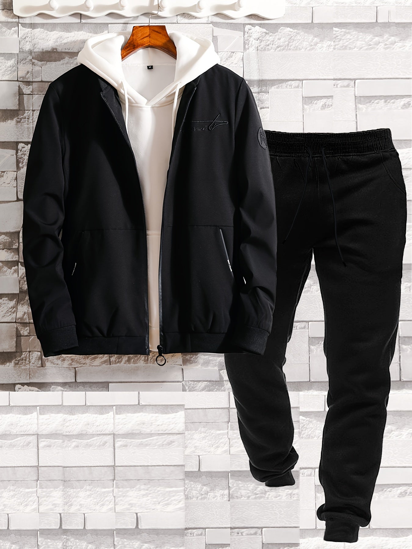 Տղամարդկանց դասական բոմբեր բաճկոնների և վազքի տաբատների հավաքածու 2 հատ - Նրբագեղ սև տառերով ասեղնագործությամբ, առաձգական մանժետներով և գոտկատեղով, դիմացկուն պոլիեսթեր, կատարյալ բացօթյա գործունեության և ամենօրյա հագուստի համար, վազքի կոստյումներ