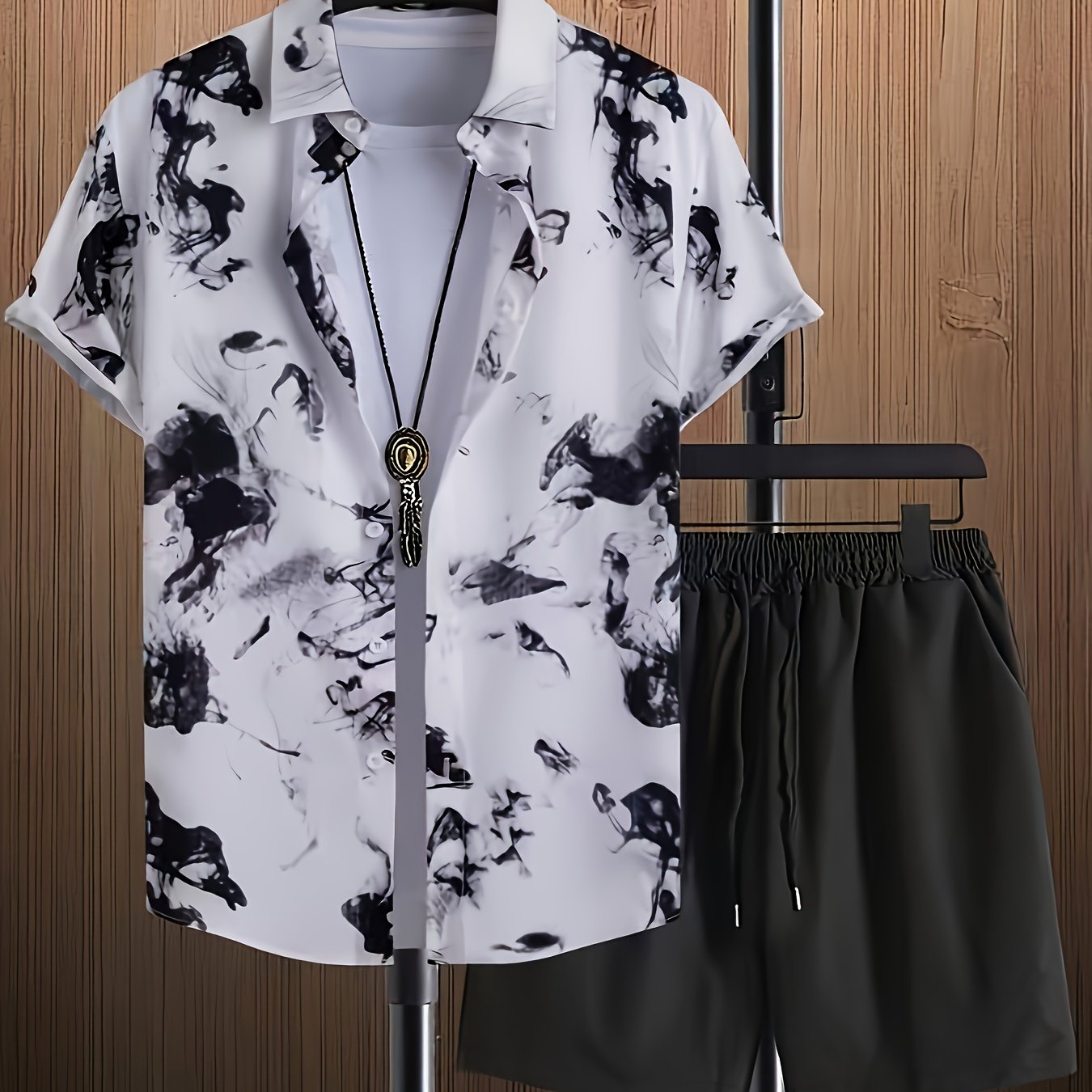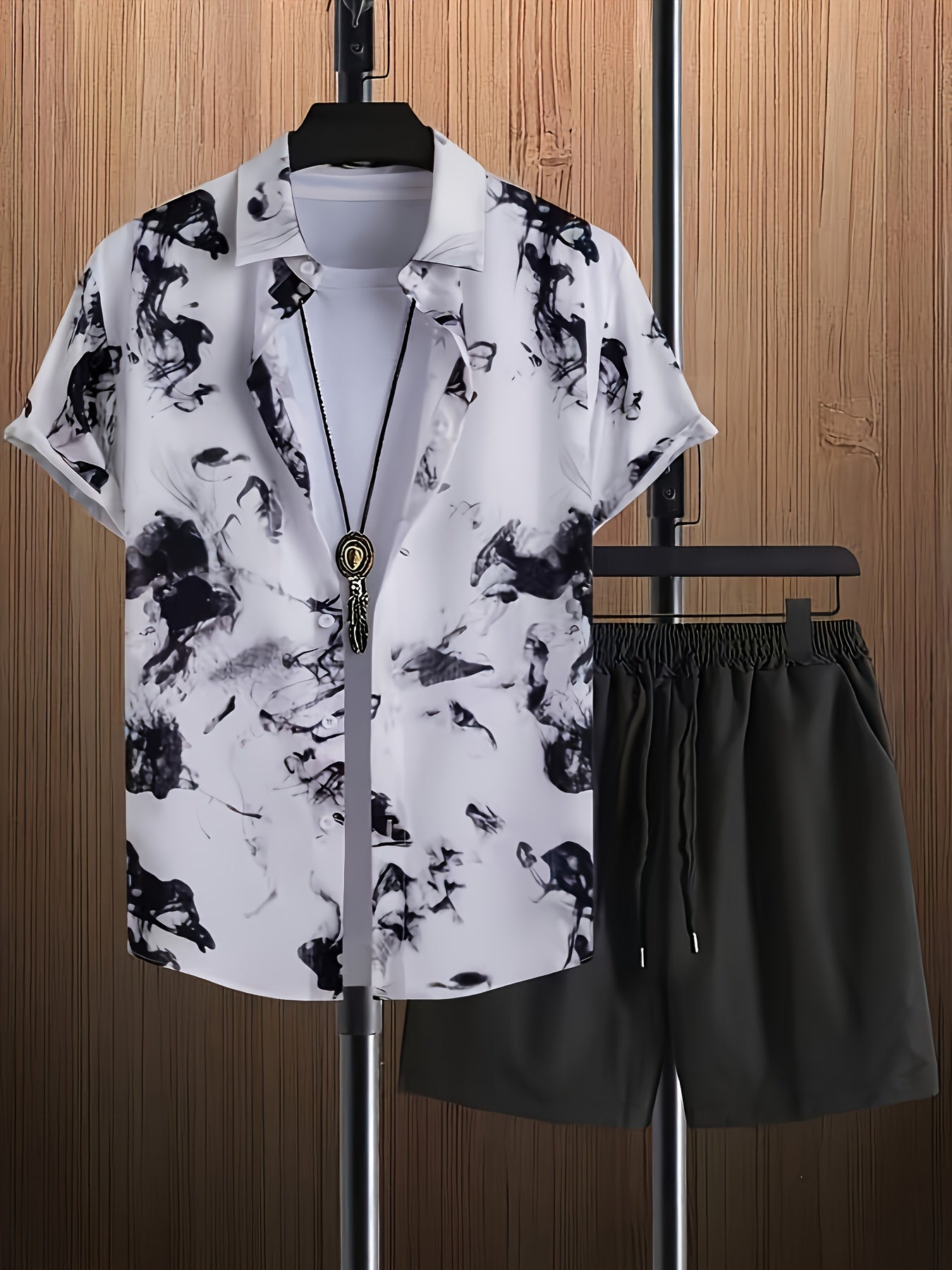 2 հատ, տղամարդու կարճ թևքով, կոճակներով օձիքով վերնաշապիկ, տպագիր նախշով, զուգորդված լարով շորտերի հետ, տղամարդու նորաձև, առօրյա հագուստ