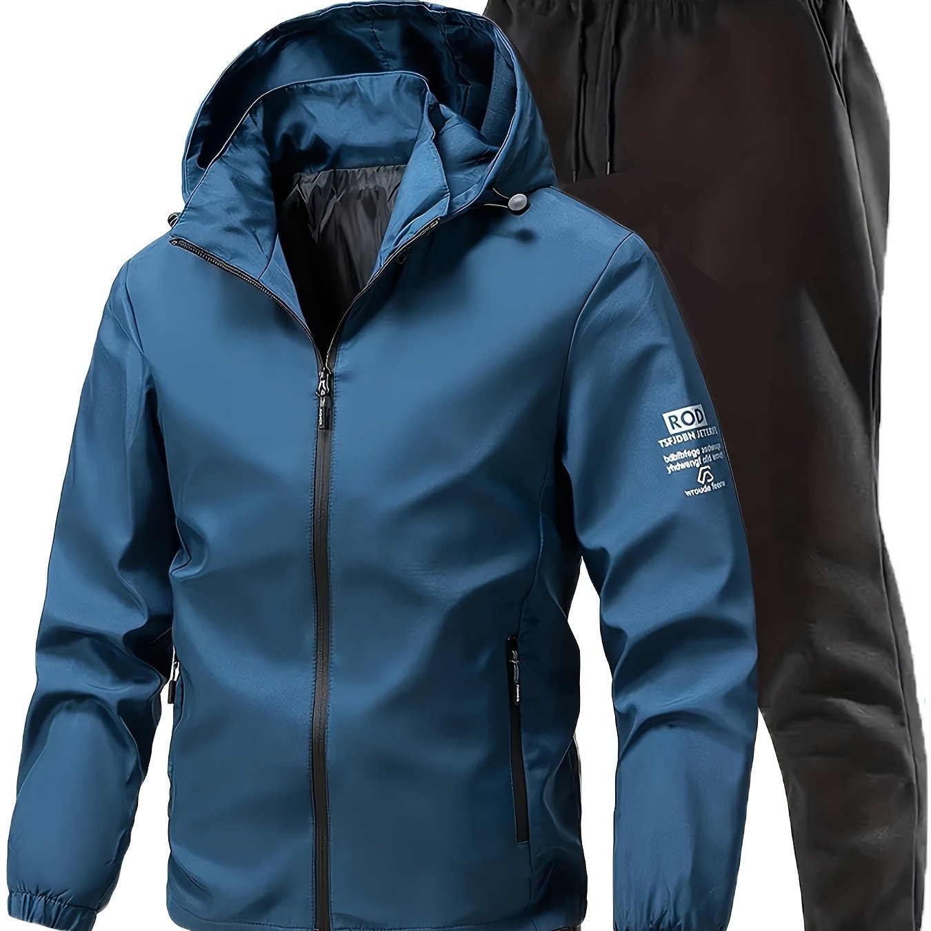 2pcs Men's Sporty Casual Jacket and Stretch Jogger Set, Spring/Autumn Fashion Hooded Jacket with Zipper Pockets, Windproof Outerwear and Black Stretch Joggers, Perfect for Outdoor Activities and Leisure Wear