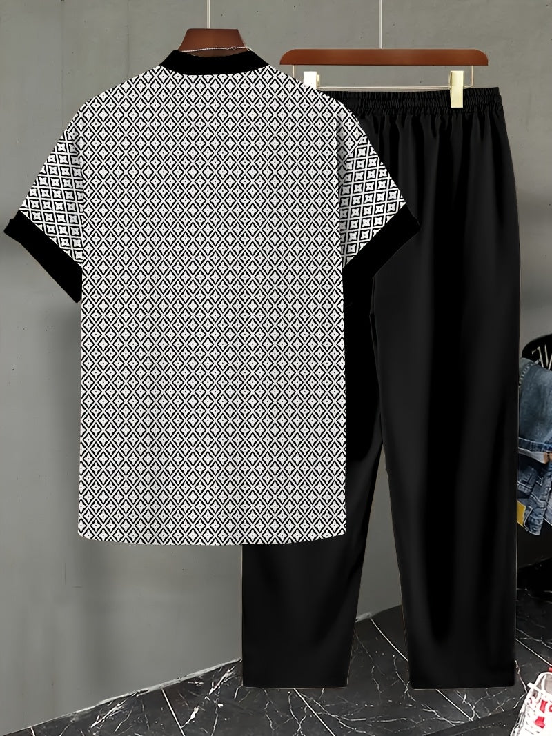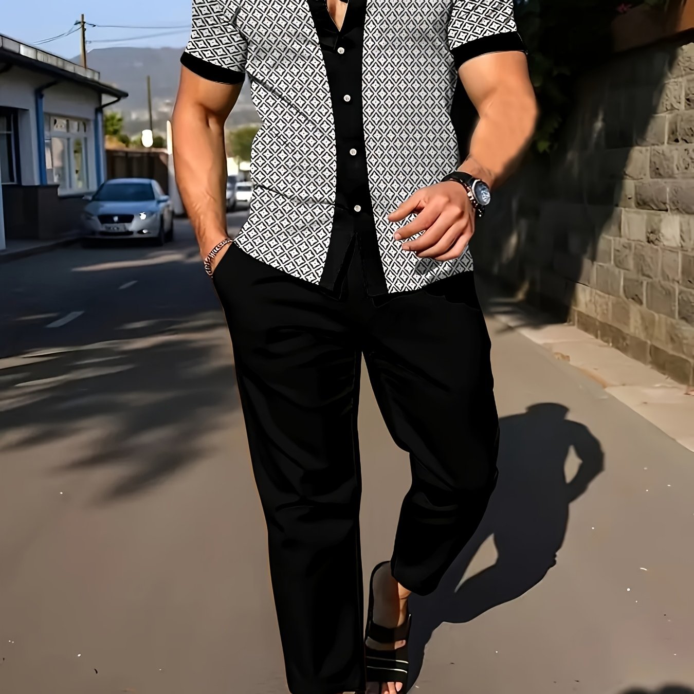 2pcs printed Men's summer short-sleeved button-up shirt and trousers suit