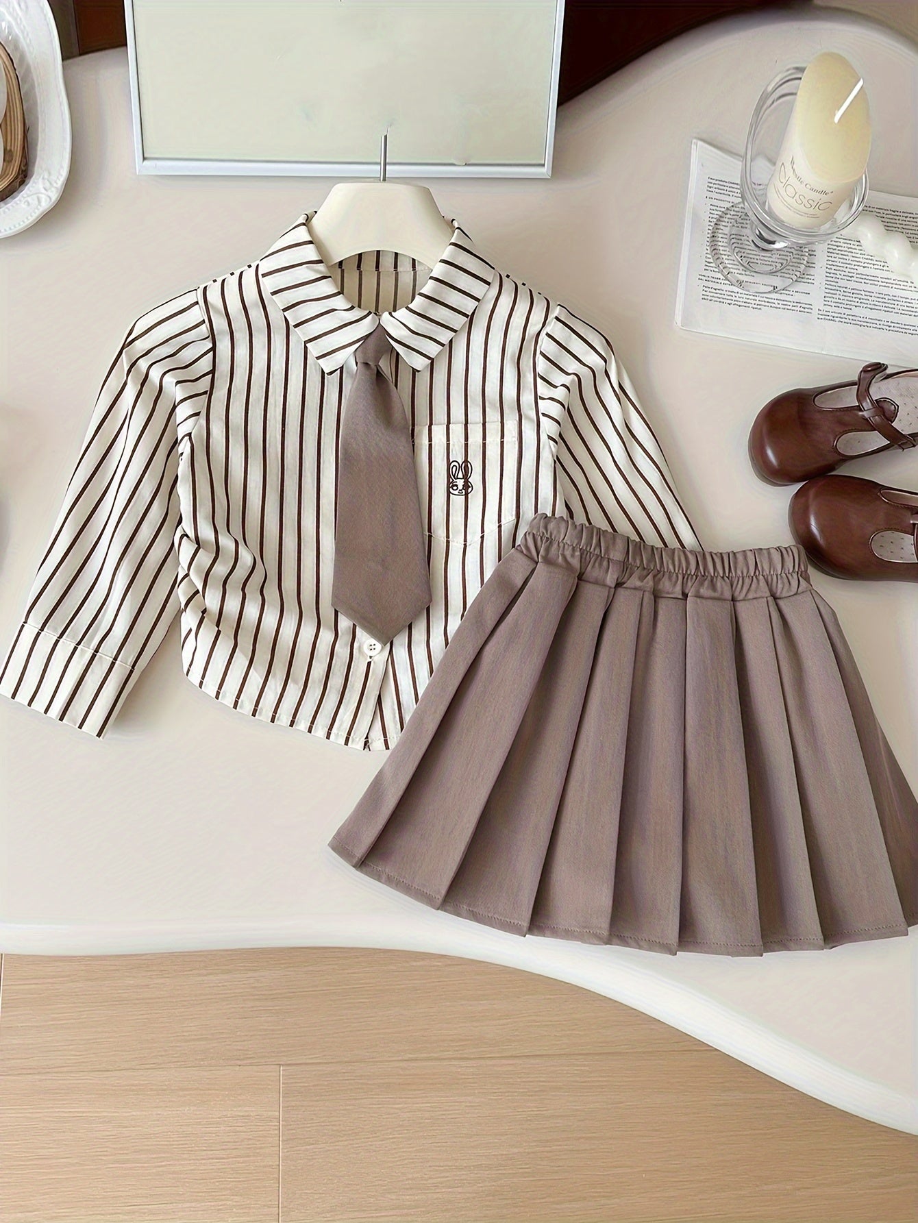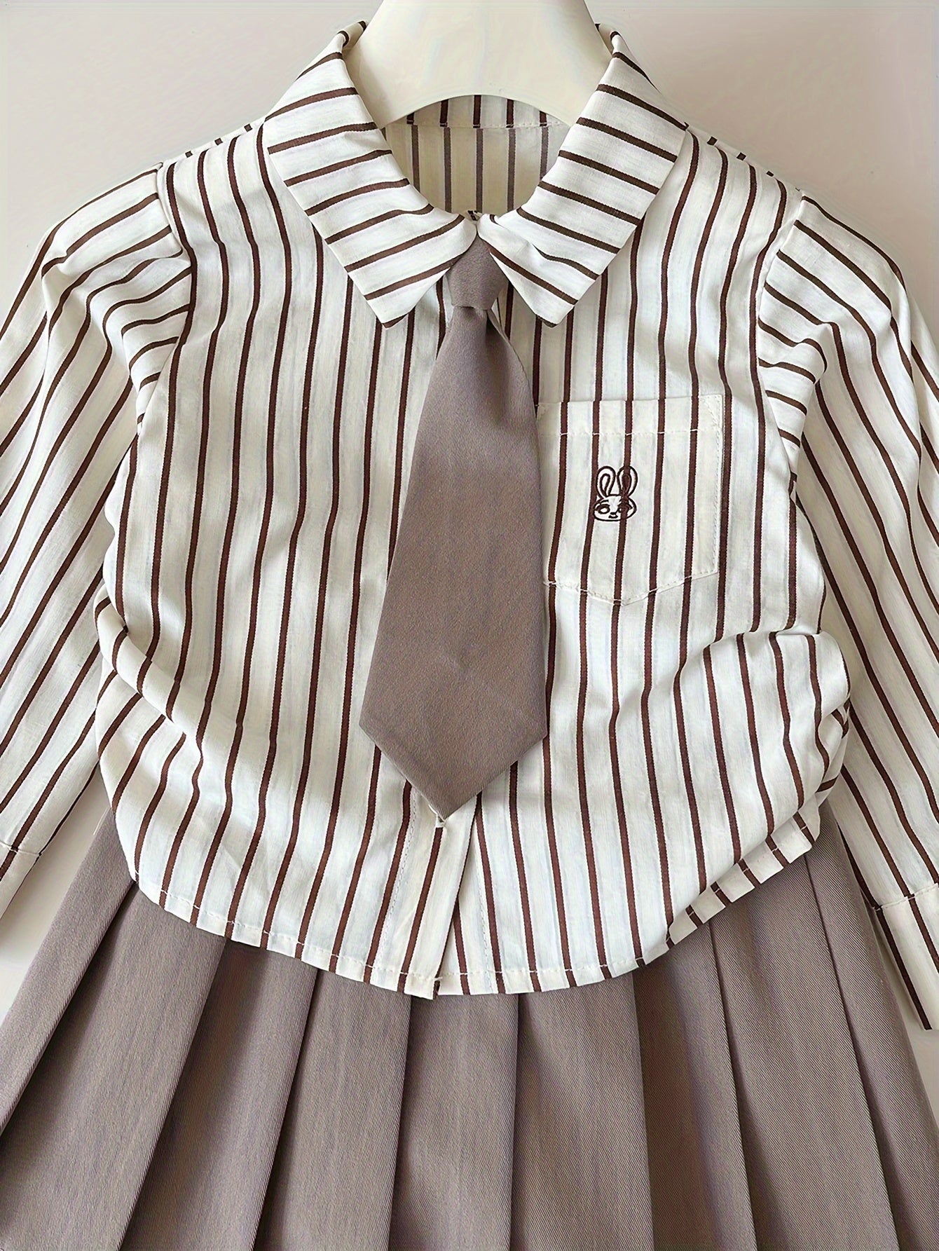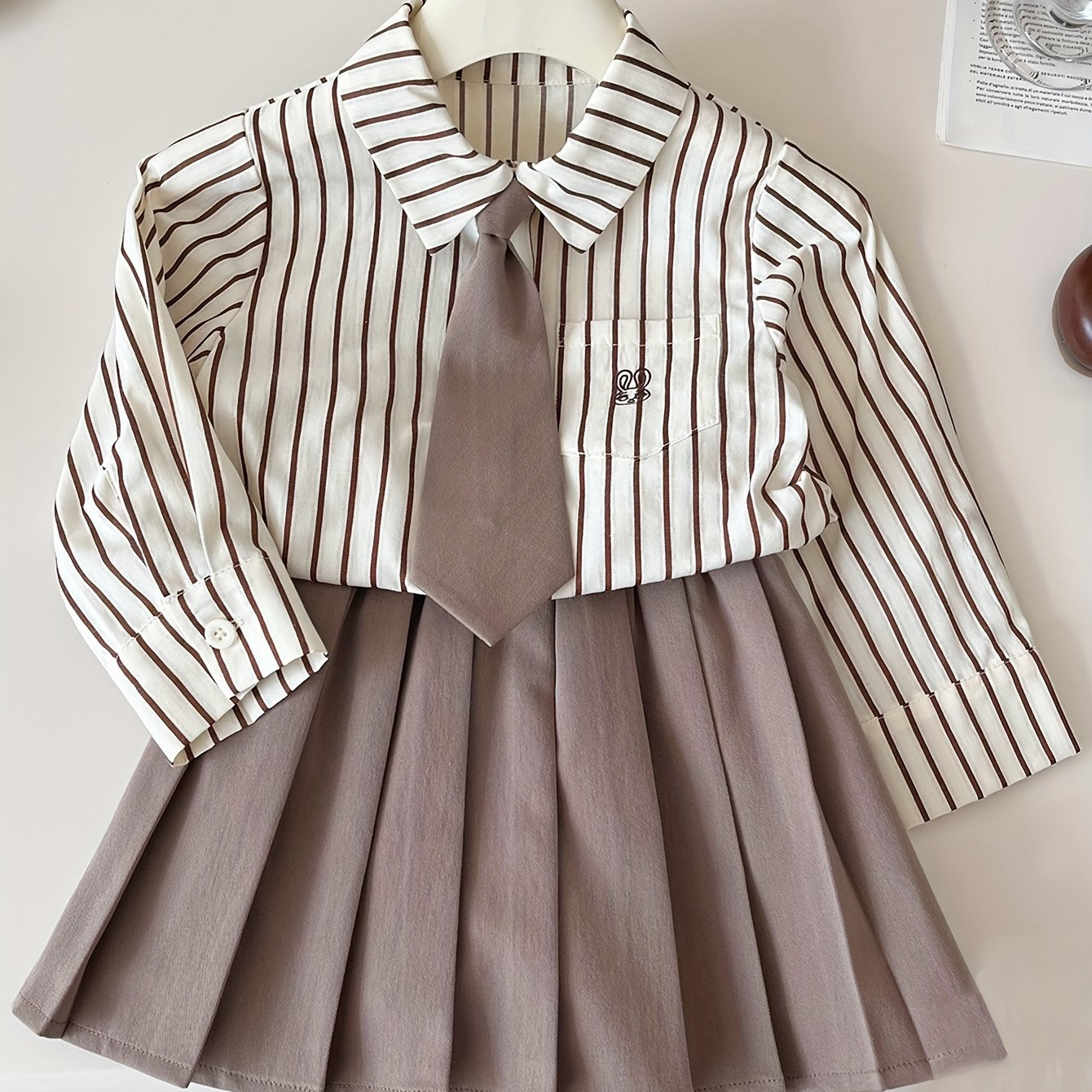 2 հատ Քաղցր աղջկա կոստյում փողկապի օձիքով երկարաթև բամբակյա վերնաշապիկ + պինդ ծալքավոր կիսաշրջազգեստի հավաքածու - գարնանային և աշնանային բացօթյա հագուստ Preppy ոճի աղջիկների հանդերձանք