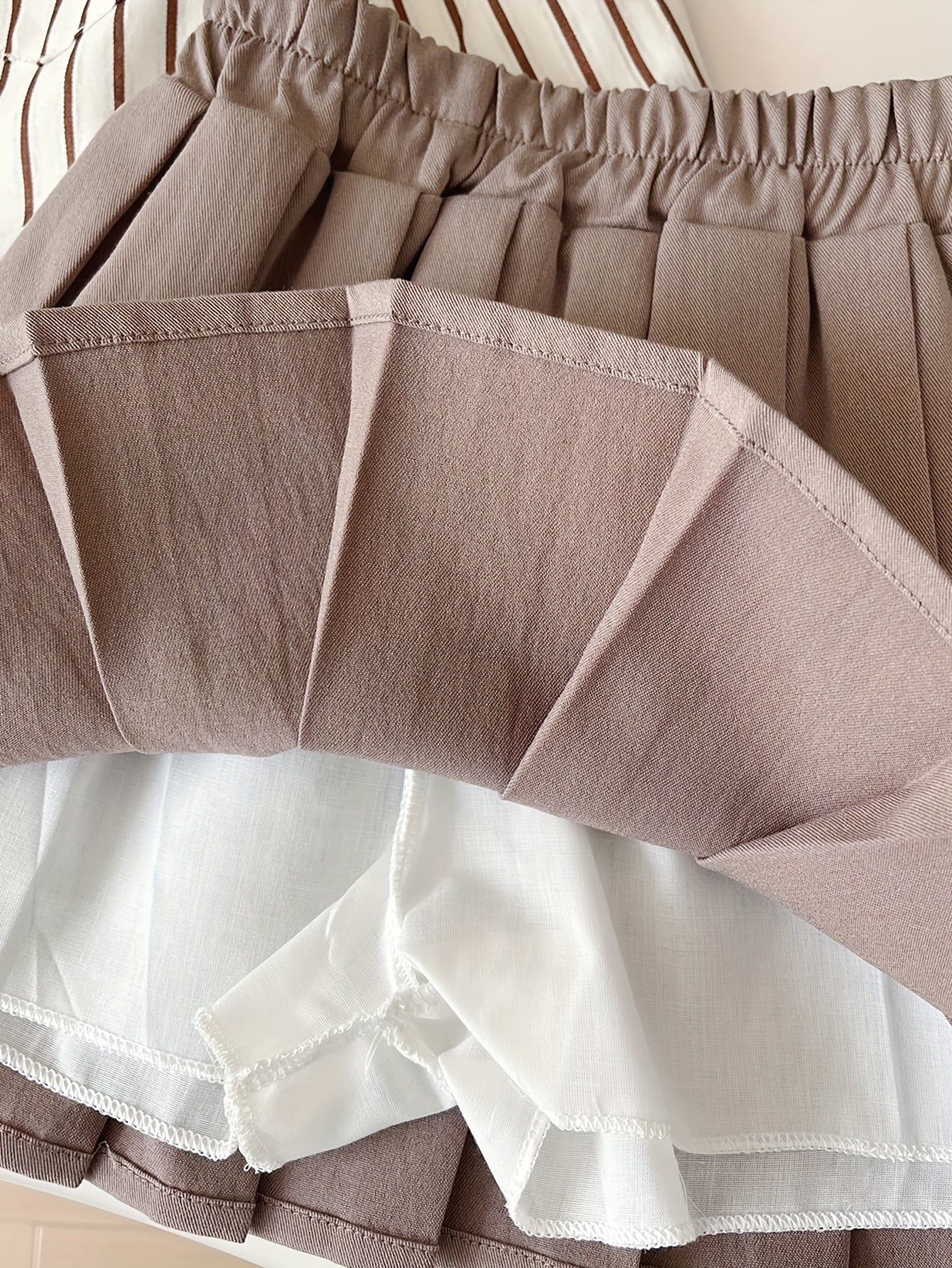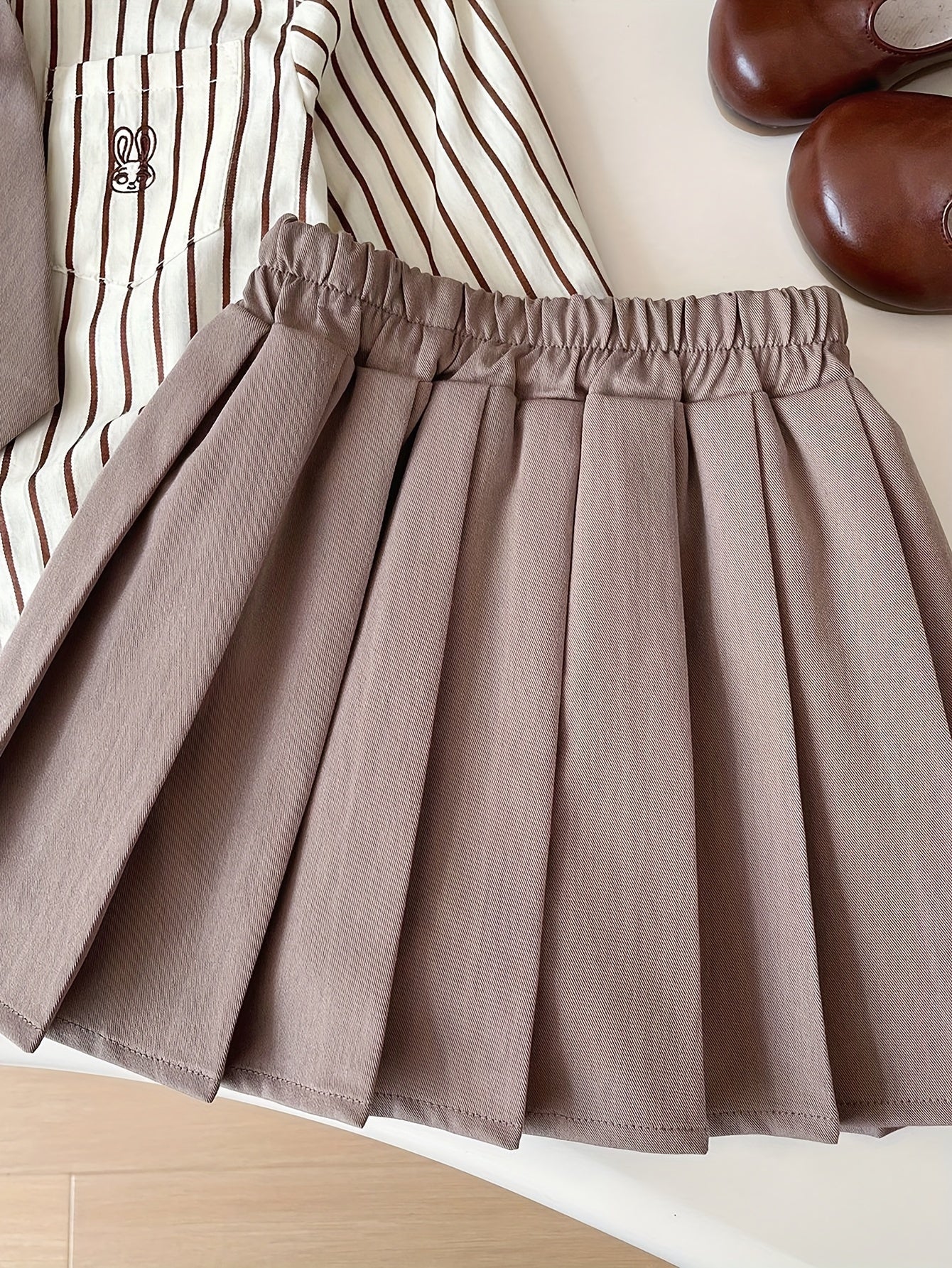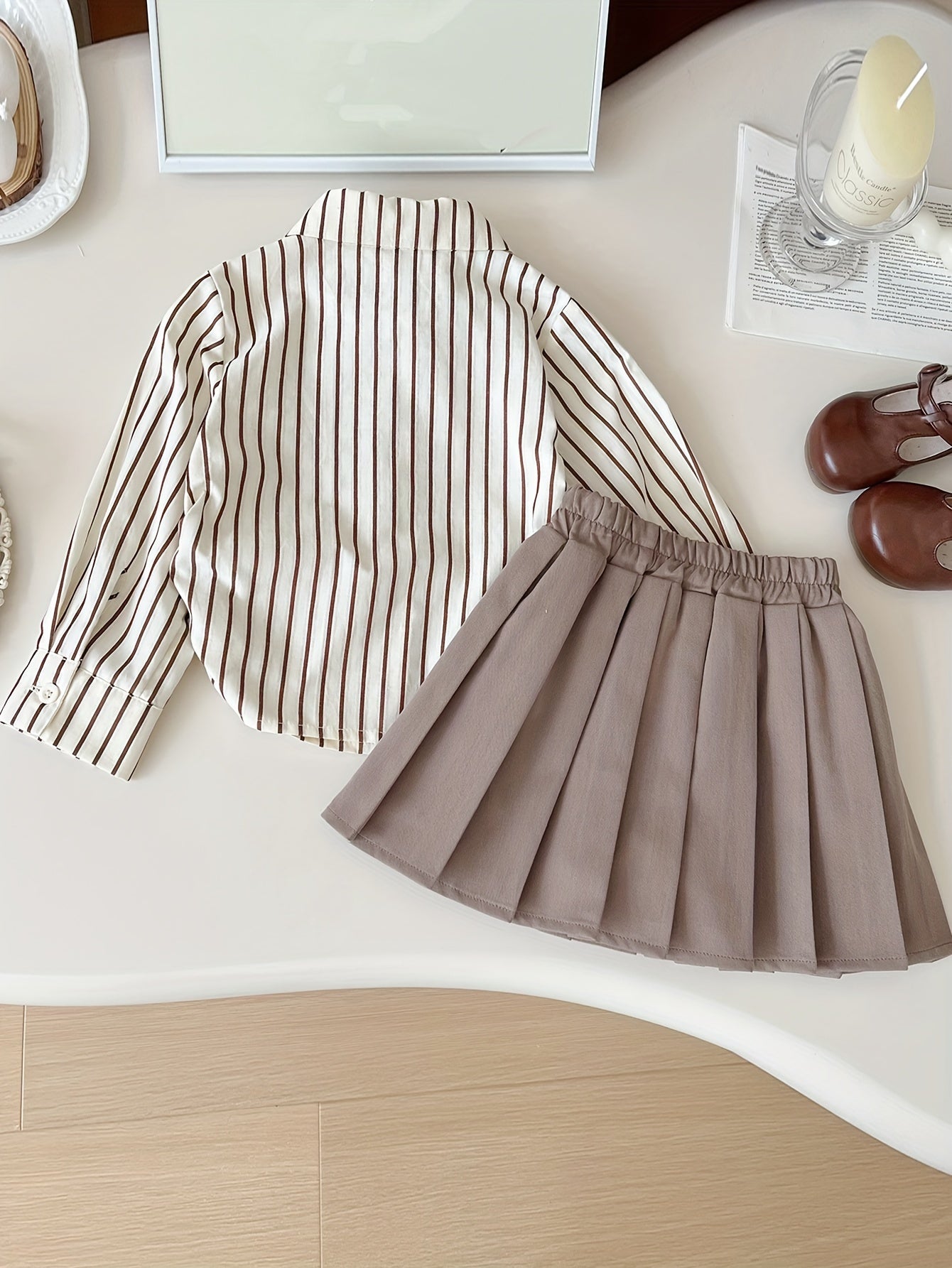 2 հատ Քաղցր աղջկա կոստյում փողկապի օձիքով երկարաթև բամբակյա վերնաշապիկ + պինդ ծալքավոր կիսաշրջազգեստի հավաքածու - գարնանային և աշնանային բացօթյա հագուստ Preppy ոճի աղջիկների հանդերձանք