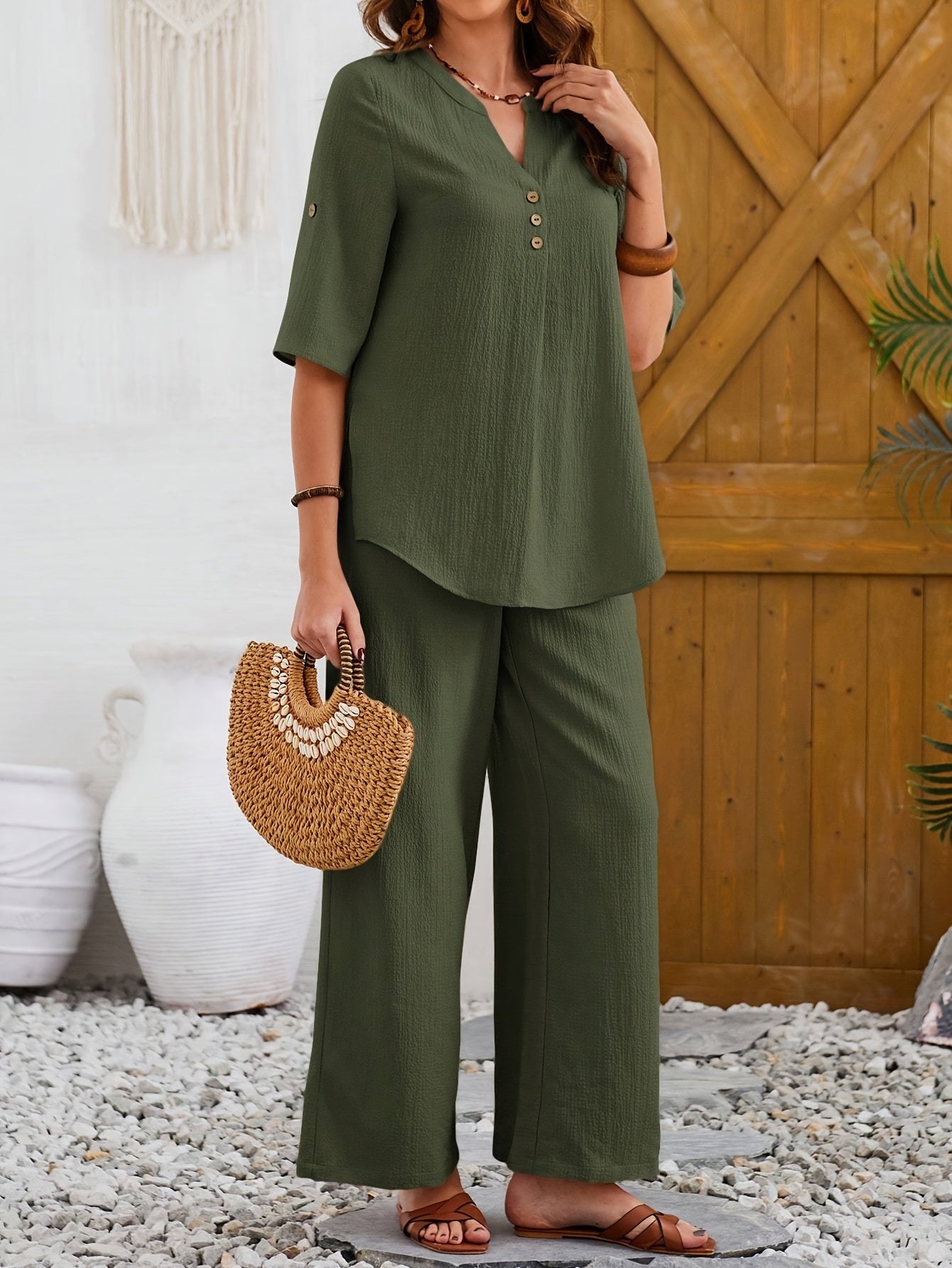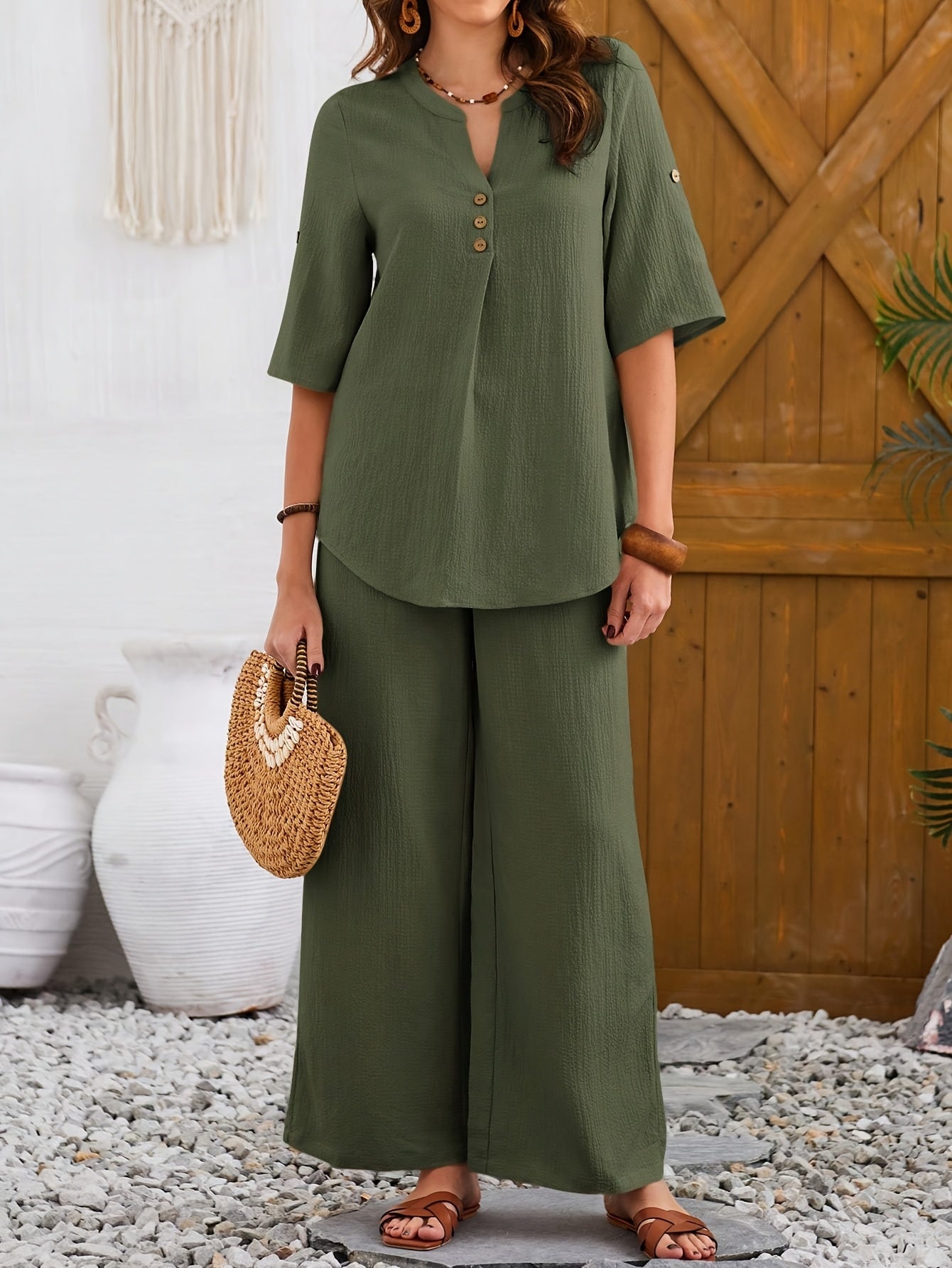 2 հատ կանացի ձիթապտղի կանաչ կարճ թևքերով և լայն տաբատով հավաքածու - Էլեգանտ կոճակներով բլուզ՝ գրպաններով, բարձր իրանով կոմբինեզոն՝ գարուն/ամառ/աշուն, բազմակողմանի հանդերձանք | կոճակներով բլուզ | հյուսվածք