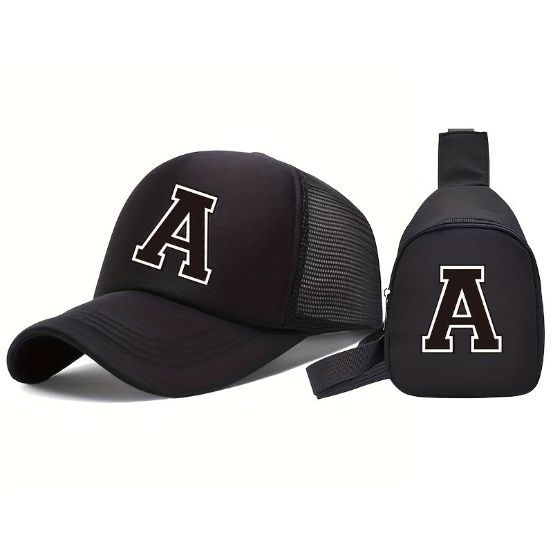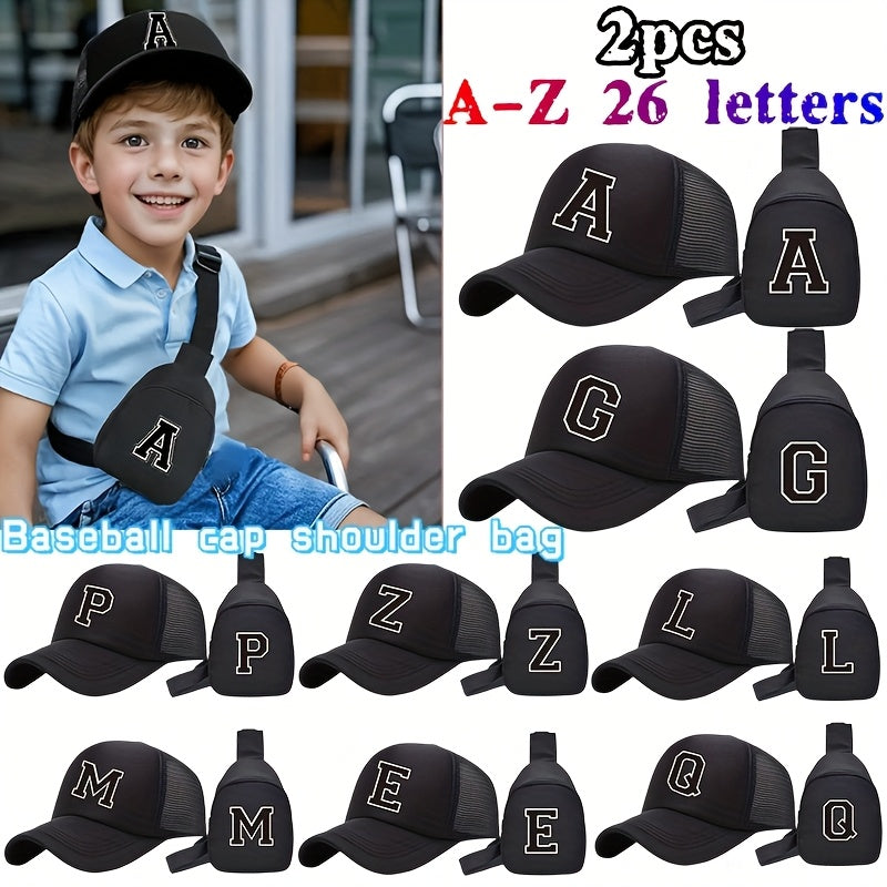 2 հատ մանկական 26 տառանոց տպագրությամբ գլխարկի և կրծքավանդակի պայուսակի հավաքածու, նորաձև արևային գլխարկ՝ դյուրակիր պահեստային դրամապանակով, հարմար է տղաների, աղջիկների, գարուն-ամառ ամենօրյա զբոսանքների համար, կատարյալ նվեր դպրոց վերադառնալու սեզոնի համար