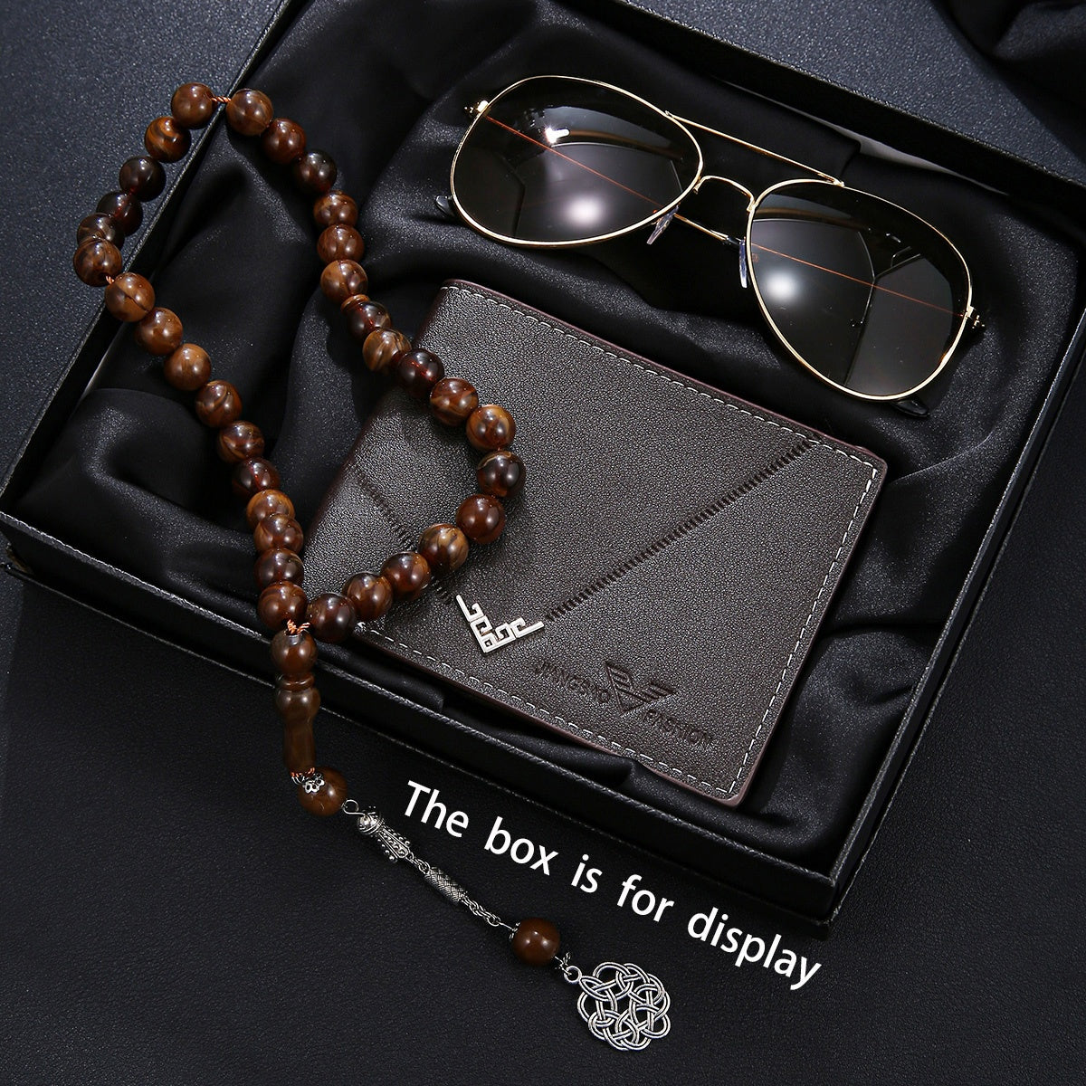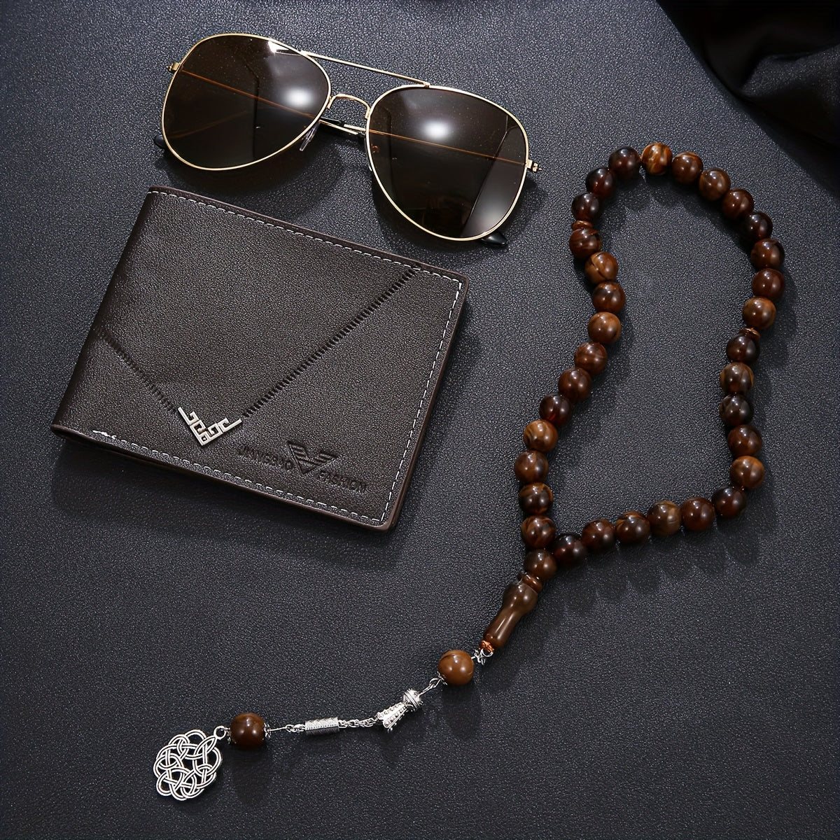 3pcs Men's Business Premium Gift Set: A professional wallet exudes sophistication, agarwood beads enhance workplace wisdom, and high-definition glasses ensure clear vision. The complete set showcases elegance for business gif