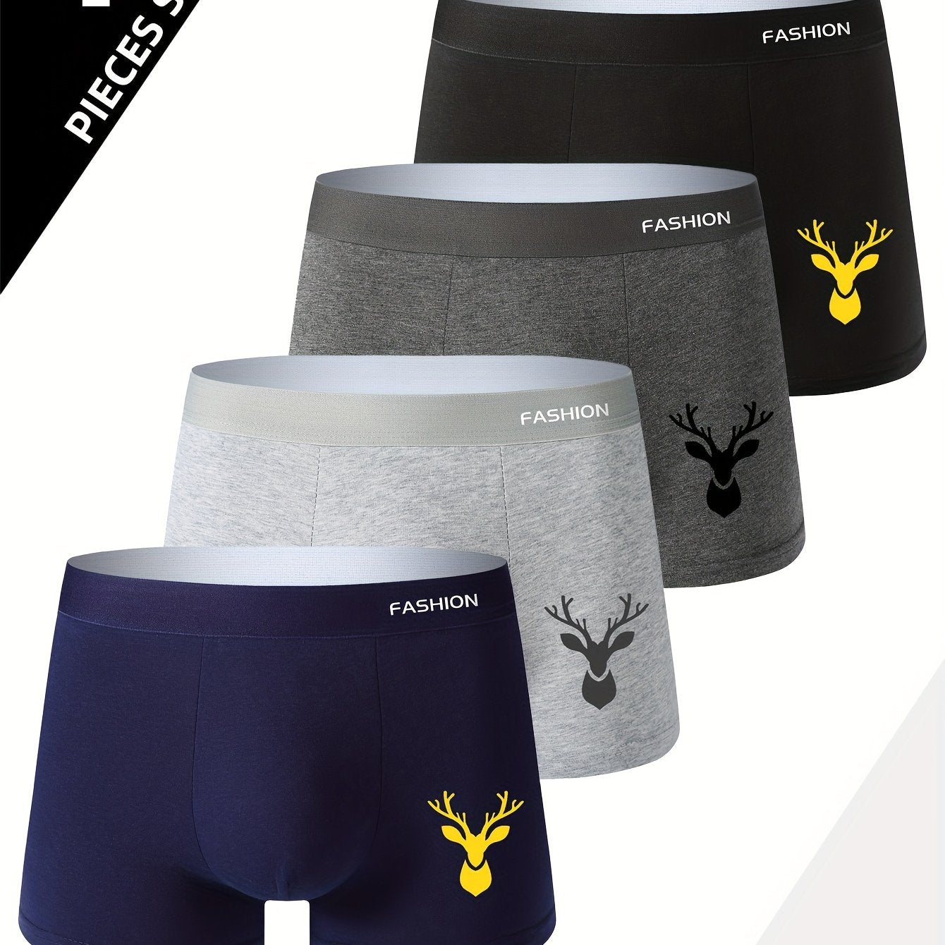 4 հատ Տղամարդկանց ներքնազգեստի հավաքածու Breathable and Soft Four Seasons Comfort Տղամարդկանց շորտեր Թրենդային դասական պարզ կենդանական տպագրությամբ հարթ անկյունային շորտեր