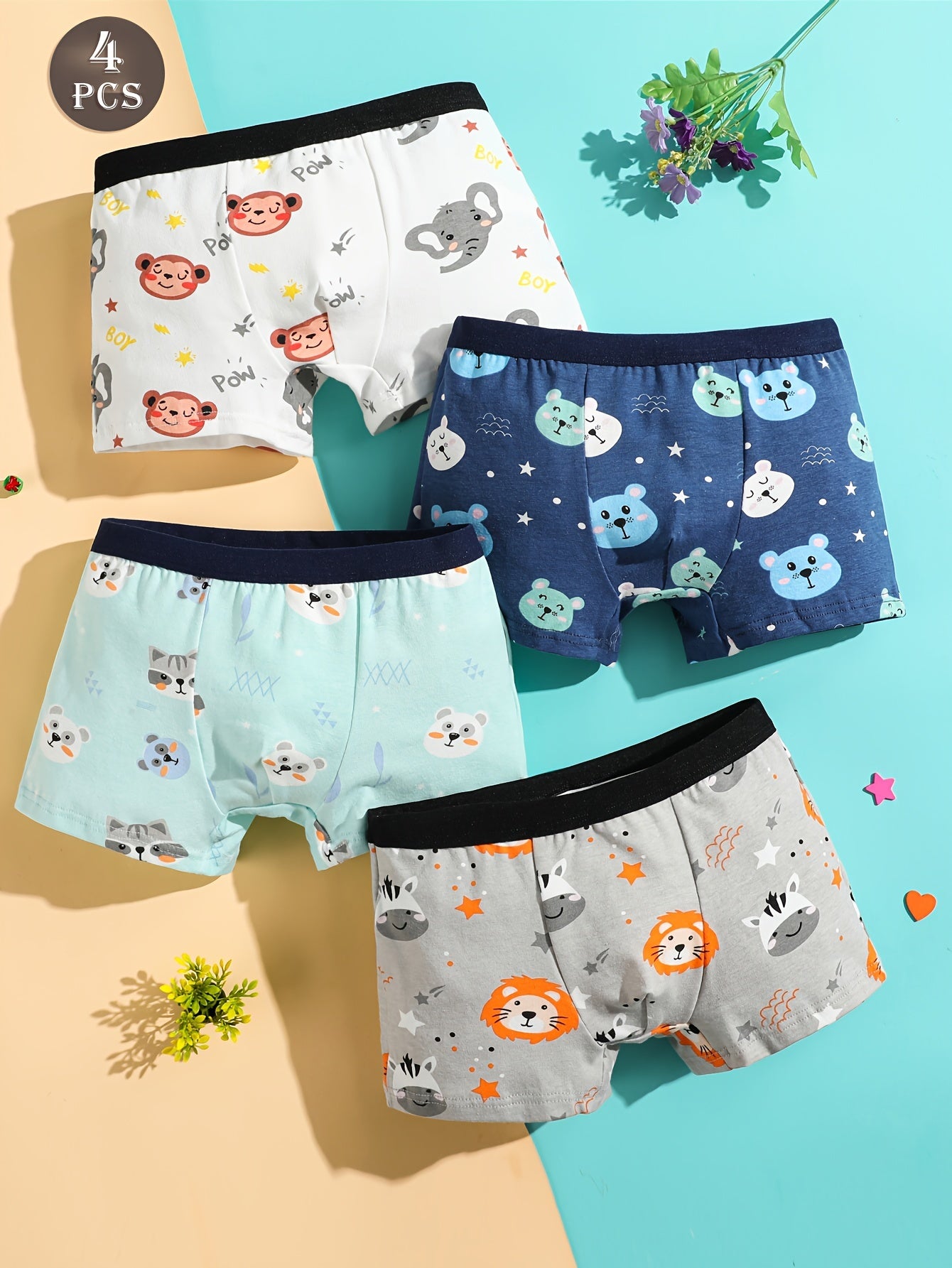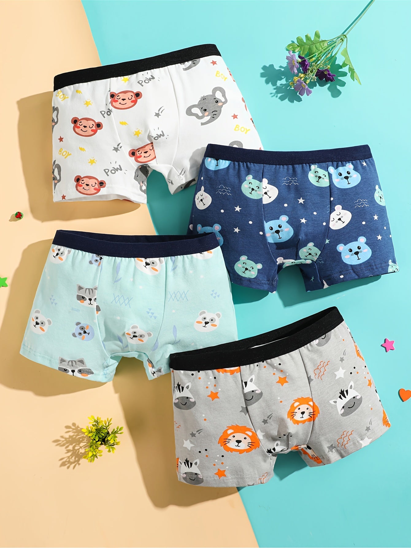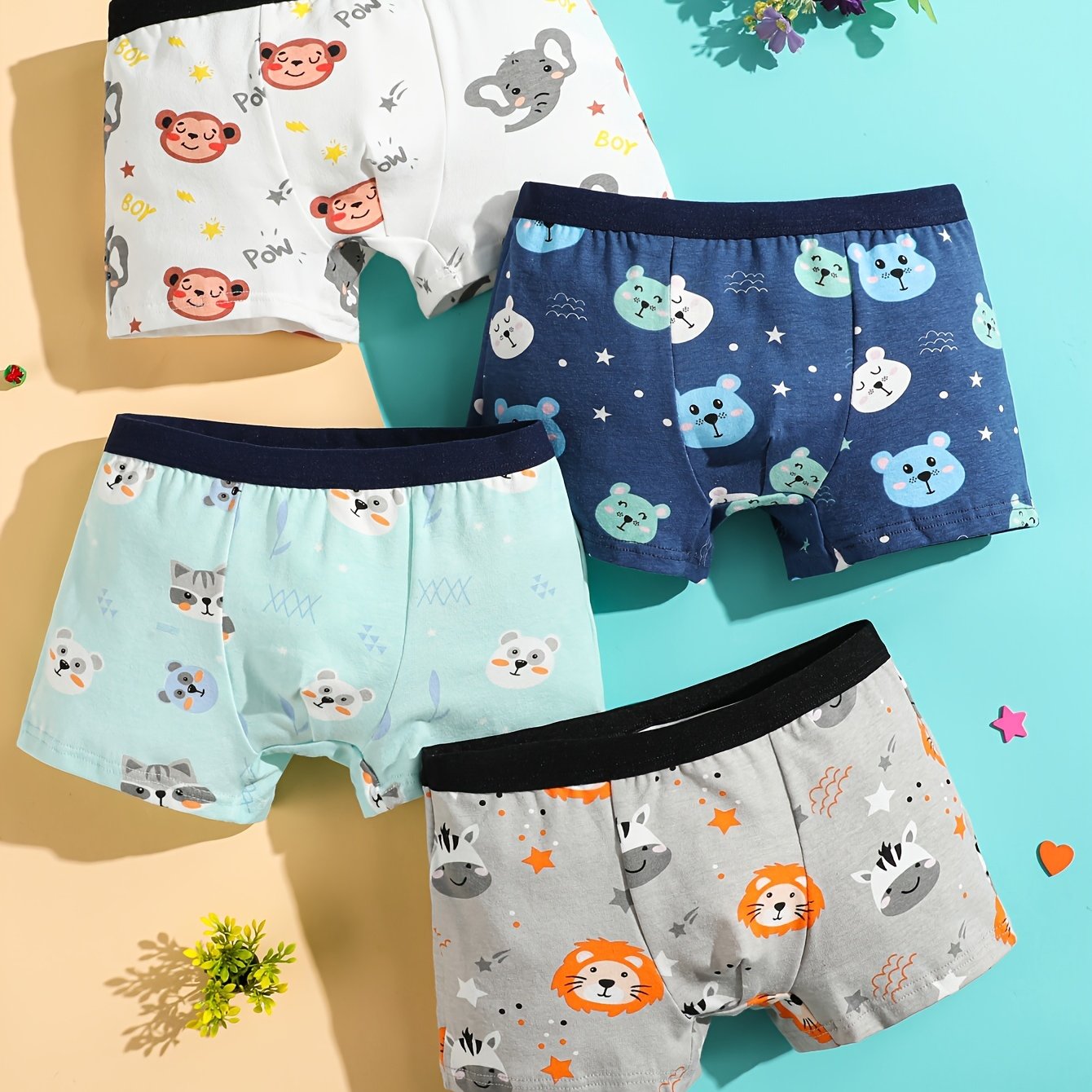 4 հատ Փափուկ բամբակյա տղաների բռնցքամարտիկ շապիկներ՝ գեղեցիկ կենդանիների տպագրությամբ. Հարմարավետ և շնչող ներքնազգեստ երիտասարդների համար