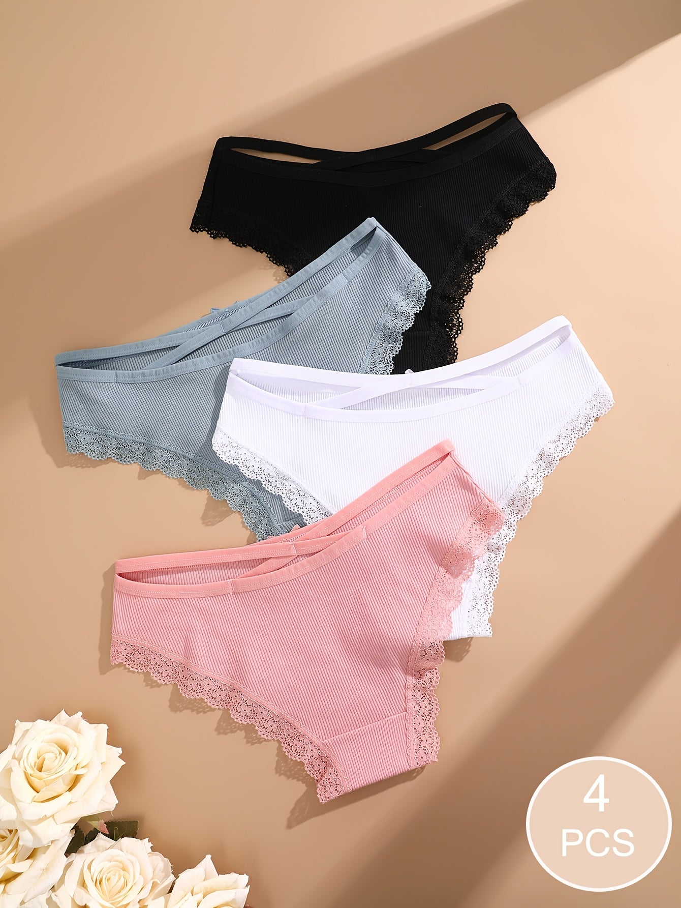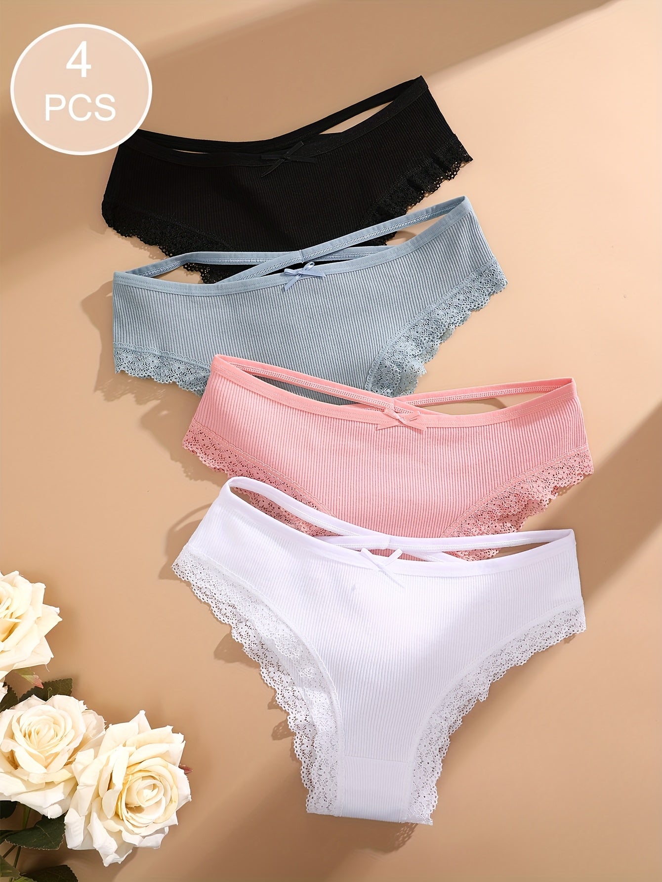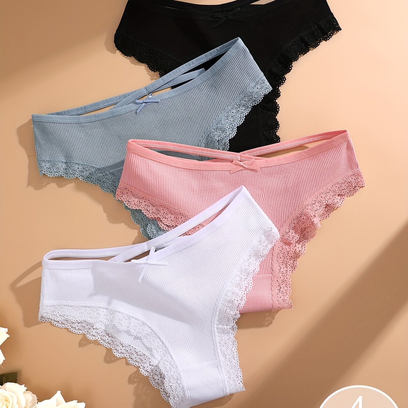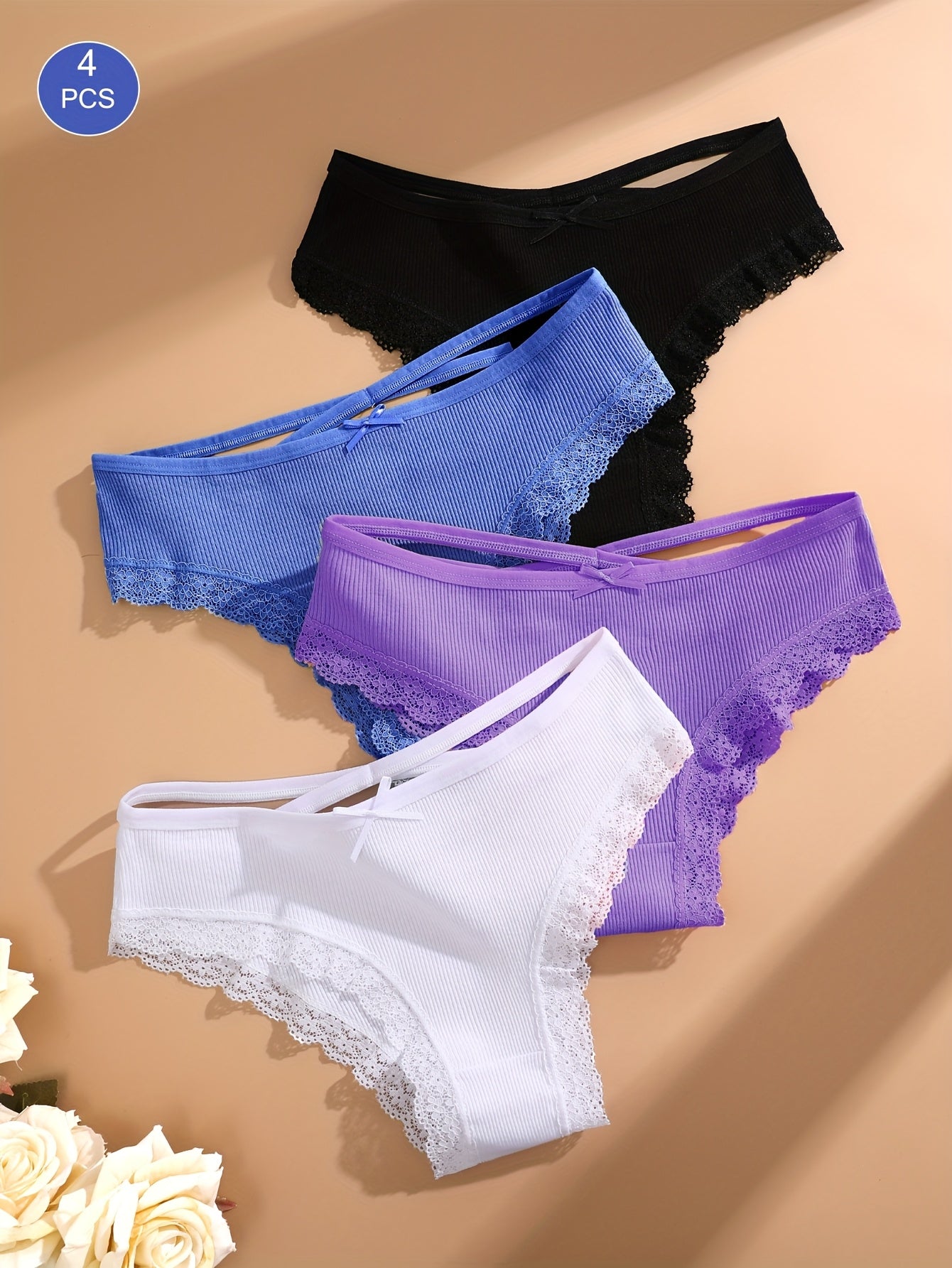 4 հատ Կանացի ժանյակավոր վարտիք - սեքսուալ միաձույլ վարտիք կոնտրաստային դետալներով, տրիկոտաժե գործվածք, 180գ/մ² Քաշ, Կանացի ներքնազգեստ|Նրբագեղ ներքնազգեստ|Հարմարավետ տեղավորում