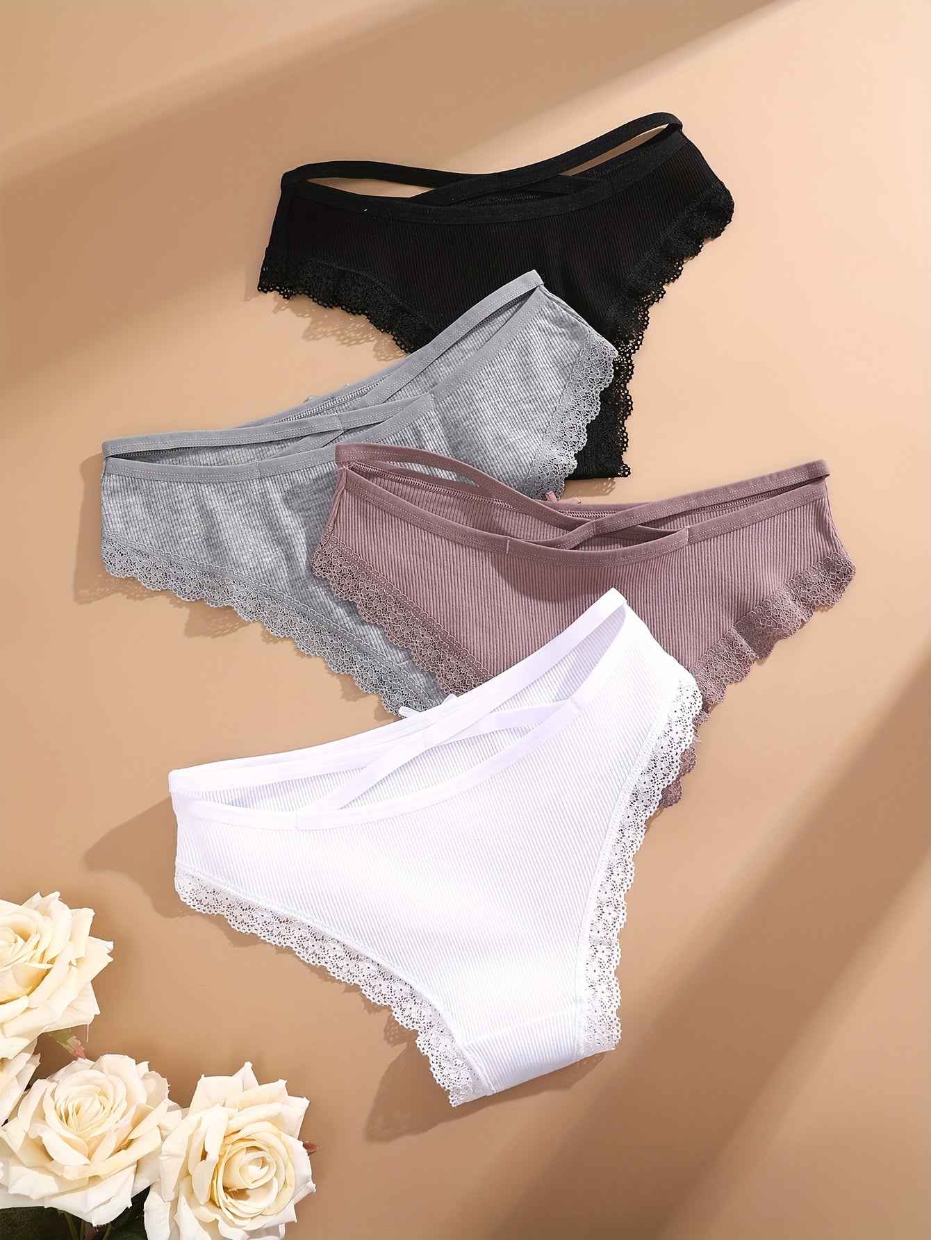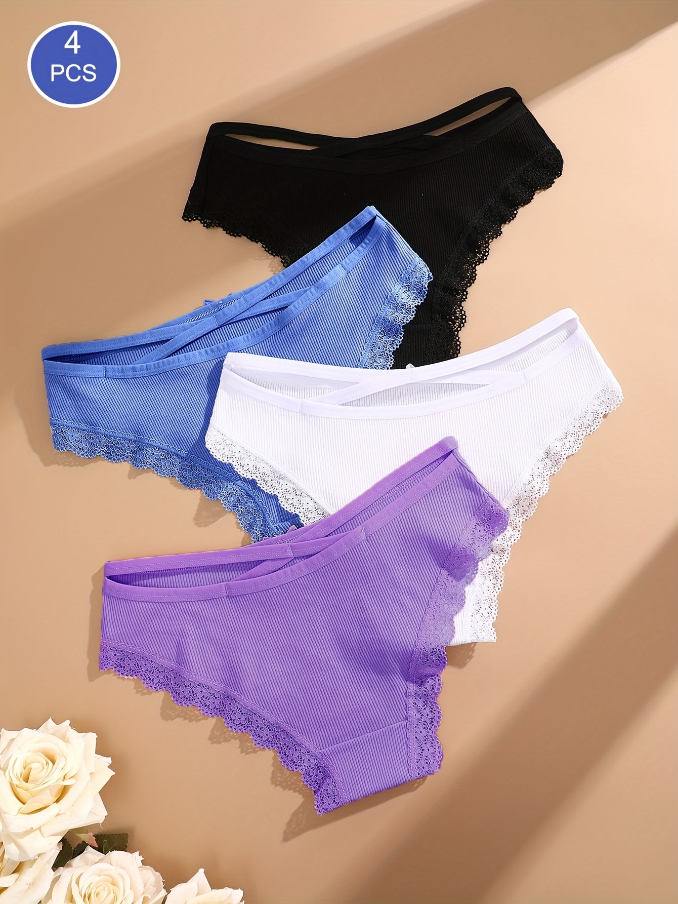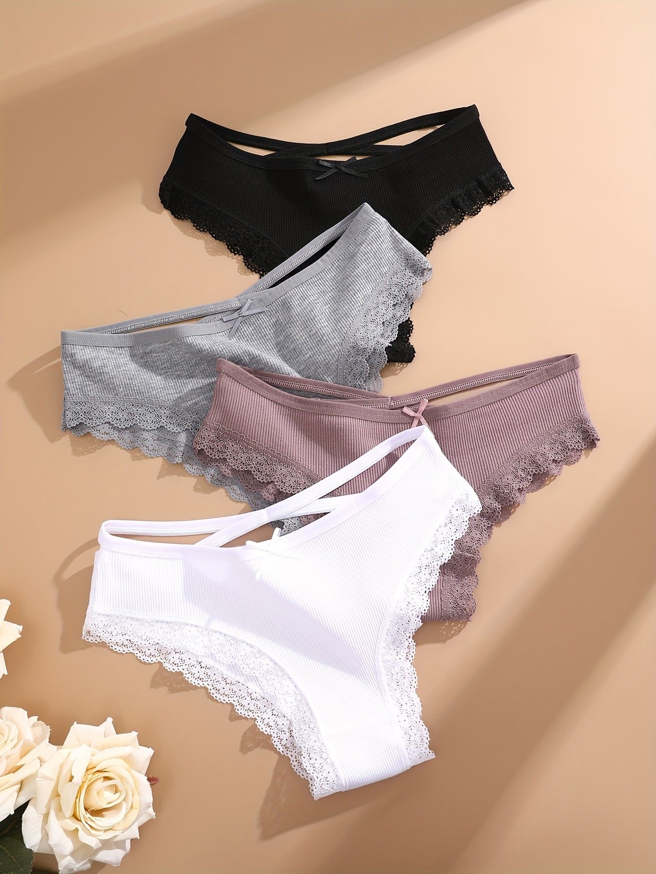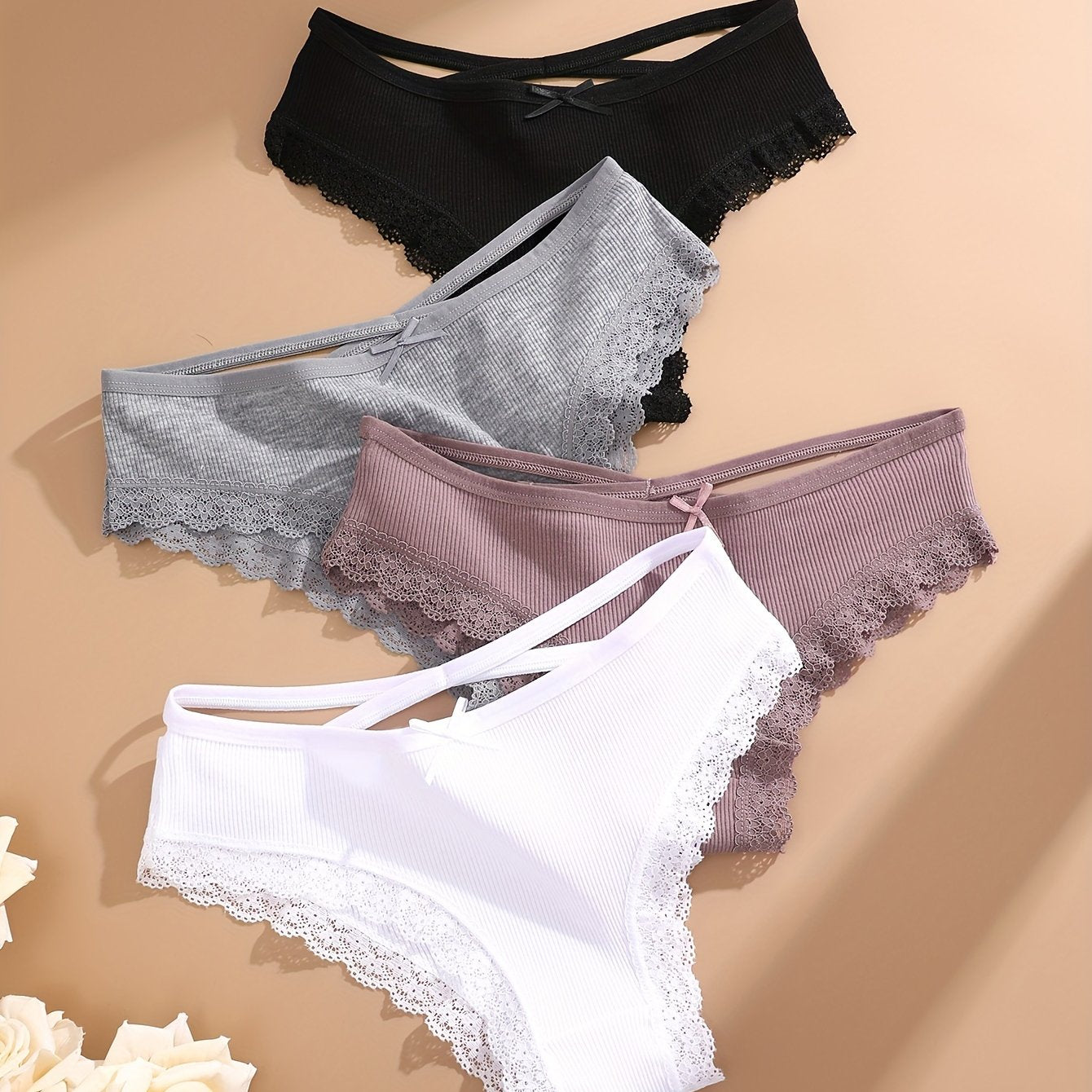 4 հատ Կանացի ժանյակավոր վարտիք - սեքսուալ միաձույլ վարտիք կոնտրաստային դետալներով, տրիկոտաժե գործվածք, 180գ/մ² Քաշ, Կանացի ներքնազգեստ|Նրբագեղ ներքնազգեստ|Հարմարավետ տեղավորում