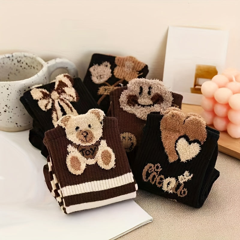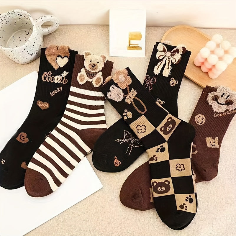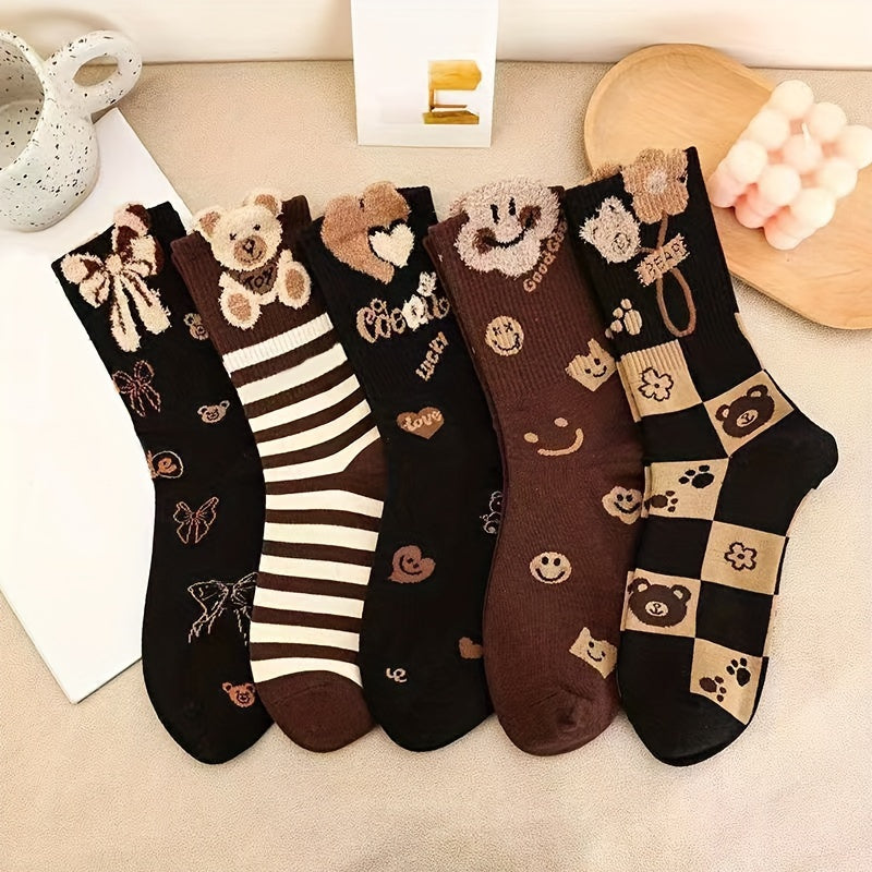 5 զույգ կանացի միջին հորթի գուլպաներ, պոլիեսթեր 95% սպանդեքս 5% տրիկոտաժե գործվածք, թիթեռի ձևանմուշ արջուկով, սրտով և աղեղով դիզայն, լվացվող մեքենայում, 300գ/մ² Քաշ